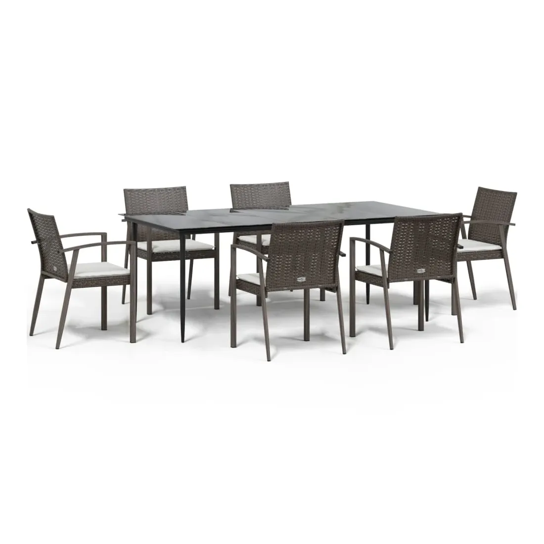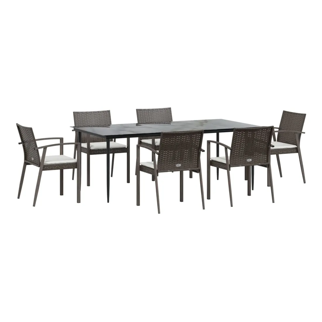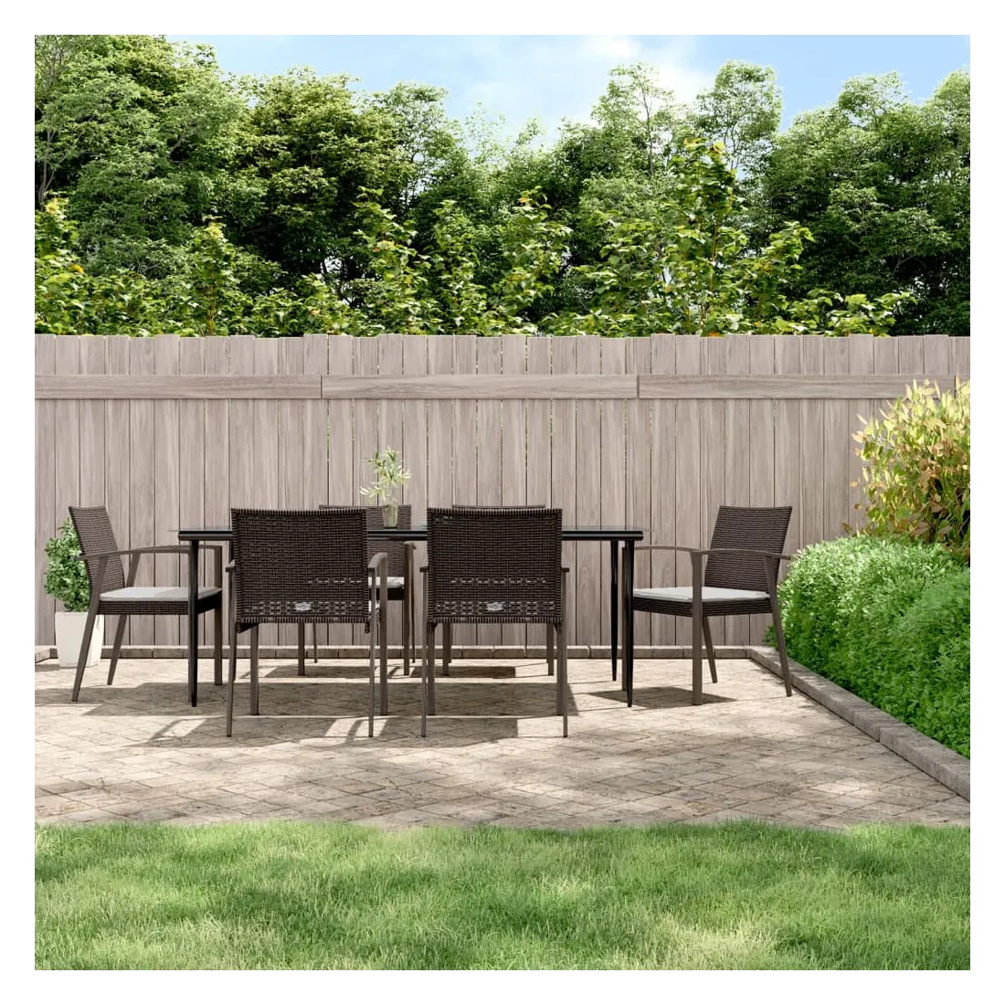Cet ensemble à manger de jardin, combinant à la fois style et fonctionnalité, est sûrement destiné à être la pièce maîtresse de votre jardin, terrasse et de tout autre espace de vie. Matériau résistant aux intempéries : la résine tressée, également connue sous le nom de rotin poly, résiste aux intempéries et est facile à nettoyer. Elle reste belle à l'extérieur pendant une longue période. Elle offre une excellente qualité, commodité et un aspect esthétique.Cadre robuste et stable : les cadres en acier rendent l'ensemble à manger robuste et stable pour une utilisation quotidienne à l'extérieur.Dessus de table pratique : le plateau lisse de la table à manger est en verre trempé facile à nettoyer avec un chiffon humide. De plus, il offre un excellent support pour contenir vos repas, boissons et autres objets décoratifs.Assise confortable : la chaise de salle à manger est conçue avec des accoudoirs pour vous offrir une expérience d'assise confortable. Le coussin de siège épais et rembourré offre un confort ultime pendant votre temps d'assise. Remarque :Pour que vos meubles d'extérieur restent beaux, nous vous recommandons de les protéger avec une housse imperméable.