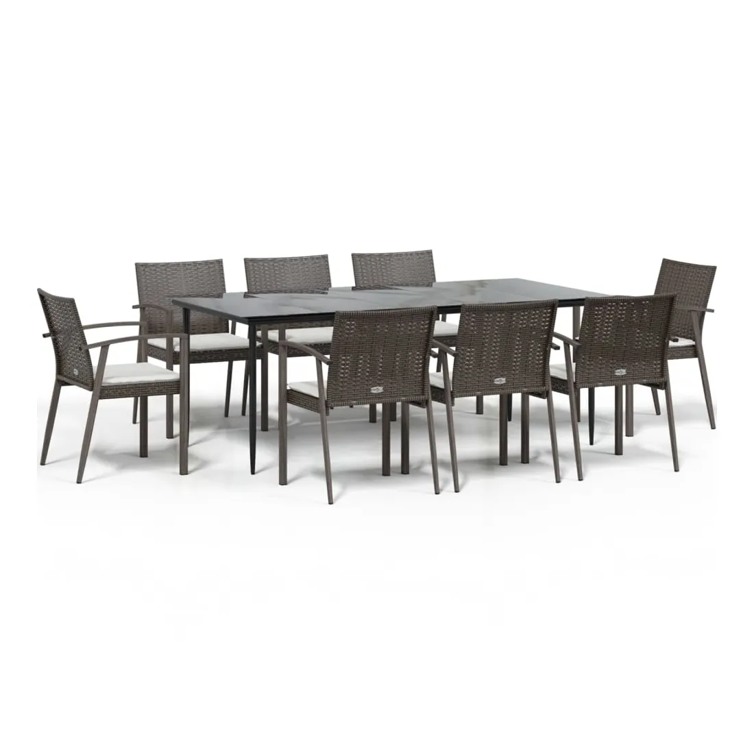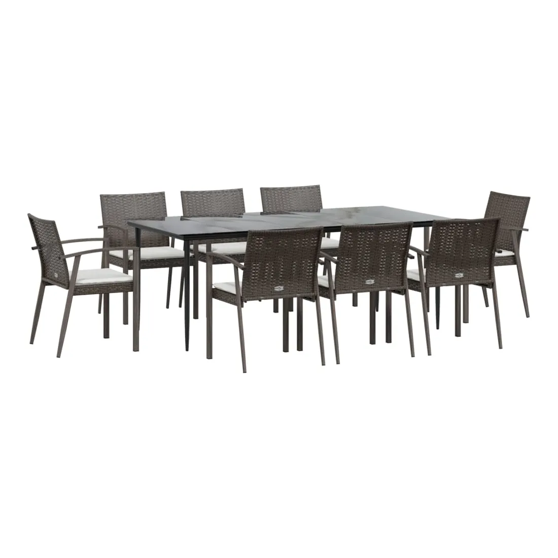 Cet ensemble à manger de jardin, combinant à la fois style et fonctionnalité, est sûrement destiné à être la pièce maîtresse de votre jardin, terrasse et de tout autre espace de vie. Matériau résistant aux intempéries : la résine tressée, également connue sous le nom de rotin poly, résiste aux intempéries et est facile à nettoyer. Elle reste belle à l'extérieur pendant une longue période. Elle offre une excellente qualité, commodité et un aspect esthétique.Cadre robuste et stable : les cadres en acier rendent l'ensemble à manger robuste et stable pour une utilisation quotidienne à l'extérieur.Dessus de table pratique : le plateau lisse de la table à manger est en verre trempé facile à nettoyer avec un chiffon humide. De plus, il offre un excellent support pour contenir vos repas, boissons et autres objets décoratifs.Assise confortable : la chaise de salle à manger est conçue avec des accoudoirs pour vous offrir une expérience d'assise confortable. Le coussin de siège épais et rembourré offre un confort ultime pendant votre temps d'assise. Remarque :Pour que vos meubles d'extérieur restent beaux, nous vous recommandons de les protéger avec une housse imperméable.