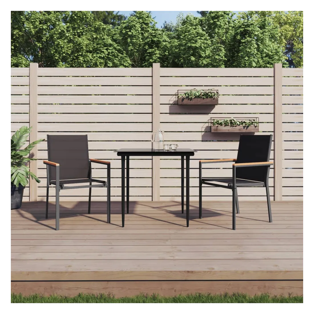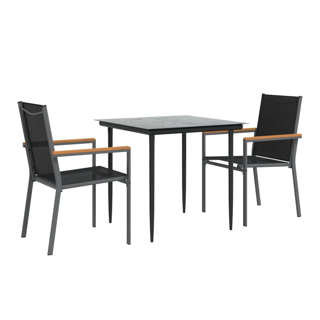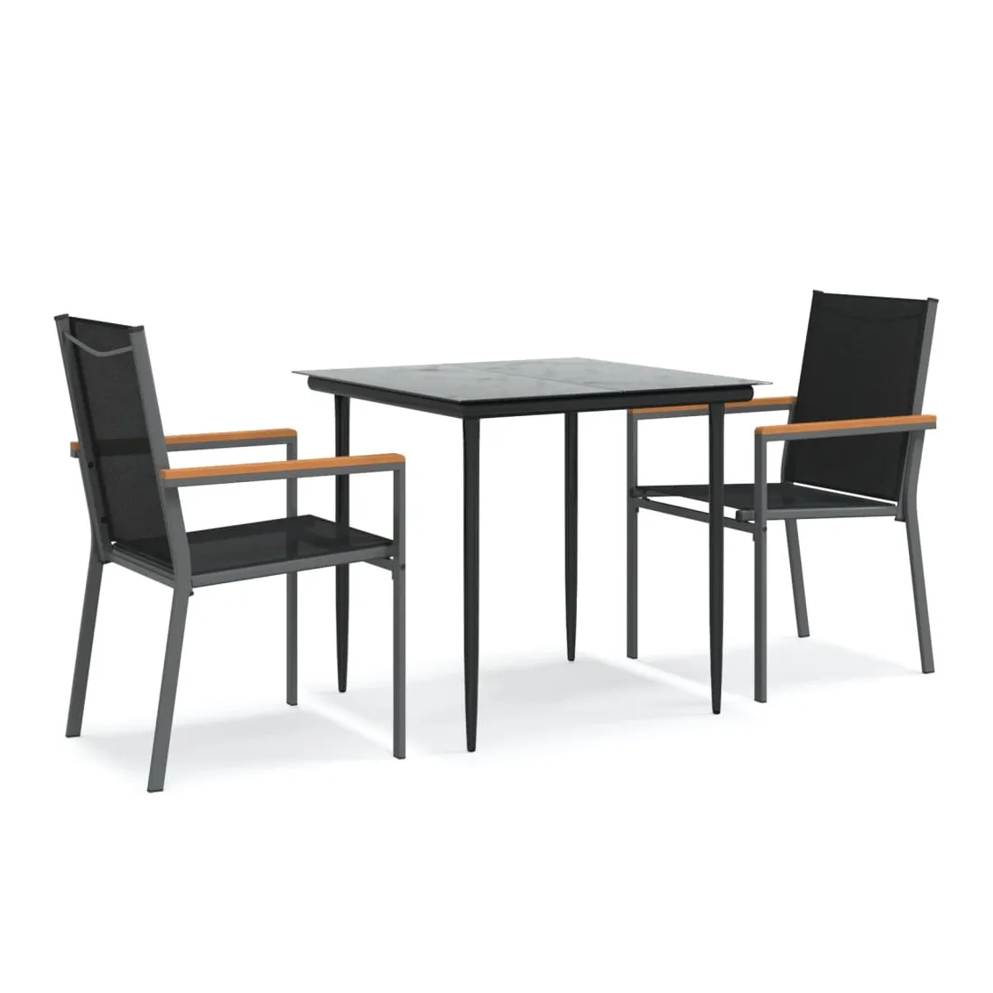 Détendez-vous et profitez d'un bon thé de l'après-midi ou de n'importe quel repas avec votre famille et vos amis autour de cet ensemble de salle à manger de jardin ! Matériau durable : le tissu en textilène permet à l'air de circuler librement à travers lui tout en étant résistant aux rayons UV. Le textilène est donc idéal pour les temps chauds. En tant que matériau durable et solide, il est très résistant aux déchirures, aux perforations et aux moisissures.Cadre robuste et stable : les cadres en acier rendent l'ensemble à manger robuste et stable pour une utilisation quotidienne à l'extérieur.Dessus de table pratique : le plateau lisse de la table à manger est en verre trempé facile à nettoyer avec un chiffon humide. De plus, il offre un excellent support pour contenir vos repas, boissons et autres objets décoratifs.Assise confortable : la chaise à manger est conçue avec un dossier et des accoudoirs pour vous offrir une expérience d'assise confortable. Remarque :Pour que vos meubles d'extérieur restent beaux, nous vous recommandons de les protéger avec une housse imperméable.