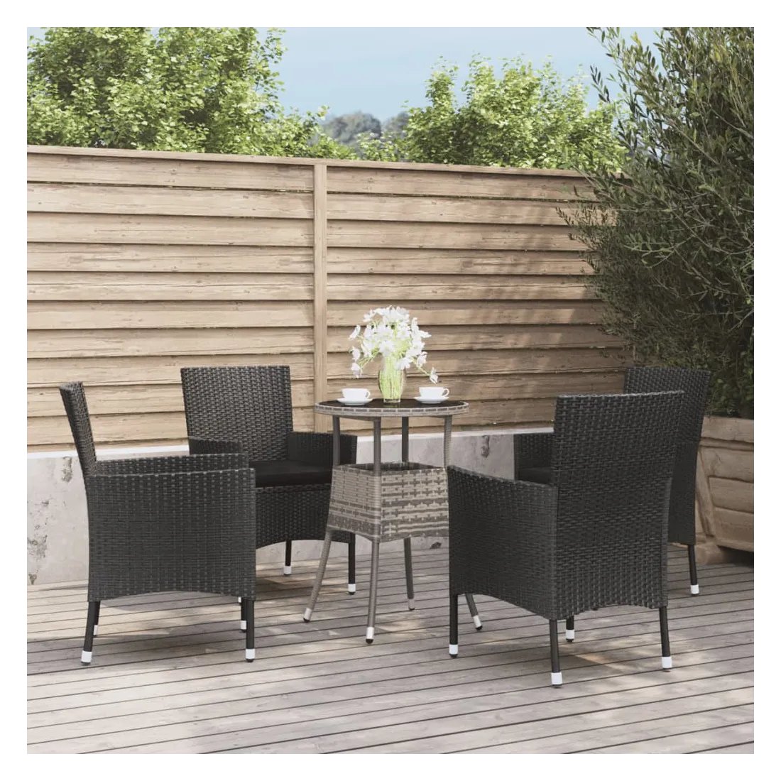 Cet ensemble élégant de bistro de jardin vous permet de passer des moments agréables et confortables avec votre famille et vos amis. Matériau durable : la résine tressée, également connue sous le nom de rotin poly, résiste aux intempéries et est facile à nettoyer. Elle reste belle à l'extérieur pendant une longue période. Elle offre une excellente qualité, commodité et un aspect esthétique. Cadre robuste et stable : le cadre en acier enduit de poudre de l'ensemble de meuble de jardin garantit la robustesse et la stabilité. Expérience d'assise confortable : conçues avec des dossiers et des accoudoirs, ces chaises de bistro de jardin offrent un maximum de confort. Les coussins bien rembourrés des chaises de bistro offrent également un confort supplémentaire lors de l'assise. Dessus de table robuste : le dessus de table robuste de la table de bistrot est parfait pour placer du café, des boissons, des vases, des bols de fruits ou d'autres objets décoratifs. Remarque :Pour que vos meubles d'extérieur restent beaux, nous vous recommandons de les protéger avec une housse imperméable.