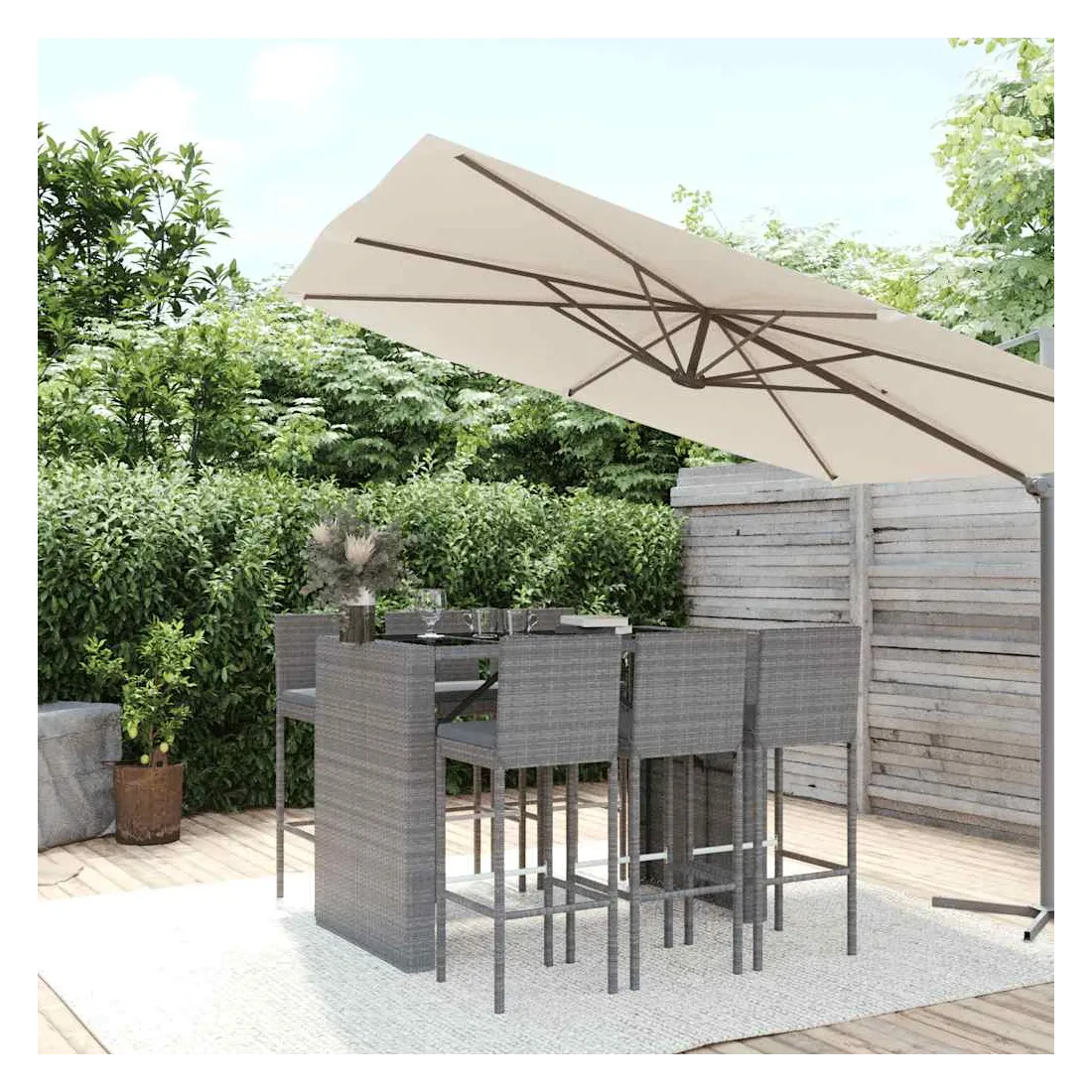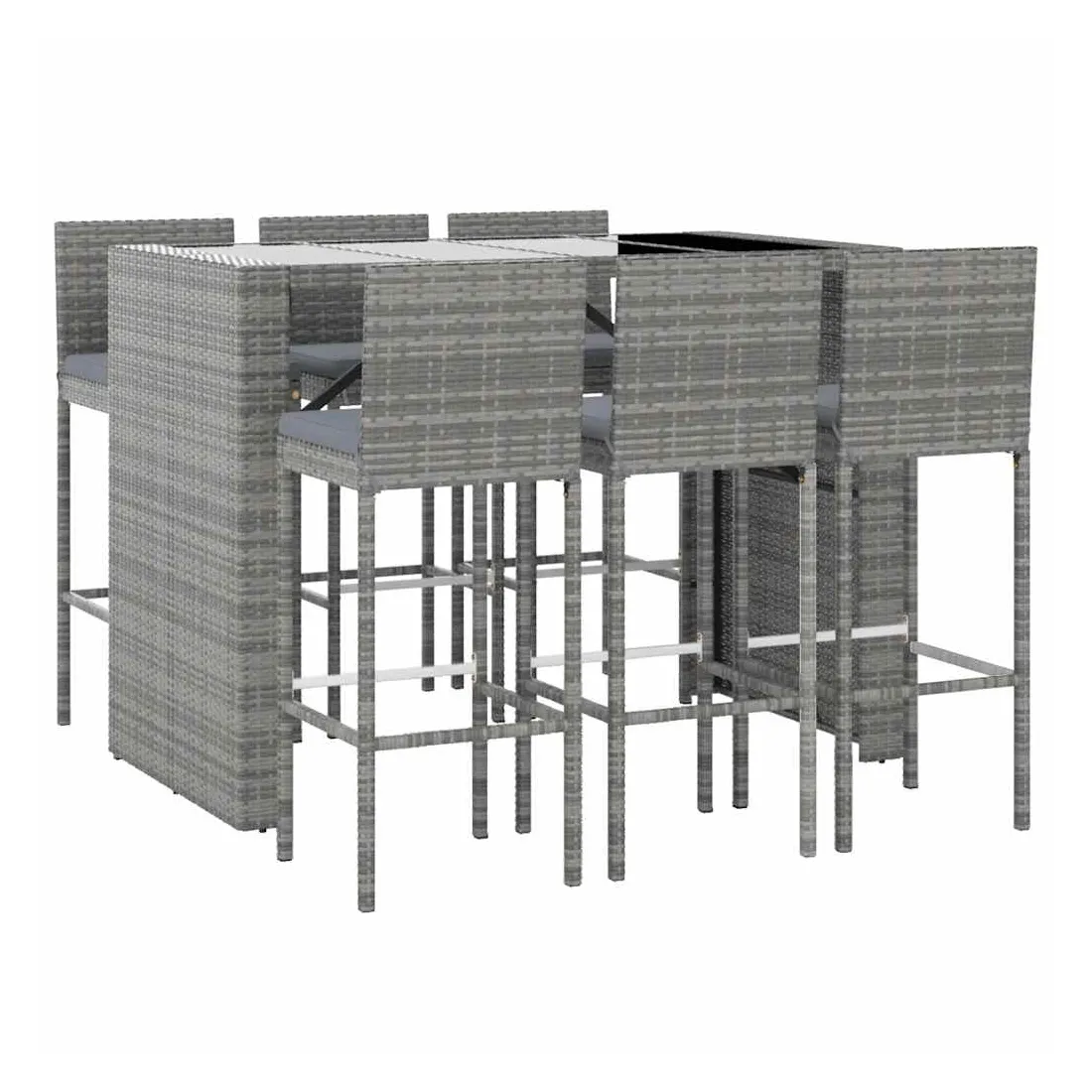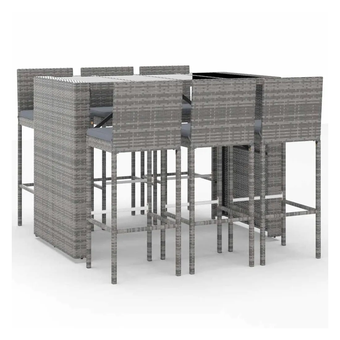 Cet ensemble de bar de jardin tendance, combinant à la fois style et fonctionnalité, est sûrement destiné à être la pièce maîtresse de votre jardin, terrasse et de tout autre espace de vie. Matériau résistant aux intempéries : la résine tressée, également connue sous le nom de rotin poly, résiste aux intempéries et est facile à nettoyer. Elle reste belle à l'extérieur pendant une longue période. Elle offre une excellente qualité, commodité et un aspect esthétique.Assise confortable : le tabouret de bar est conçu avec un dossier et un repose-pieds intégré pour vous offrir une assise confortable. Le coussin de siège bien rembourré offre un confort ultime pendant votre temps assis.Dessus en verre trempé : le dessus est en verre trempé, ce qui le rend facile à nettoyer. De plus, il offre un excellent support pour placer vos boissons, collations et vos décorations préférées.Cadre robuste et stable : les cadres en acier enduit de poudre rendent l'ensemble de pub robuste et stable pour une utilisation quotidienne à l'extérieur.Applications larges : la table et le tabouret de bar, avec leur design remarquable, créent un aspect général agréable qui s'intègre sans effort dans n'importe quel décor. Bon à savoir :Pour faciliter au maximum le montage, chaque produit est livré avec des instructions.Remarque :Pour que vos meubles d'extérieur restent beaux, nous vous recommandons de les protéger avec une housse imperméable.