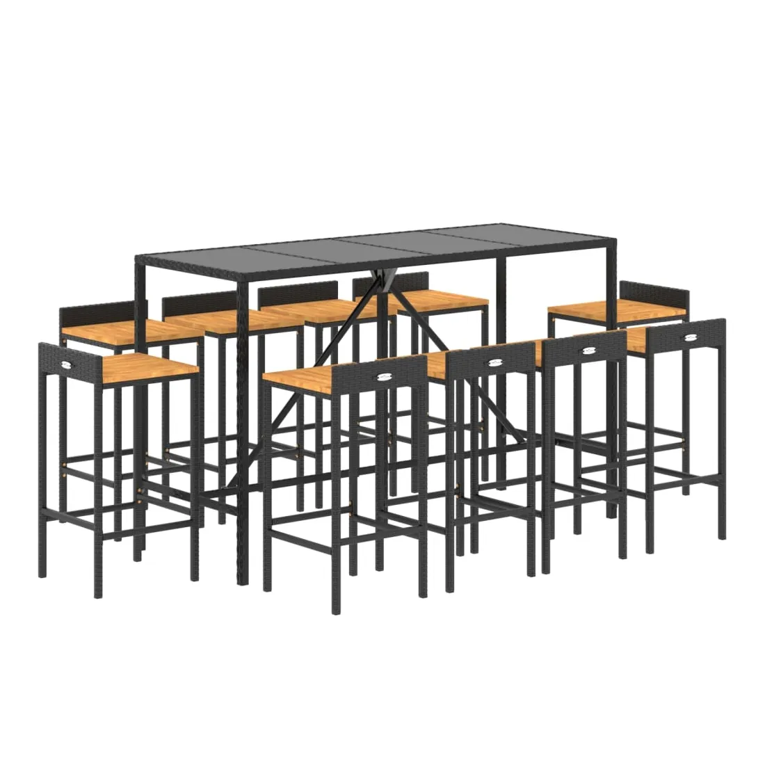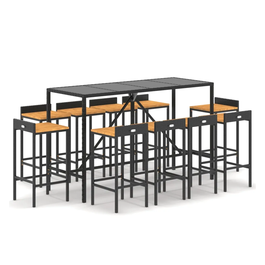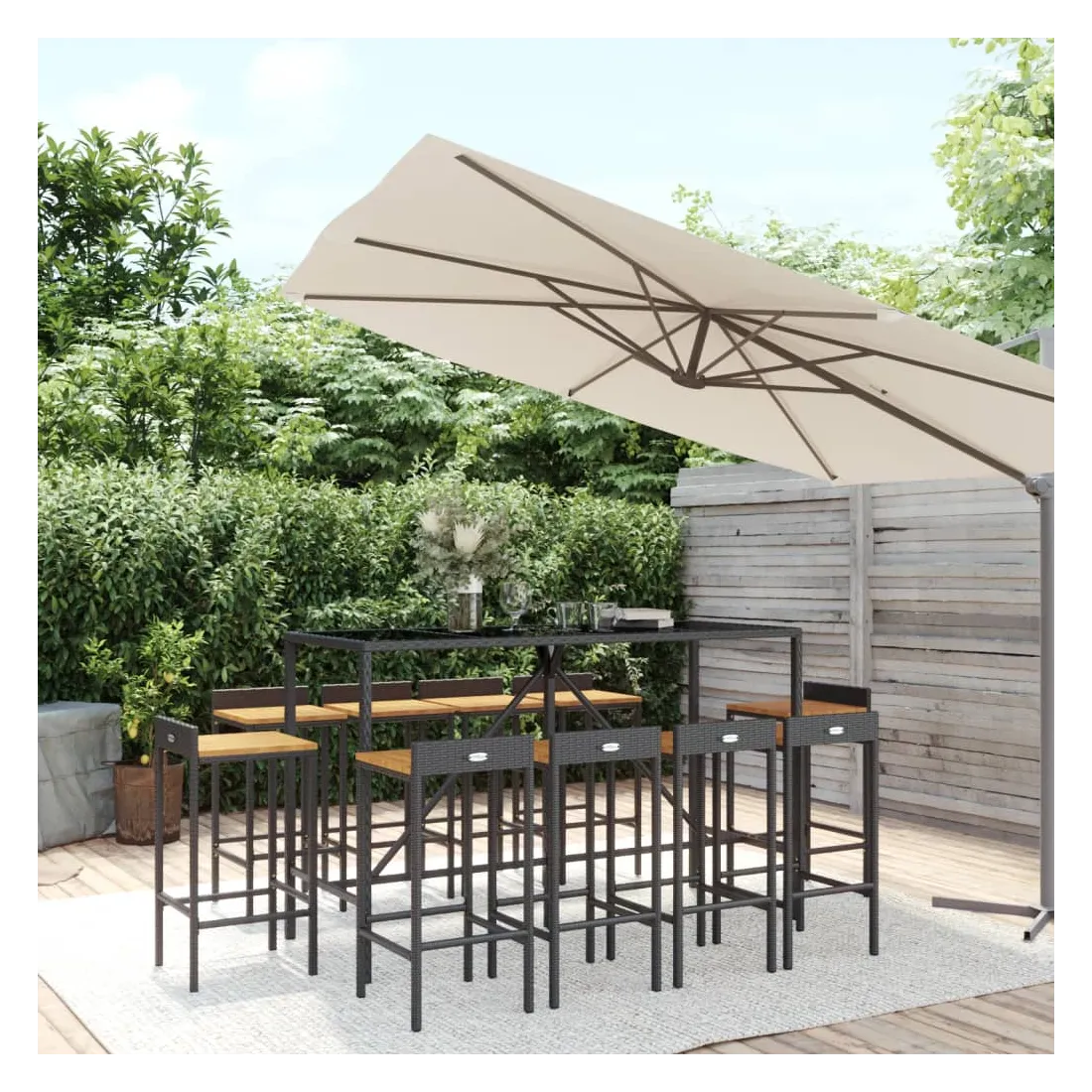 Cet ensemble de bar de jardin tendance, combinant à la fois style et fonctionnalité, est sûrement destiné à être la pièce maîtresse de votre jardin, terrasse et de tout autre espace de vie. Matériau résistant aux intempéries : la résine tressée, également connue sous le nom de rotin poly, résiste aux intempéries et est facile à nettoyer. Elle reste belle à l'extérieur pendant une longue période. Elle offre une excellente qualité, commodité et un aspect esthétique.Assise confortable : le tabouret de bar est conçu avec un repose-pied intégré pour vous offrir une expérience d'assise confortable. L'assise en bois confère au tabouret un aspect naturel et agréable tout en assurant sa stabilité.Dessus en verre trempé : le dessus est en verre trempé, ce qui le rend facile à nettoyer. De plus, il est idéal pour placer vos boissons, collations et vos décorations préférées.Cadre robuste et stable : les cadres en acier enduit de poudre rendent l'ensemble de pub robuste et stable pour une utilisation quotidienne à l'extérieur.Applications larges : la table et les tabourets de bar, avec leur design remarquable, créent un aspect général agréable qui s'intègre sans effort dans n'importe quel décor. Bon à savoir :Pour faciliter au maximum le montage, chaque produit est livré avec des instructions.Remarque :Pour que vos meubles d'extérieur restent beaux, nous vous recommandons de les protéger avec une housse imperméable.