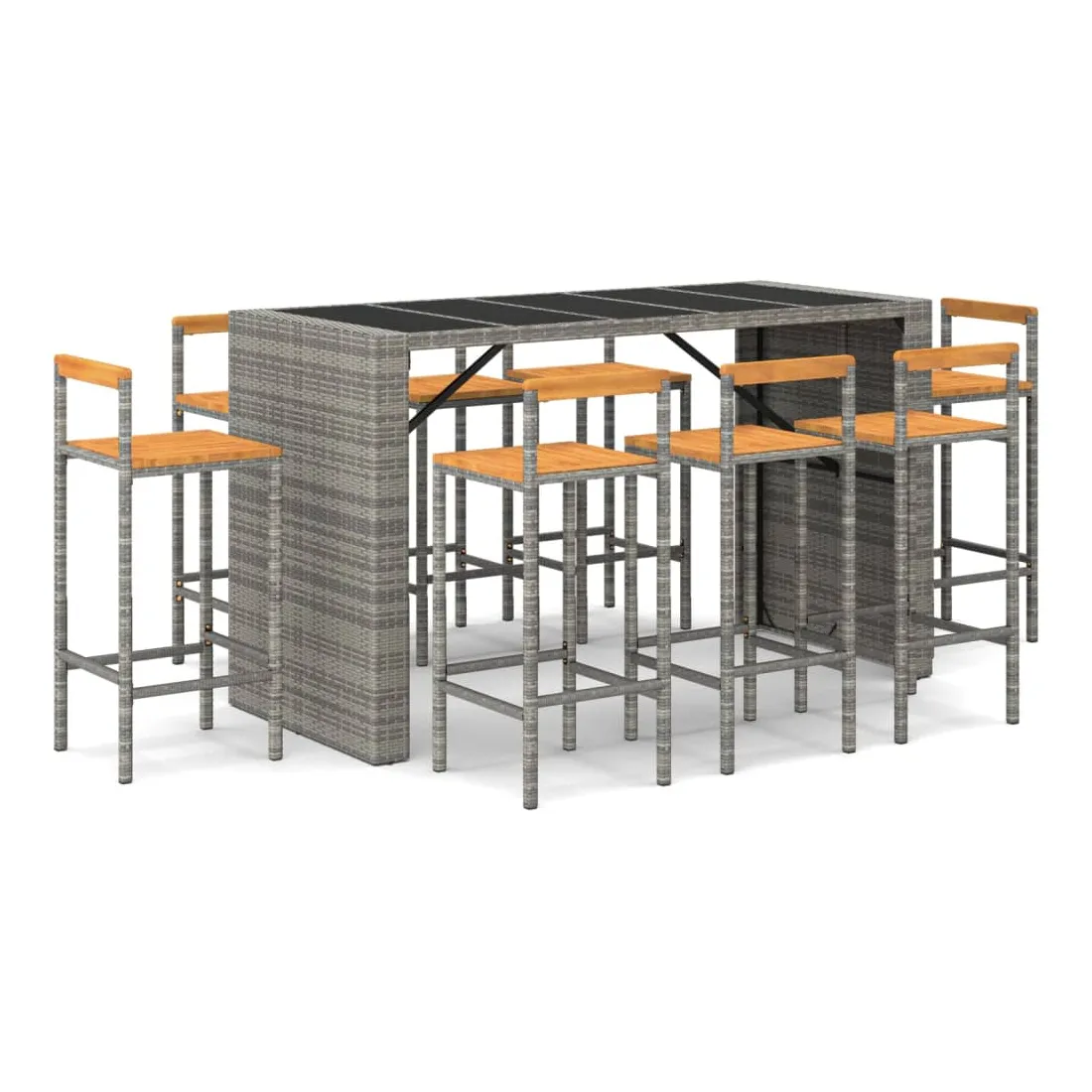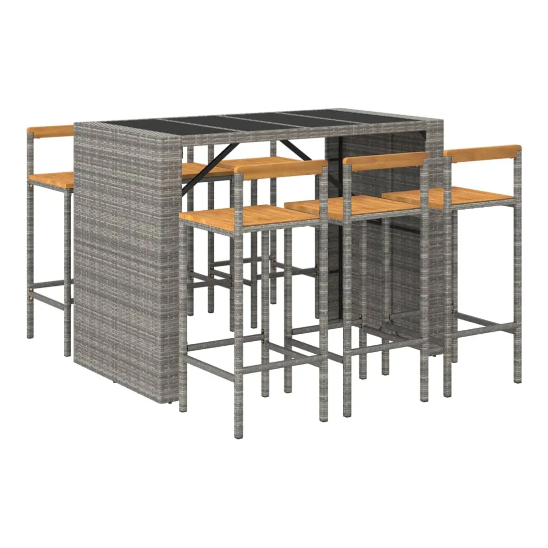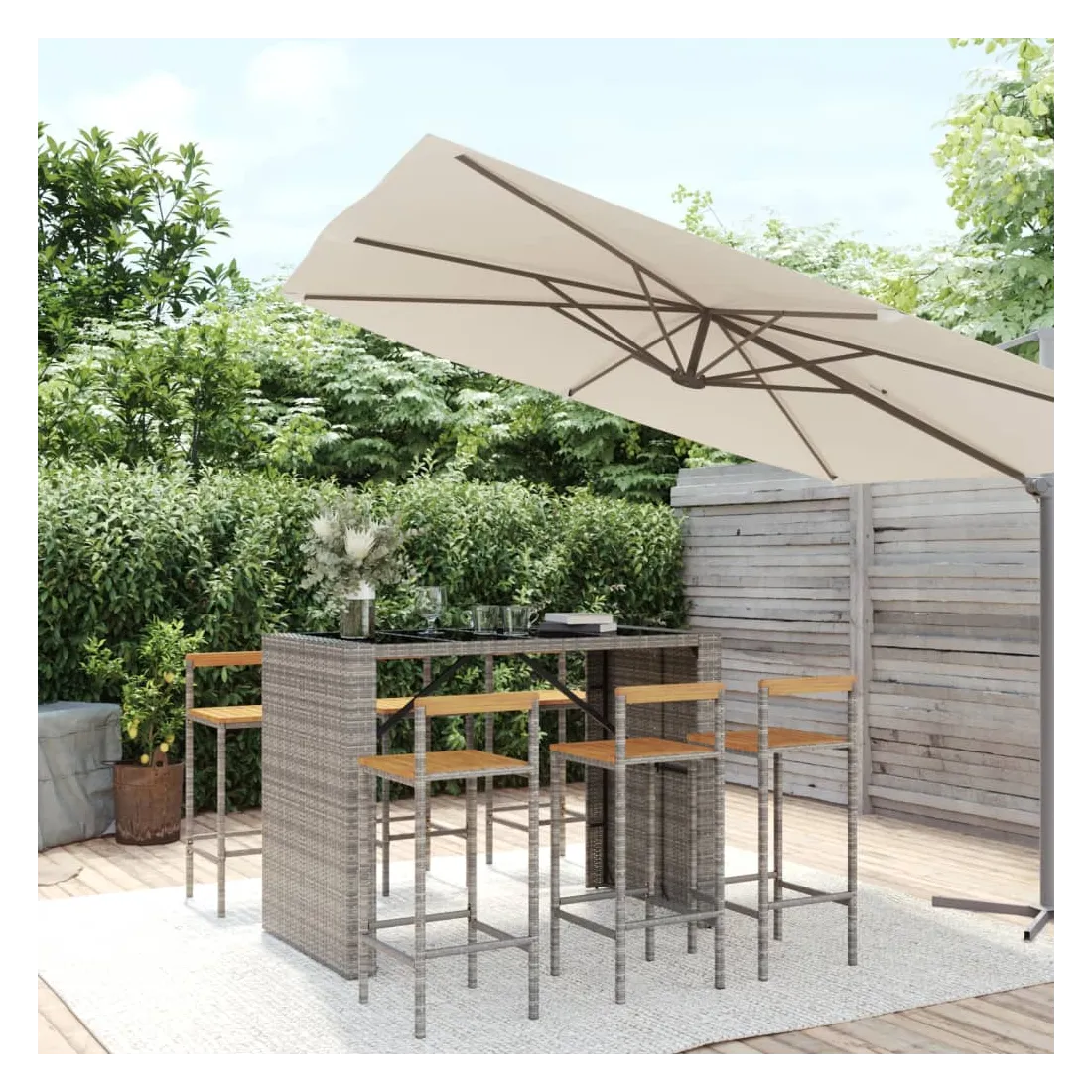 Cet ensemble de bar de jardin tendance, combinant à la fois style et fonctionnalité, est sûrement destiné à être la pièce maîtresse de votre jardin, terrasse et de tout autre espace de vie. Matériau résistant aux intempéries : la résine tressée, également connue sous le nom de rotin poly, résiste aux intempéries et est facile à nettoyer. Elle reste belle à l'extérieur pendant une longue période. Elle offre une excellente qualité, commodité et un aspect esthétique.Assise confortable : la chaise de bar est conçue avec un repose-pieds intégré et un dossier en bois pour vous offrir une expérience d'assise confortable. L'assise en bois confère à la chaise un aspect naturel et agréable tout en assurant sa stabilité.Dessus en verre trempé : le dessus est en verre trempé, ce qui le rend facile à nettoyer. De plus, il est idéal pour placer vos boissons, collations et vos décorations préférées.Cadre robuste et stable : les cadres en acier enduit de poudre rendent l'ensemble de pub robuste et stable pour une utilisation quotidienne à l'extérieur.Applications larges : la table et les chaises de bar, avec leur design remarquable, créent un aspect général agréable qui s'intègre sans effort dans n'importe quel décor. Bon à savoir :Pour faciliter au maximum le montage, chaque produit est livré avec des instructions.Remarque :Pour que vos meubles d'extérieur restent beaux, nous vous recommandons de les protéger avec une housse imperméable.