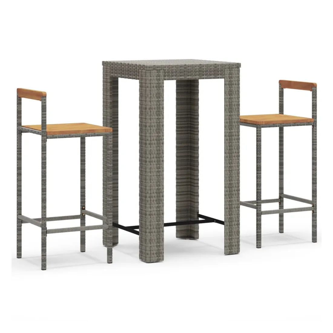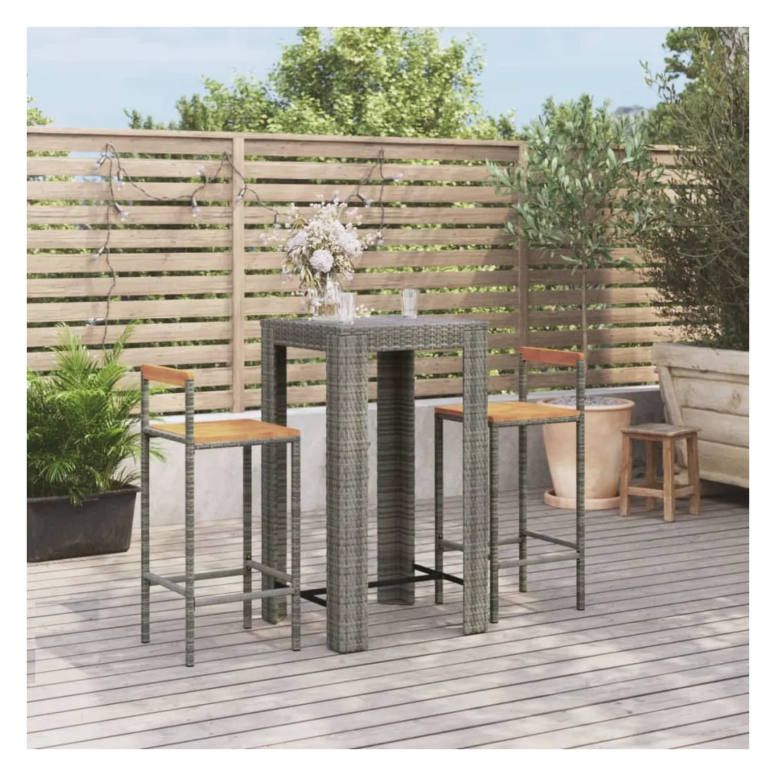 Cet ensemble de bar de jardin tendance, combinant à la fois style et fonctionnalité, est sûrement destiné à être la pièce maîtresse de votre jardin, terrasse et de tout autre espace de vie. Matériau résistant aux intempéries : la résine tressée, également connue sous le nom de rotin poly, résiste aux intempéries et est facile à nettoyer. Elle reste belle à l'extérieur pendant une longue période. Elle offre une excellente qualité, commodité et un aspect esthétique.Assise confortable : le tabouret de bar est conçu avec un repose-pied intégré pour vous offrir une expérience d'assise confortable. L'assise en bois confère au tabouret un aspect naturel et agréable tout en assurant sa stabilité.Table pratique : la table de bar est idéale pour accueillir vos boissons, vos snacks et vos décorations préférées.Cadre robuste et stable : les cadres en acier enduit de poudre rendent l'ensemble de pub robuste et stable pour une utilisation quotidienne à l'extérieur.Applications larges : la table et les tabourets de bar, avec leur design remarquable, créent un aspect général agréable qui s'intègre sans effort dans n'importe quel décor. Bon à savoir :Pour faciliter au maximum le montage, chaque produit est livré avec des instructions.Remarque :Pour que vos meubles d'extérieur restent beaux, nous vous recommandons de les protéger avec une housse imperméable.