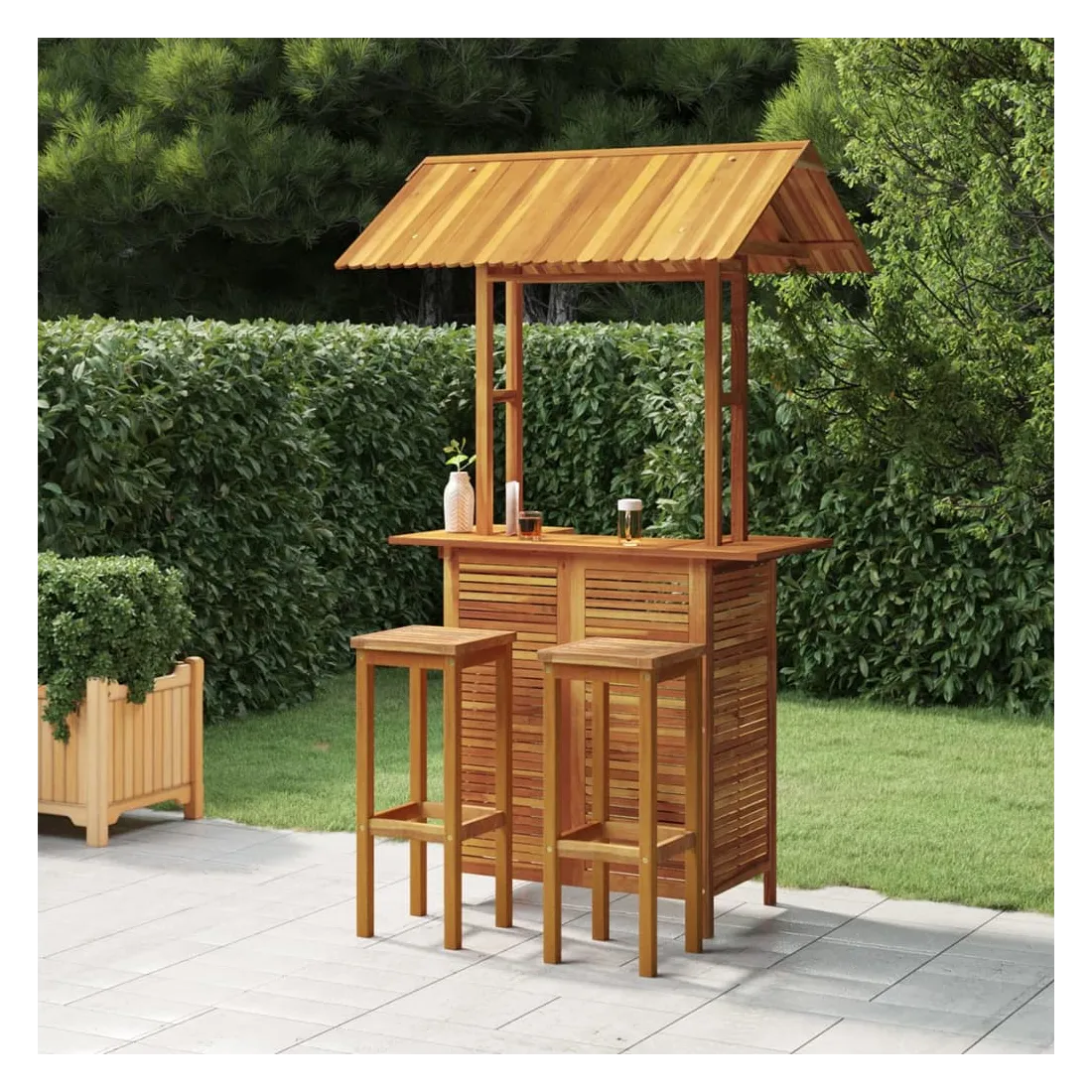 Cet ensemble de bar de jardin en bois a un design élégant et est destiné à être le point central de votre jardin, patio ou terrasse. Matériau pratique : le bois d'acacia massif est un magnifique matériau naturel. Le bois d'acacia est un bois dur tropical, dense, robuste et durable. De plus, la surface à finition à l'huile facilite le nettoyage de la table et des chaises de jardin.Cadre en bois robuste : les cadres en bois de l'ensemble de salle à manger d'extérieur garantissent la solidité et la stabilité.Toit pratique : la table de bistrot est conçue avec un toit qui offre de l'ombre et une protection contre la lumière directe du soleil.Tabourets de bar confortables : les repose-pieds de ces tabourets de bar en bois offrent un confort d'assise supplémentaire.Look intemporel : le design épuré de la table de bistrot et des tabourets en bois en fait un investissement intemporel pour votre maison. Remarque :Afin de prolonger la durée de vie de votre mobilier d'extérieur, nous vous recommandons de le protéger avec une housse imperméable.