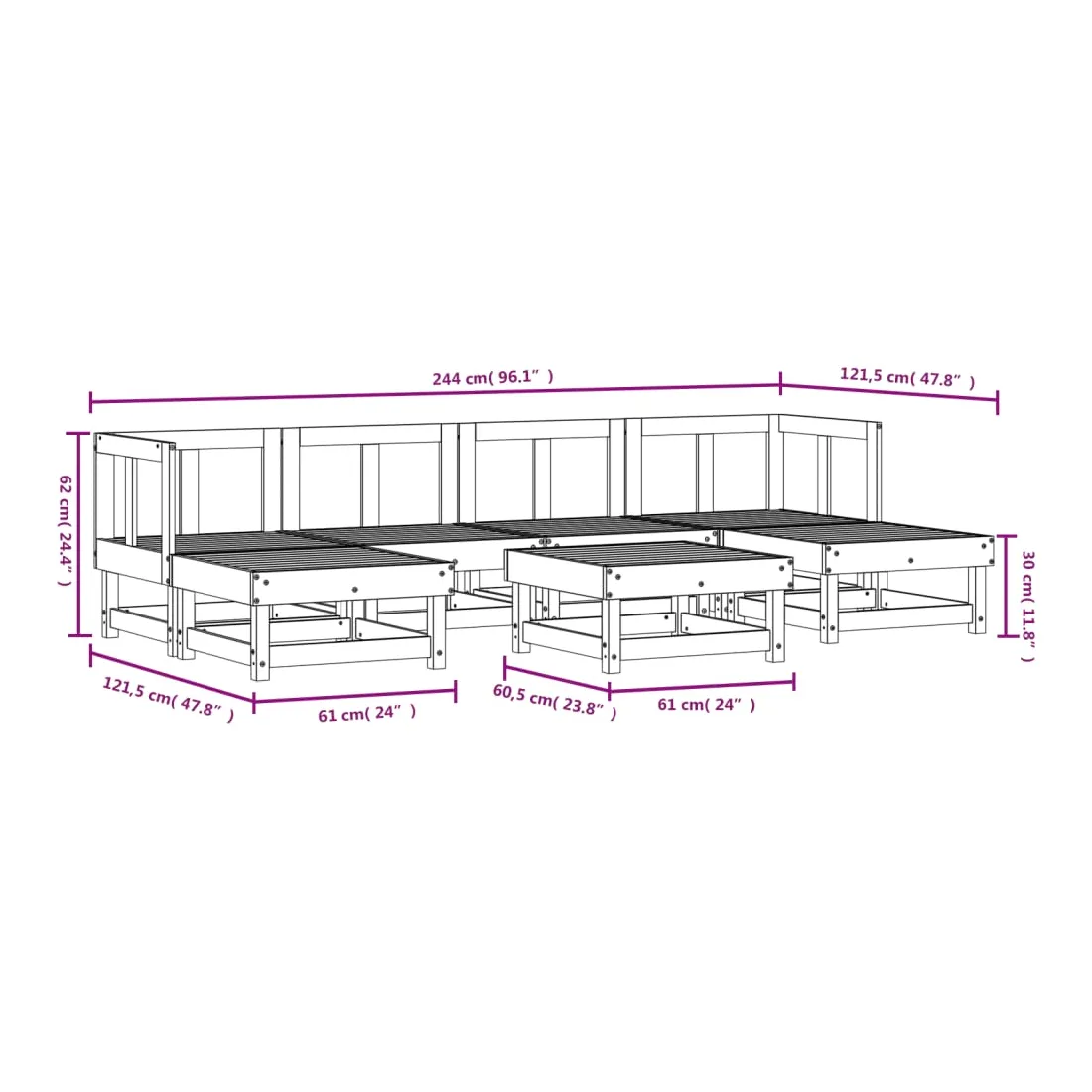 - Dimensions du canapé central : 61 x 61 x 62 cm (L x l x H)