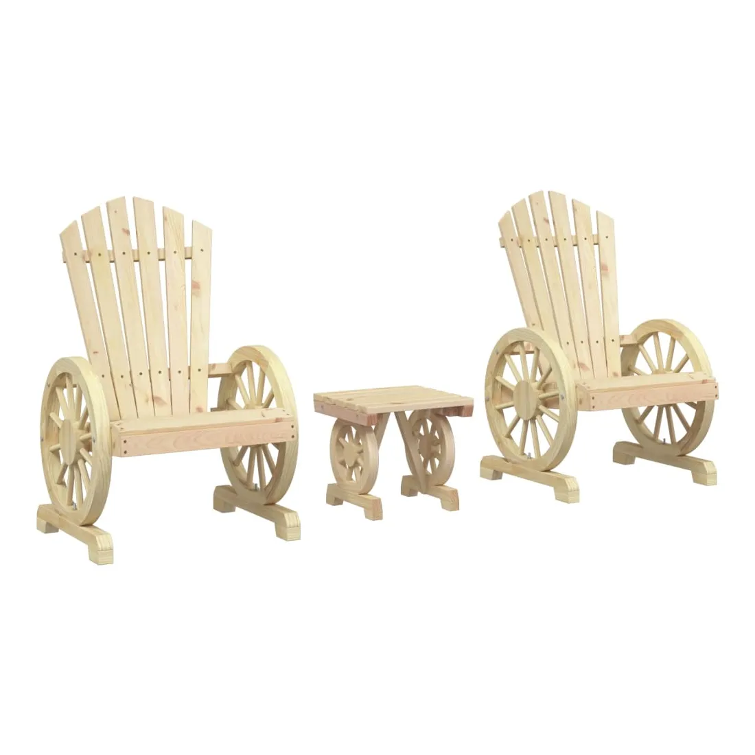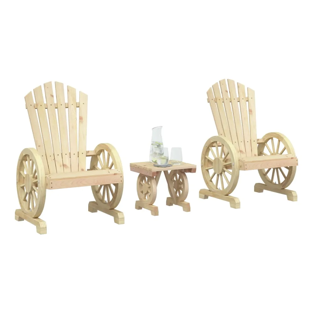 Profitez de votre temps libre avec ce salon de jardin en bois de style Adirondack. Bois de sapin massif : le bois de sapin massif est un matériau beau et durable qui conserve son intégrité même lorsqu'il est exposé à l'humidité. Il ne sèche pas et ne se déforme pas, ce qui en fait un choix fiable.Assise confortable : la chaise longue de jardin est dotée d'une assise ergonomique et d'un dossier incliné pour un confort d'assise optimal. De plus, les accoudoirs en forme de roue de chariot offrent un espace confortable pour reposer vos bras.Table pratique : la table basse est parfaite pour placer vos boissons, aliments et autres objets de décoration. Bon à savoir :Pour que vos meubles d'extérieur restent beaux, nous vous recommandons de les protéger avec une housse imperméable.