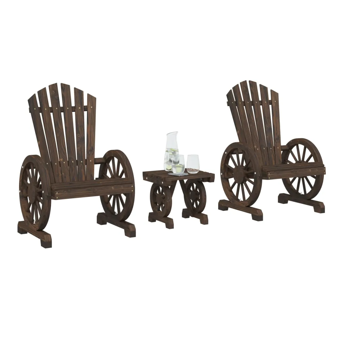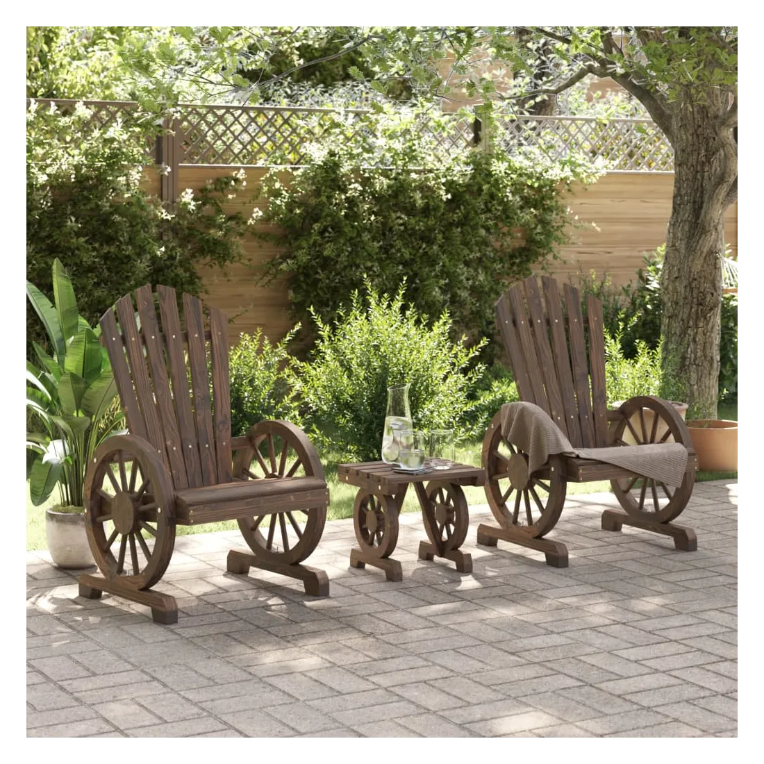 Profitez de votre temps libre avec ce salon de jardin en bois de style Adirondack. Bois de sapin massif : le bois de sapin massif est un matériau beau et durable qui conserve son intégrité même lorsqu'il est exposé à l'humidité. Il ne sèche pas et ne se déforme pas, ce qui en fait un choix fiable.Assise confortable : la chaise longue de jardin est dotée d'une assise ergonomique et d'un dossier incliné pour un confort d'assise optimal. De plus, les accoudoirs en forme de roue de chariot offrent un espace confortable pour reposer vos bras.Table pratique : la table basse est parfaite pour placer vos boissons, aliments et autres objets de décoration. Bon à savoir :Pour que vos meubles d'extérieur restent beaux, nous vous recommandons de les protéger avec une housse imperméable.