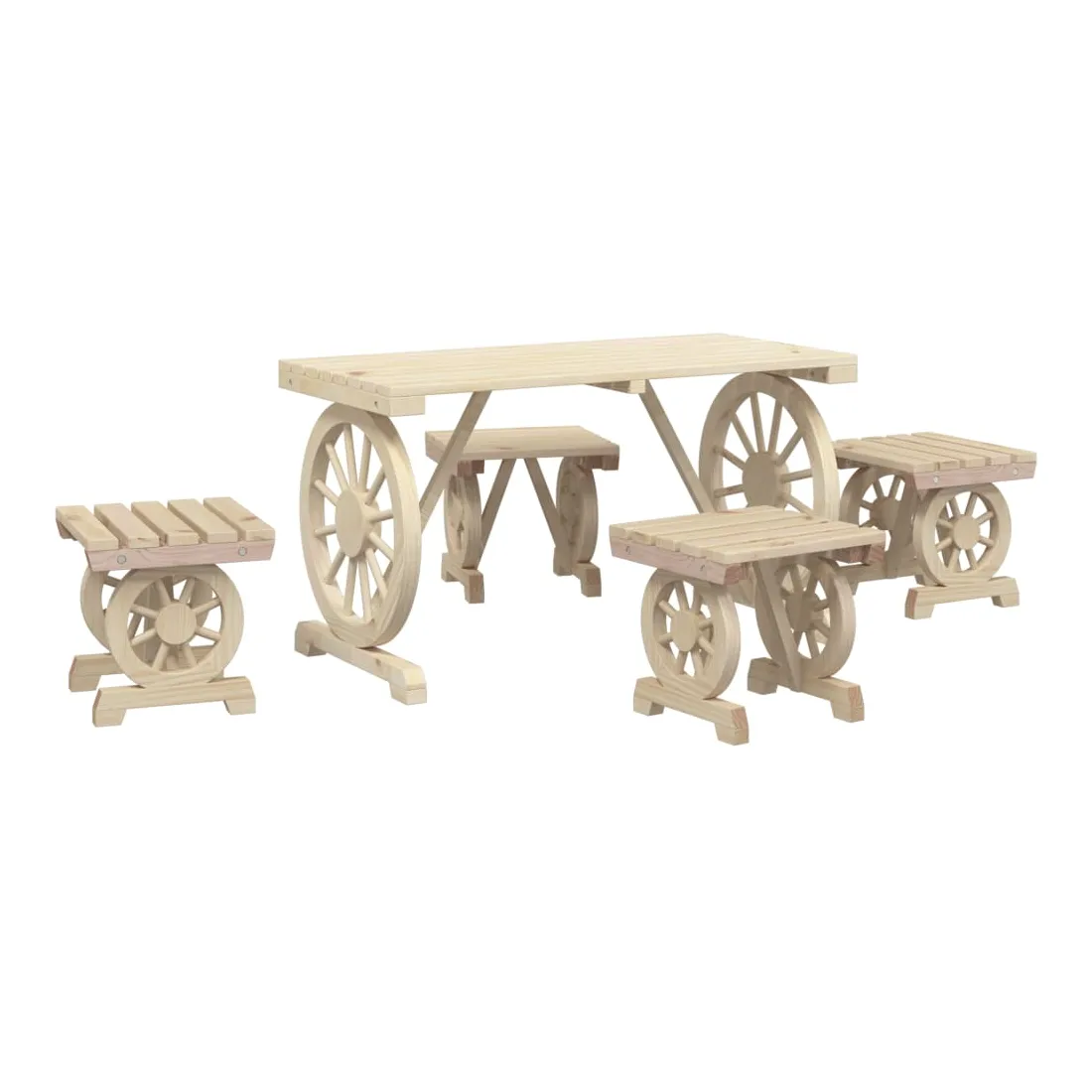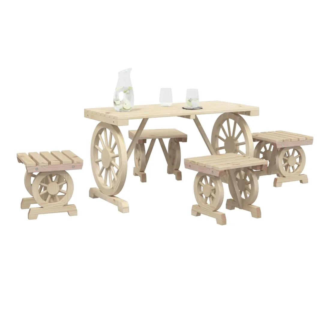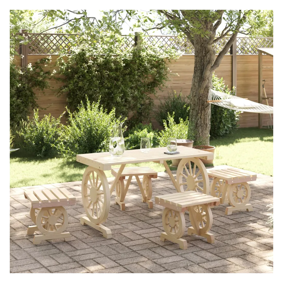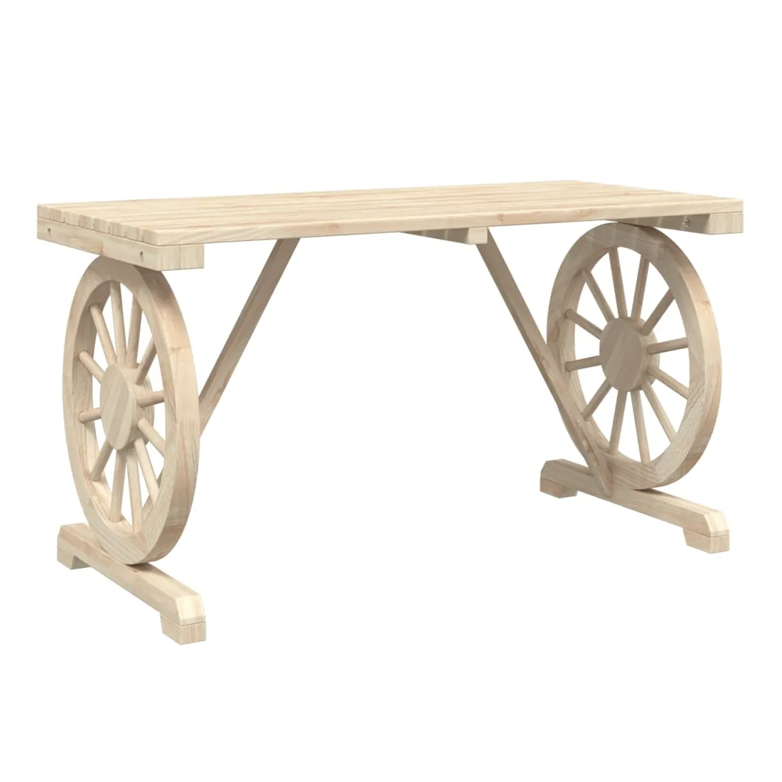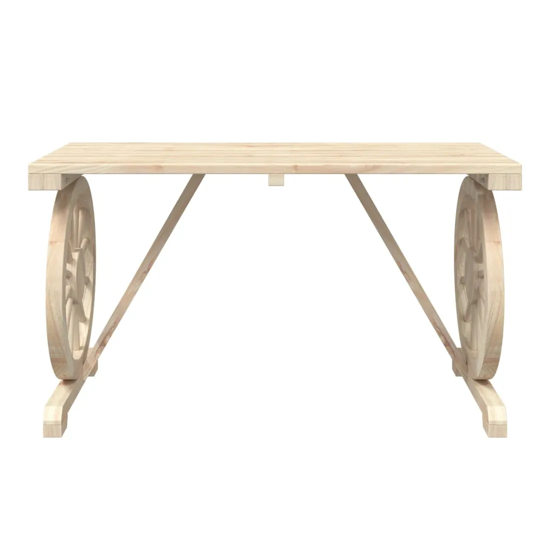 Profitez d'un bon repas ou d'un thé l'après-midi dans votre espace extérieur avec cet ensemble à manger de jardin en bois ! Bois de sapin massif : le bois de sapin massif est un matériau beau et durable qui conserve son intégrité même lorsqu'il est exposé à l'humidité. Il ne sèche pas et ne se déforme pas, ce qui en fait un choix fiable.Table pratique : la table de jardin est parfaite pour placer vos boissons, aliments et autres objets de décoration.Design attrayant : l’ensemble à manger d’extérieur présente un design en forme de roue de chariot qui offre un affichage accrocheur sous tous les angles. Bon à savoir :Pour que vos meubles d'extérieur restent beaux, nous vous recommandons de les protéger avec une housse imperméable.