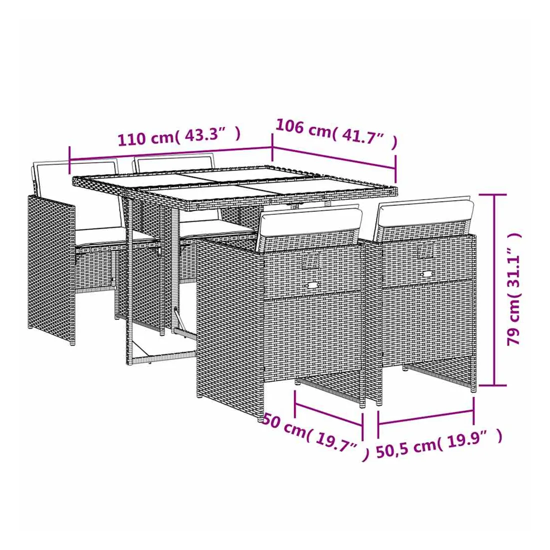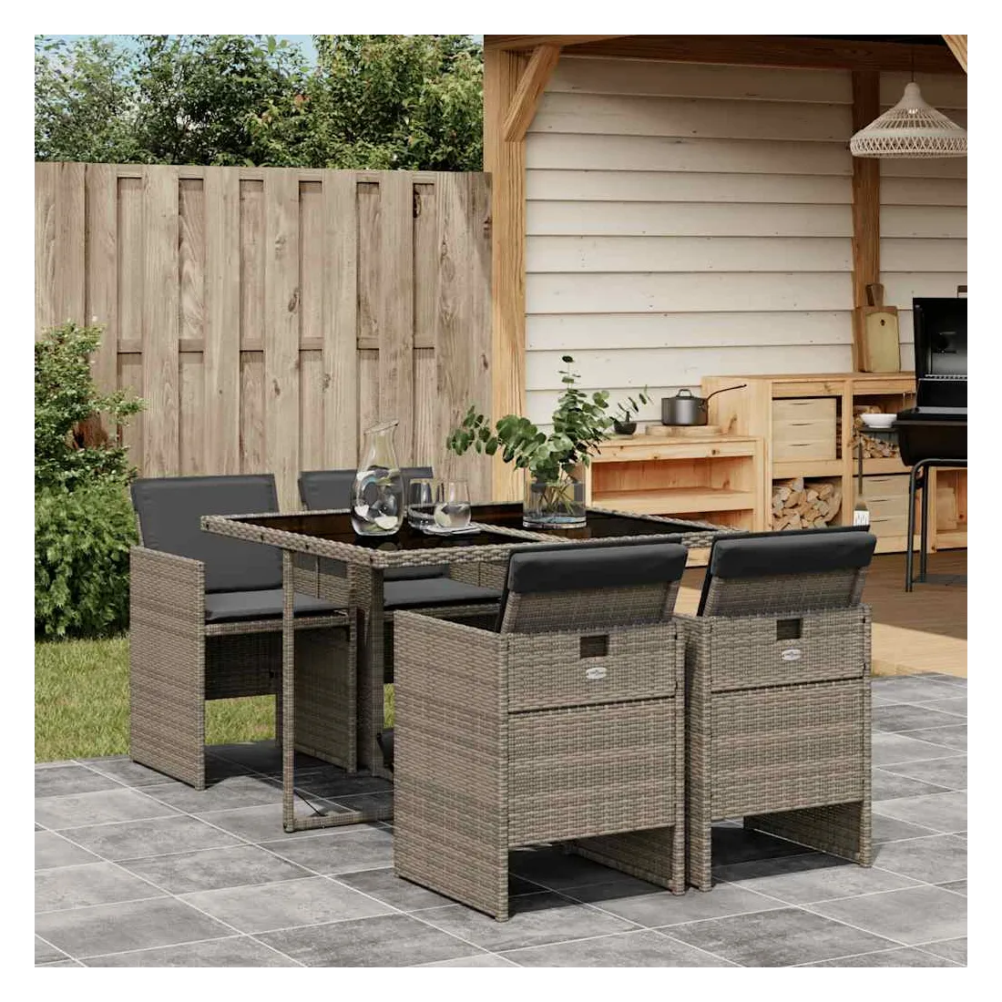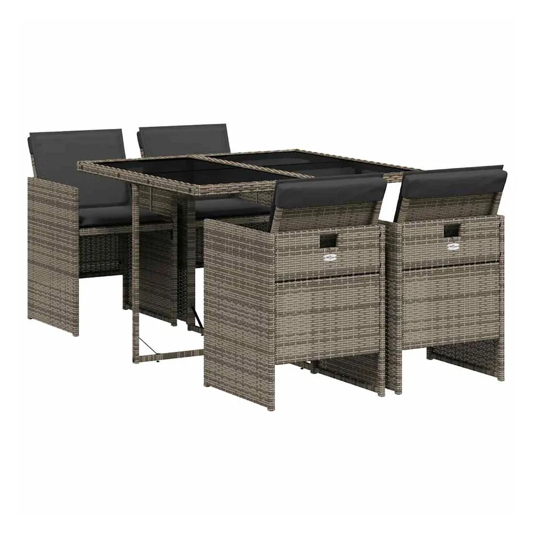 Cet ensemble de salle à manger de jardin est un excellent choix pour les repas en plein air ou pour vous détendre dans le jardin, dans l'arrière-cour ou sur la terrasse. Matériau durable : la résine tressée, également connue sous le nom de poly rotin, est un matériau synthétique solide et nécessitant peu d'entretien qui ressemble au rotin naturel. Il est léger, facile à nettoyer et couramment utilisé pour les meubles d'extérieur en raison de sa durabilité et de ses propriétés de résistance aux intempéries.Rangement compact : ces chaises sont dotées d'un dossier rabattable, ce qui permet de les ranger facilement sous la table. Une fois pliées, elles se rangent parfaitement sous la table, formant un cube peu encombrant. Expérience d'assise confortable : ce mobilier d'extérieur, doté de coussins épais, offre une expérience d'assise confortable.Housse amovible et lavable : ces coussins de siège sont dotés de housses amovibles pour un lavage et un entretien faciles.Dessus en verre : le dessus de la table d'extérieur est fabriqué en verre trempé solide et durable, ce qui le rend facile à nettoyer avec un chiffon humide et ajoute une touche d'élégance à votre espace extérieur. Bon à savoir : Pour que vos meubles d'extérieur restent beaux, nous vous recommandons de les protéger avec une housse imperméable.