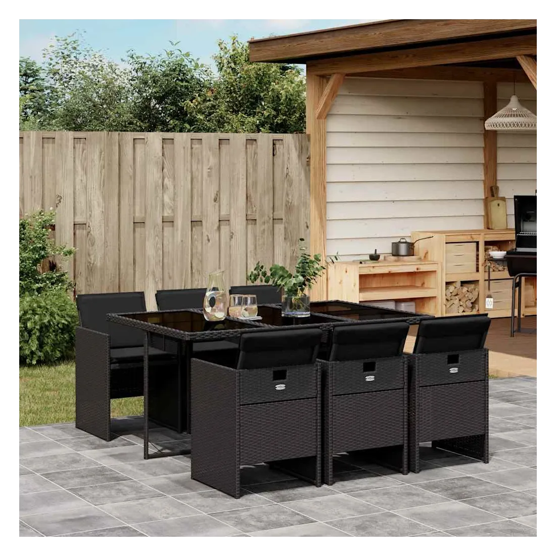 Cet ensemble de salle à manger de jardin est un excellent choix pour les repas en plein air ou pour vous détendre dans le jardin, dans l'arrière-cour ou sur la terrasse. Matériau durable : la résine tressée, également connue sous le nom de poly rotin, est un matériau synthétique solide et nécessitant peu d'entretien qui ressemble au rotin naturel. Il est léger, facile à nettoyer et couramment utilisé pour les meubles d'extérieur en raison de sa durabilité et de ses propriétés de résistance aux intempéries.Rangement compact : ces chaises sont dotées d'un dossier rabattable, ce qui permet de les ranger facilement sous la table. Une fois pliées, elles se rangent parfaitement sous la table, formant un cube peu encombrant. Expérience d'assise confortable : ce mobilier d'extérieur, doté de coussins épais, offre une expérience d'assise confortable.Housse amovible et lavable : ces coussins de siège sont dotés de housses amovibles pour un lavage et un entretien faciles.Dessus en verre : le dessus de la table d'extérieur est fabriqué en verre trempé solide et durable, ce qui le rend facile à nettoyer avec un chiffon humide et ajoute une touche d'élégance à votre espace extérieur. Bon à savoir : Pour que vos meubles d'extérieur restent beaux, nous vous recommandons de les protéger avec une housse imperméable.