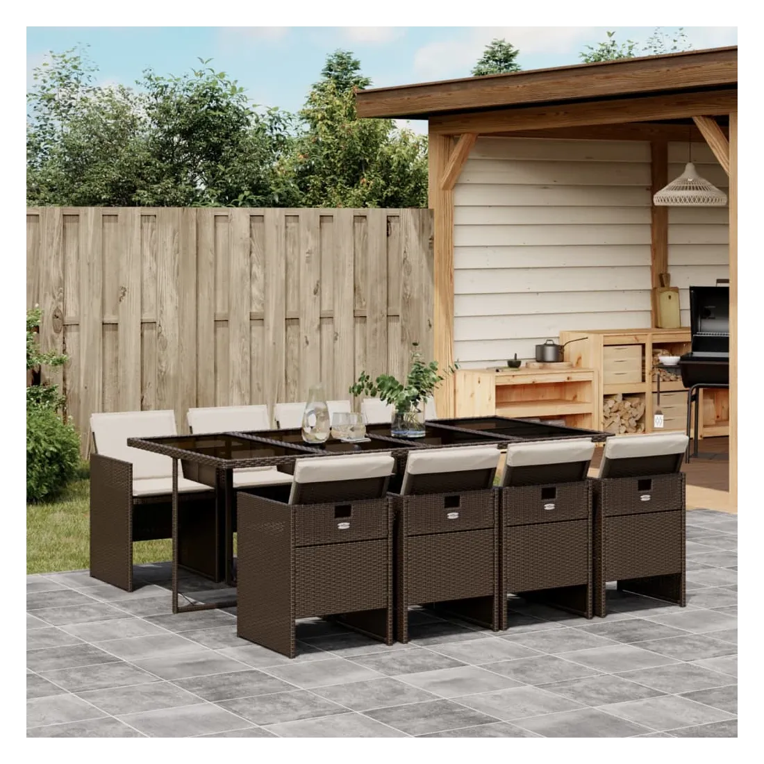 Cet ensemble de salle à manger de jardin est un excellent choix pour les repas en plein air ou pour vous détendre dans le jardin, dans l'arrière-cour ou sur la terrasse. Matériau durable : la résine tressée, également connue sous le nom de poly rotin, est un matériau synthétique solide et nécessitant peu d'entretien qui ressemble au rotin naturel. Il est léger, facile à nettoyer et couramment utilisé pour les meubles d'extérieur en raison de sa durabilité et de ses propriétés de résistance aux intempéries.Rangement compact : ces chaises sont dotées d'un dossier rabattable, ce qui permet de les ranger facilement sous la table. Une fois pliées, elles se rangent parfaitement sous la table, formant un cube peu encombrant. Expérience d'assise confortable : ce mobilier d'extérieur, doté de coussins épais, offre une expérience d'assise confortable.Housse amovible et lavable : ces coussins de siège sont dotés de housses amovibles pour un lavage et un entretien faciles.Dessus en verre : le dessus de la table d'extérieur est fabriqué en verre trempé solide et durable, ce qui le rend facile à nettoyer avec un chiffon humide et ajoute une touche d'élégance à votre espace extérieur. Bon à savoir : Pour que vos meubles d'extérieur restent beaux, nous vous recommandons de les protéger avec une housse imperméable.