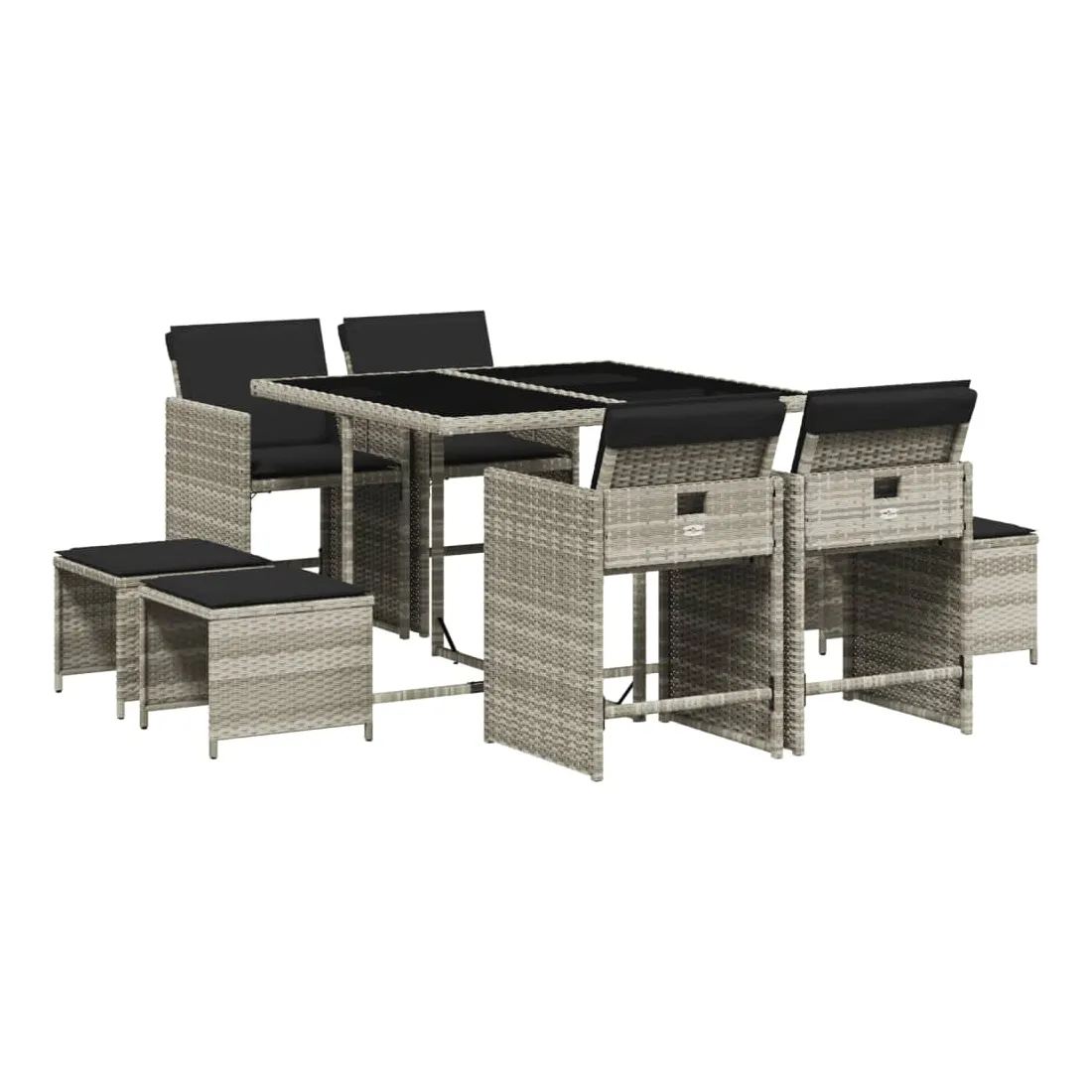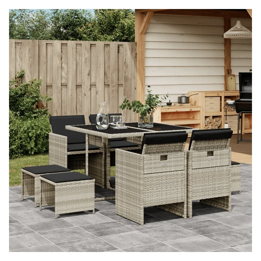 Cet ensemble de salle à manger de jardin est un excellent choix pour les repas en plein air ou pour vous détendre dans le jardin, dans l'arrière-cour ou sur la terrasse. Matériau durable : la résine tressée, également connue sous le nom de poly rotin, est un matériau synthétique solide et nécessitant peu d'entretien qui ressemble au rotin naturel. Il est léger, facile à nettoyer et couramment utilisé pour les meubles d'extérieur en raison de sa durabilité et de ses propriétés de résistance aux intempéries.Rangement compact : ces chaises sont dotées d'un dossier rabattable, ce qui permet de les ranger facilement sous la table. Une fois pliées, elles se rangent parfaitement sous la table, formant un cube peu encombrant. De plus, les tabourets peuvent également être rangés sous les chaises, maximisant encore davantage l'efficacité de l'espace. Expérience d'assise confortable : ce mobilier d'extérieur, doté de coussins épais, offre une expérience d'assise confortable.Housse amovible et lavable : ces coussins de siège sont dotés de housses amovibles pour un lavage et un entretien faciles.Dessus en verre : le dessus de la table d'extérieur est fabriqué en verre trempé solide et durable, ce qui le rend facile à nettoyer avec un chiffon humide et ajoute une touche d'élégance à votre espace extérieur. Bon à savoir : Pour que vos meubles d'extérieur restent beaux, nous vous recommandons de les protéger avec une housse imperméable.