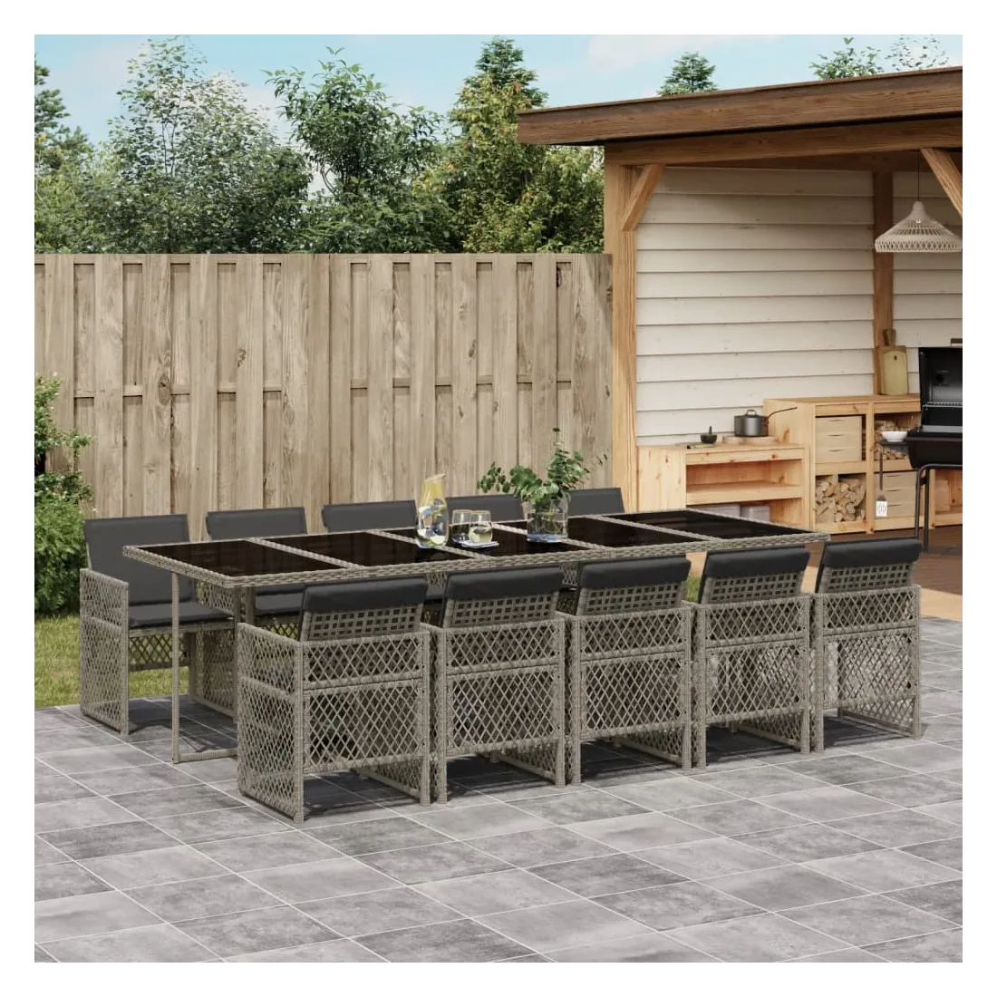 Cet ensemble de salle à manger de jardin est un excellent choix pour les repas en plein air ou pour vous détendre dans le jardin, l'arrière-cour ou le patio. Matériau durable : la résine tressée, également connue sous le nom de poly rotin, est un matériau synthétique solide et nécessitant peu d'entretien qui ressemble au rotin naturel. Elle est légère, facile à nettoyer et couramment utilisée pour les meubles d'extérieur en raison de sa durabilité et de ses propriétés de résistance aux intempéries. Dessus en verre : le dessus de la table d'extérieur est fabriqué en verre trempé solide et durable, ce qui le rend facile à nettoyer avec un chiffon humide et ajoute une touche d'élégance à votre espace extérieur. Rangement compact : ces chaises sont dotées d'un dossier rabattable, ce qui permet de les ranger facilement sous la table. Une fois pliées, elles se rangent parfaitement sous la table, formant un cube peu encombrant. Expérience d'assise confortable : ce mobilier d'extérieur, doté de coussins épais, offre une expérience d'assise confortable. Housse amovible et lavable : ces coussins de siège sont dotés de housses amovibles pour un lavage et un entretien faciles. Les housses de coussin de chaise ont un rabat à l'arrière pour une fixation facile aux chaises. Bon à savoir :Pour que vos meubles d'extérieur restent beaux, nous vous recommandons de les protéger avec une housse imperméable.