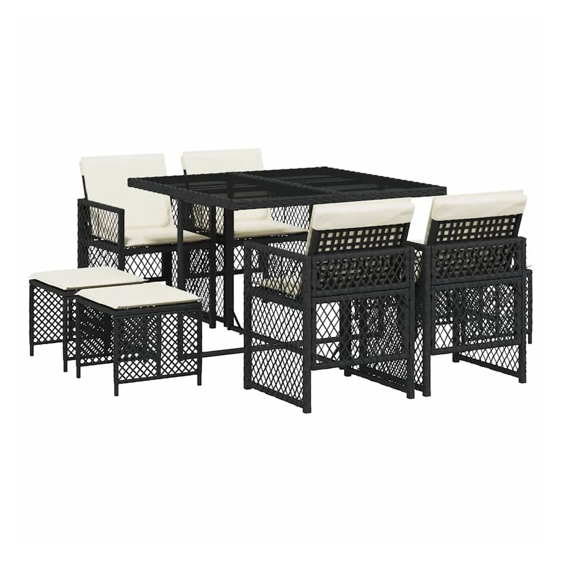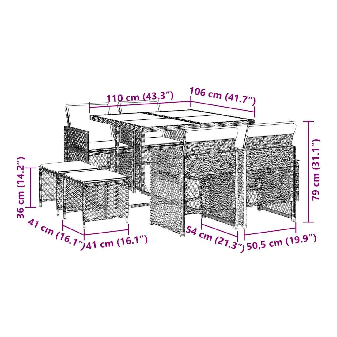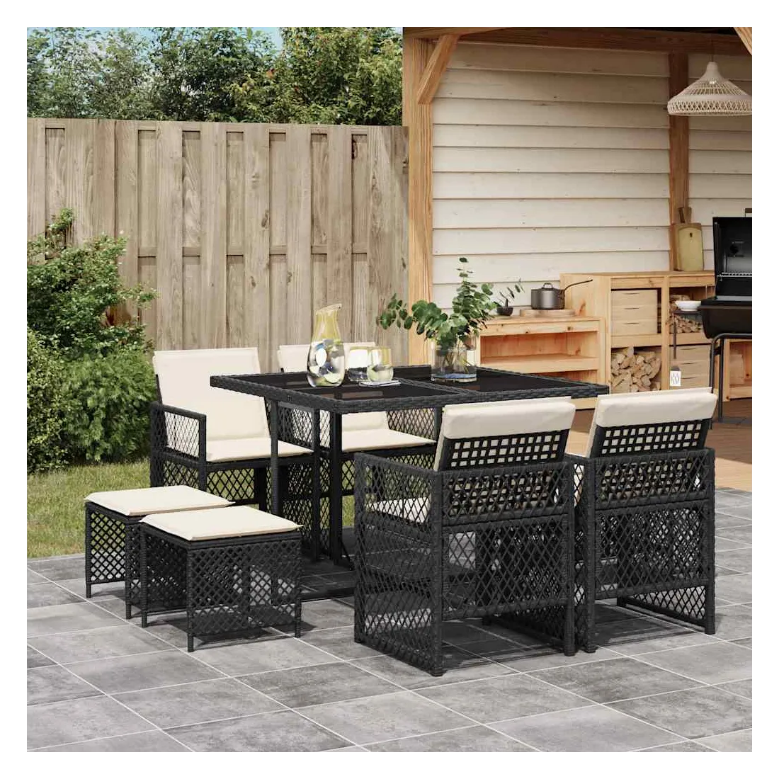 Cet ensemble de salle à manger de jardin est un excellent choix pour les repas en plein air ou pour vous détendre dans le jardin, l'arrière-cour ou le patio. Matériau durable : la résine tressée, également connue sous le nom de poly rotin, est un matériau synthétique solide et nécessitant peu d'entretien qui ressemble au rotin naturel. Elle est légère, facile à nettoyer et couramment utilisée pour les meubles d'extérieur en raison de sa durabilité et de ses propriétés de résistance aux intempéries. Dessus en verre : le dessus de la table d'extérieur est fabriqué en verre trempé solide et durable, ce qui le rend facile à nettoyer avec un chiffon humide et ajoute une touche d'élégance à votre espace extérieur. Rangement compact : ces chaises sont dotées d'un dossier rabattable, ce qui permet de les ranger facilement sous la table. Une fois pliées, elles se rangent parfaitement sous la table, formant un cube peu encombrant. De plus, les tabourets peuvent également être rangés sous les chaises, maximisant encore davantage l'efficacité de l'espace. Expérience d'assise confortable : ce mobilier d'extérieur, doté de coussins épais, offre une expérience d'assise confortable. Housse amovible et lavable : ces coussins de siège sont dotés de housses amovibles pour un lavage et un entretien faciles. Les housses de coussin de chaise ont un rabat à l'arrière pour une fixation facile aux chaises. Bon à savoir :Pour que vos meubles d'extérieur restent beaux, nous vous recommandons de les protéger avec une housse imperméable.