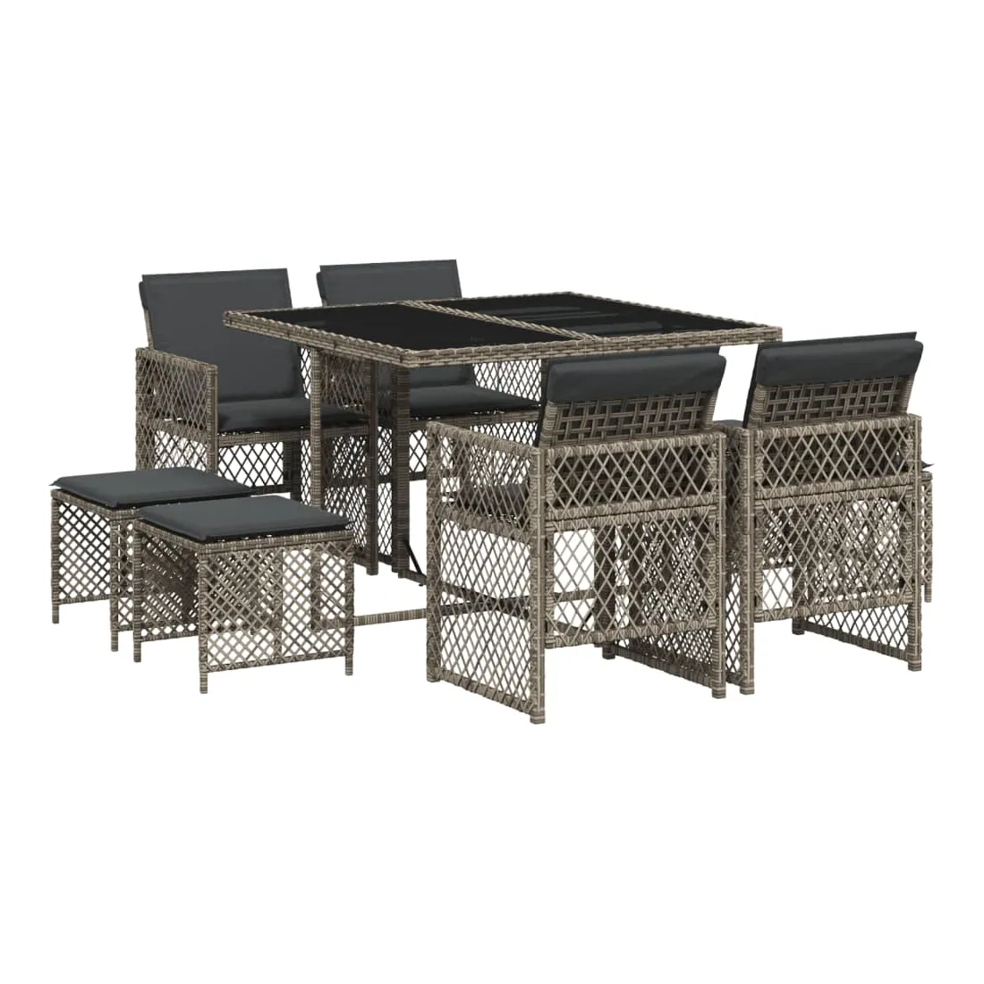 Cet ensemble de salle à manger de jardin est un excellent choix pour les repas en plein air ou pour vous détendre dans le jardin, l'arrière-cour ou le patio. Matériau durable : la résine tressée, également connue sous le nom de poly rotin, est un matériau synthétique solide et nécessitant peu d'entretien qui ressemble au rotin naturel. Elle est légère, facile à nettoyer et couramment utilisée pour les meubles d'extérieur en raison de sa durabilité et de ses propriétés de résistance aux intempéries. Dessus en verre : le dessus de la table d'extérieur est fabriqué en verre trempé solide et durable, ce qui le rend facile à nettoyer avec un chiffon humide et ajoute une touche d'élégance à votre espace extérieur. Rangement compact : ces chaises sont dotées d'un dossier rabattable, ce qui permet de les ranger facilement sous la table. Une fois pliées, elles se rangent parfaitement sous la table, formant un cube peu encombrant. De plus, les tabourets peuvent également être rangés sous les chaises, maximisant encore davantage l'efficacité de l'espace. Expérience d'assise confortable : ce mobilier d'extérieur, doté de coussins épais, offre une expérience d'assise confortable. Housse amovible et lavable : ces coussins de siège sont dotés de housses amovibles pour un lavage et un entretien faciles. Les housses de coussin de chaise ont un rabat à l'arrière pour une fixation facile aux chaises. Bon à savoir :Pour que vos meubles d'extérieur restent beaux, nous vous recommandons de les protéger avec une housse imperméable.