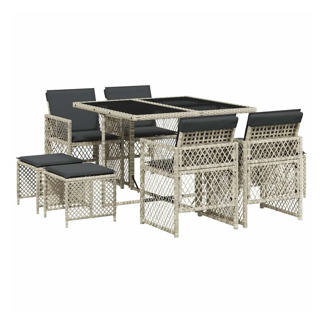 Cet ensemble de salle à manger de jardin est un excellent choix pour les repas en plein air ou pour vous détendre dans le jardin, l'arrière-cour ou le patio. Matériau durable : la résine tressée, également connue sous le nom de poly rotin, est un matériau synthétique solide et nécessitant peu d'entretien qui ressemble au rotin naturel. Elle est légère, facile à nettoyer et couramment utilisée pour les meubles d'extérieur en raison de sa durabilité et de ses propriétés de résistance aux intempéries. Dessus en verre : le dessus de la table d'extérieur est fabriqué en verre trempé solide et durable, ce qui le rend facile à nettoyer avec un chiffon humide et ajoute une touche d'élégance à votre espace extérieur. Rangement compact : ces chaises sont dotées d'un dossier rabattable, ce qui permet de les ranger facilement sous la table. Une fois pliées, elles se rangent parfaitement sous la table, formant un cube peu encombrant. De plus, les tabourets peuvent également être rangés sous les chaises, maximisant encore davantage l'efficacité de l'espace. Expérience d'assise confortable : ce mobilier d'extérieur, doté de coussins épais, offre une expérience d'assise confortable. Housse amovible et lavable : ces coussins de siège sont dotés de housses amovibles pour un lavage et un entretien faciles. Les housses de coussin de chaise ont un rabat à l'arrière pour une fixation facile aux chaises. Bon à savoir :Pour que vos meubles d'extérieur restent beaux, nous vous recommandons de les protéger avec une housse imperméable.