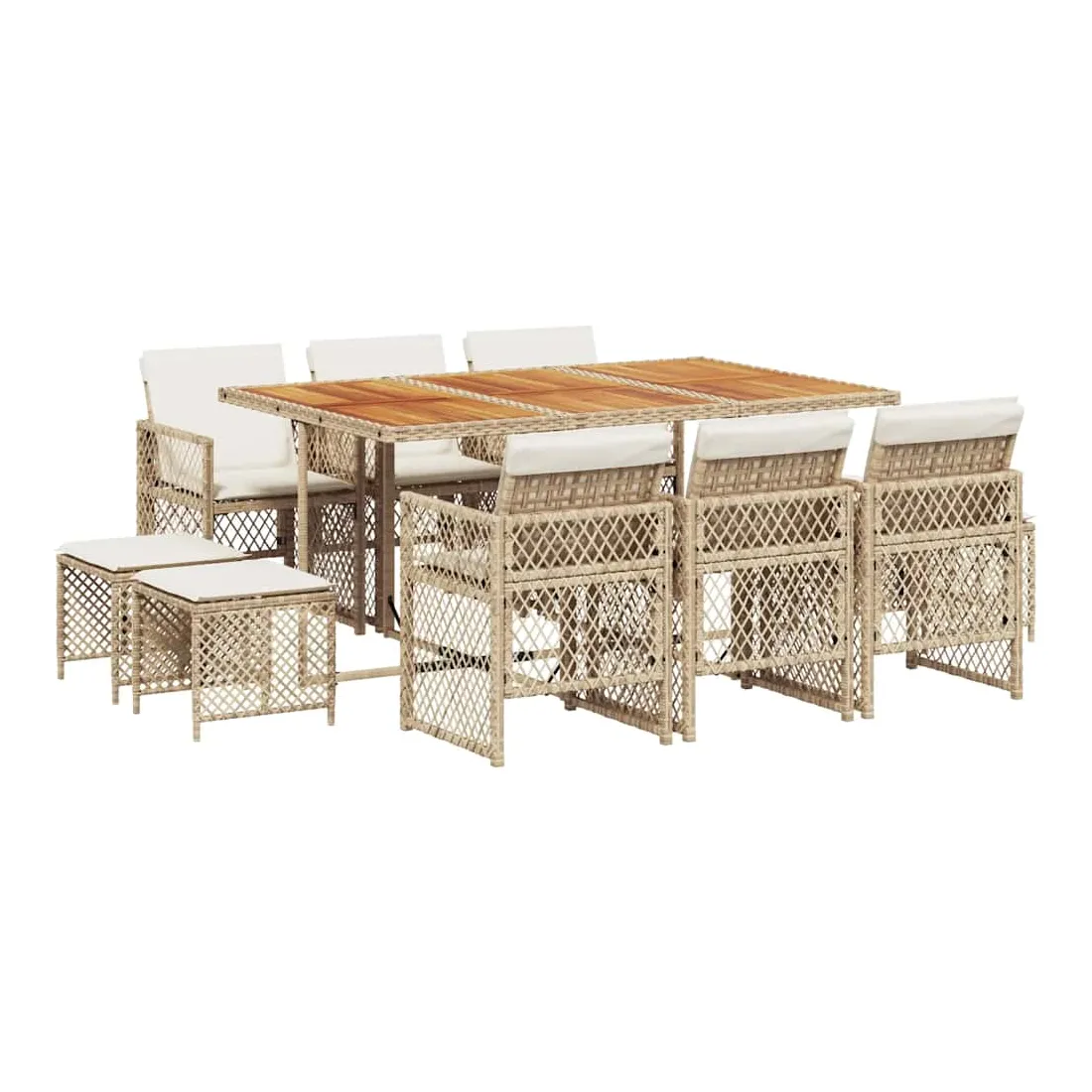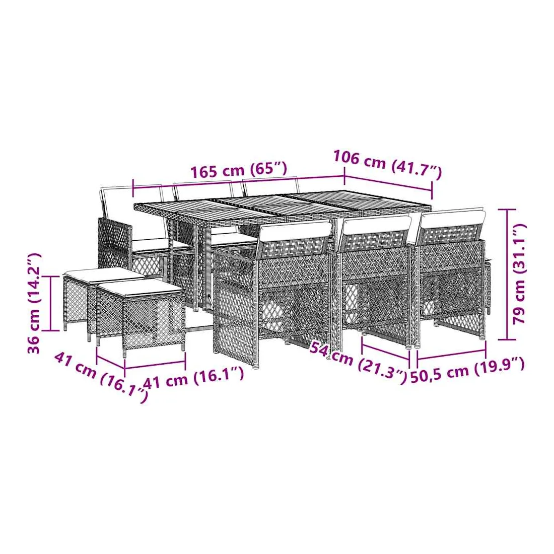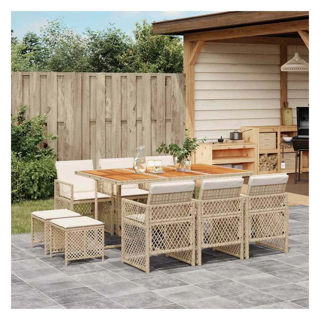 Cet ensemble de salle à manger de jardin est un excellent choix pour les repas en plein air ou pour vous détendre dans le jardin, l'arrière-cour ou le patio. Matériau durable : la résine tressée, également connue sous le nom de poly rotin, est un matériau synthétique solide et nécessitant peu d'entretien qui ressemble au rotin naturel. Elle est légère, facile à nettoyer et couramment utilisée pour les meubles d'extérieur en raison de sa durabilité et de ses propriétés de résistance aux intempéries. Dessus stable et facile à nettoyer : cette table de jardin a un dessus en bois d'acacia robuste, durable et facile à nettoyer avec un chiffon humide. Rangement compact : ces chaises sont dotées d'un dossier rabattable, ce qui permet de les ranger facilement sous la table. Une fois pliées, elles se rangent parfaitement sous la table, formant un cube peu encombrant. De plus, les tabourets peuvent également être rangés sous les chaises, maximisant encore davantage l'efficacité de l'espace. Expérience d'assise confortable : ce mobilier d'extérieur, doté de coussins épais, offre une expérience d'assise confortable. Housse amovible et lavable : ces coussins de siège sont dotés de housses amovibles pour un lavage et un entretien faciles. Les housses de coussin de chaise ont un rabat à l'arrière pour une fixation facile aux chaises. Bon à savoir :Pour que vos meubles d'extérieur restent beaux, nous vous recommandons de les protéger avec une housse imperméable.
