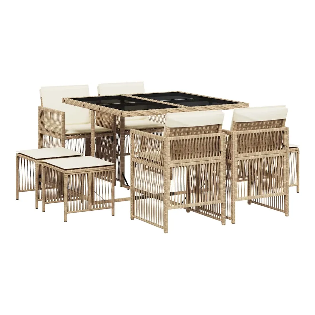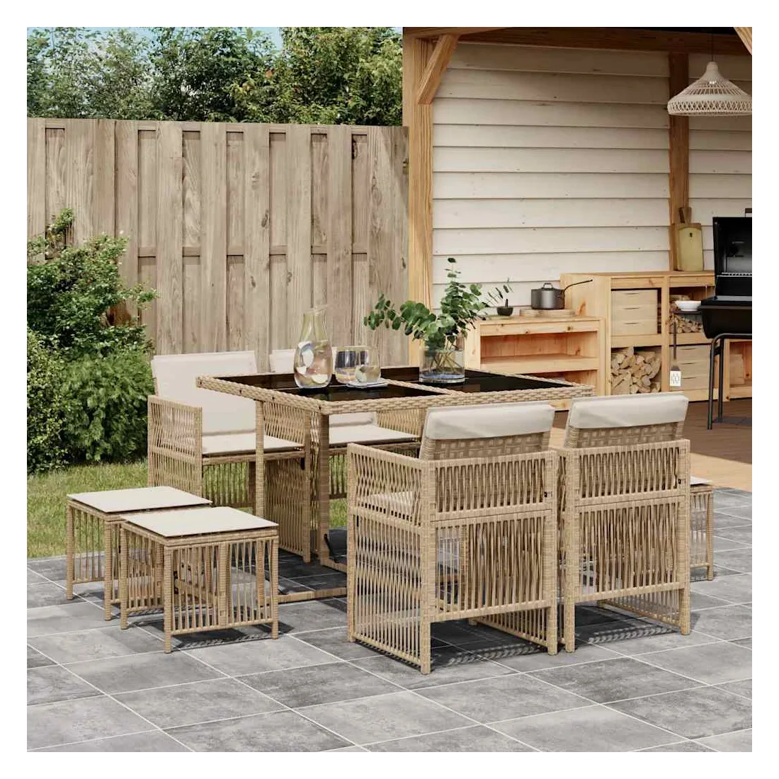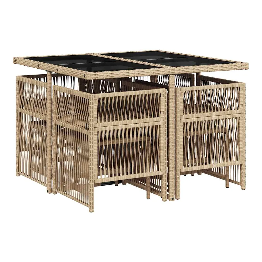 Cet ensemble de salle à manger de jardin est un excellent choix pour les repas en plein air ou pour vous détendre dans le jardin, dans l'arrière-cour ou sur la terrasse. Matériau durable : la résine tressée, également connue sous le nom de poly rotin, est un matériau synthétique solide et nécessitant peu d'entretien qui ressemble au rotin naturel. Il est léger, facile à nettoyer et couramment utilisé pour les meubles d'extérieur en raison de sa durabilité et de ses propriétés de résistance aux intempéries.Rangement compact : ces chaises sont dotées d'un dossier rabattable, ce qui permet de les ranger facilement sous la table. Une fois pliées, elles se rangent parfaitement sous la table, formant un cube peu encombrant. De plus, les tabourets peuvent également être rangés sous les chaises, maximisant encore davantage l'efficacité de l'espace.Expérience d'assise confortable : ce mobilier d'extérieur, doté de coussins épais, offre une expérience d'assise confortable.Housse amovible et lavable : ces coussins sont dotés de housses amovibles pour un lavage et un entretien faciles. Les housses de coussin ont un rabat à l'arrière pour une fixation facile aux dossiers.Dessus en verre : le dessus de la table d'extérieur est fabriqué en verre trempé solide et durable, ce qui le rend facile à nettoyer avec un chiffon humide et ajoute une touche d'élégance à votre espace extérieur. Bon à savoir : Pour que vos meubles d'extérieur restent beaux, nous vous recommandons de les protéger avec une housse imperméable.