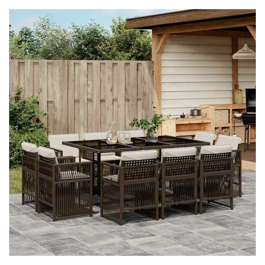 Cet ensemble de salle à manger de jardin est un excellent choix pour les repas en plein air ou pour vous détendre dans le jardin, dans l'arrière-cour ou sur la terrasse. Matériau durable : la résine tressée, également connue sous le nom de poly rotin, est un matériau synthétique solide et nécessitant peu d'entretien qui ressemble au rotin naturel. Il est léger, facile à nettoyer et couramment utilisé pour les meubles d'extérieur en raison de sa durabilité et de ses propriétés de résistance aux intempéries.Rangement compact : ces chaises sont dotées d'un dossier rabattable, ce qui permet de les ranger facilement sous la table. Une fois pliées, elles se rangent parfaitement sous la table, formant un cube peu encombrant.Expérience d'assise confortable : ce mobilier d'extérieur, doté de coussins épais, offre une expérience d'assise confortable.Housse amovible et lavable : ces coussins sont dotés de housses amovibles pour un lavage et un entretien faciles. Les housses de coussin ont un rabat à l'arrière pour une fixation facile aux dossiers.Dessus en verre : le dessus de la table d'extérieur est fabriqué en verre trempé solide et durable, ce qui le rend facile à nettoyer avec un chiffon humide et ajoute une touche d'élégance à votre espace extérieur. Bon à savoir : Pour que vos meubles d'extérieur restent beaux, nous vous recommandons de les protéger avec une housse imperméable.