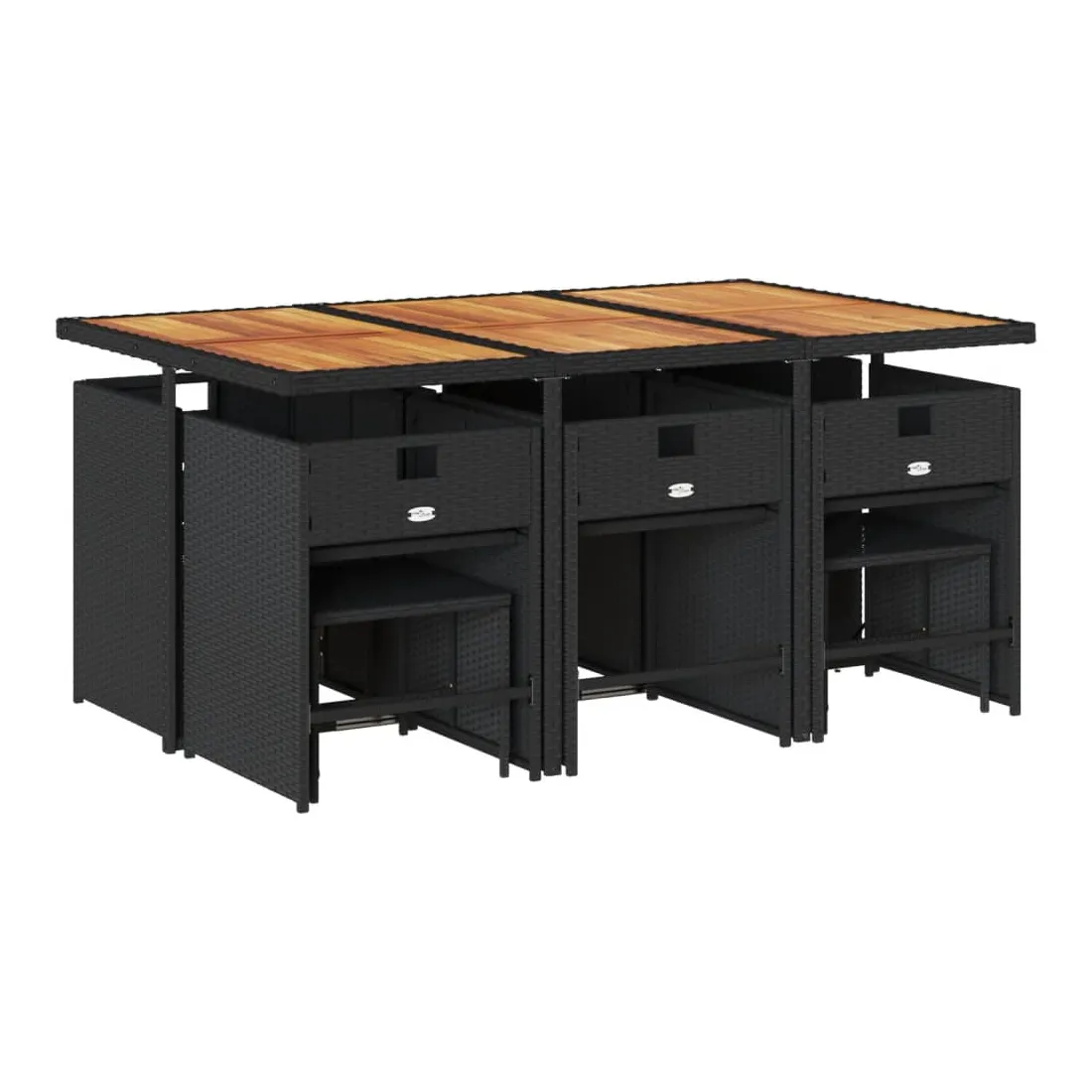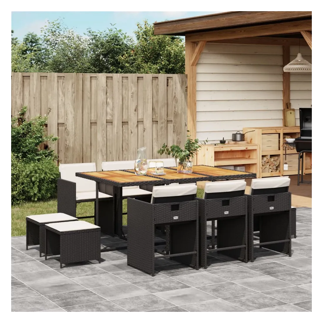 vidaXLCet ensemble de salle à manger de jardin est un excellent choix pour les repas en plein air ou pour vous détendre dans le jardin, dans l'arrière-cour ou sur la terrasse. Matériau durable : la résine tressée, également connue sous le nom de poly rotin, est un matériau synthétique solide et nécessitant peu d'entretien qui ressemble au rotin naturel. Il est léger, facile à nettoyer et couramment utilisé pour les meubles d'extérieur en raison de sa durabilité et de ses propriétés de résistance aux intempéries.Rangement compact : ces chaises sont dotées d'un dossier rabattable, ce qui permet de les ranger facilement sous la table. Une fois pliées, elles se rangent parfaitement sous la table, formant un cube peu encombrant. De plus, les tabourets peuvent également être rangés sous les chaises, maximisant encore davantage l'efficacité de l'espace.Expérience d'assise confortable : ce mobilier d'extérieur, doté de coussins bien rembourrés, offre une expérience d'assise confortable.Housse amovible et lavable : ces coussins de siège sont dotés de housses amovibles pour un lavage et un entretien faciles. Les housses de coussin de chaise ont un rabat à l'arrière pour une fixation facile aux chaises.Dessus stable et facile à nettoyer : cette table de jardin a un dessus en bois d'acacia robuste, durable et facile à nettoyer avec un chiffon humide. Bon à savoir : Pour que vos meubles d'extérieur restent beaux, nous vous recommandons de les protéger avec une housse imperméable.