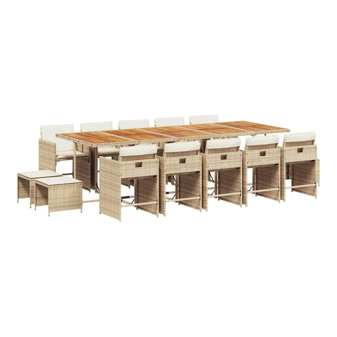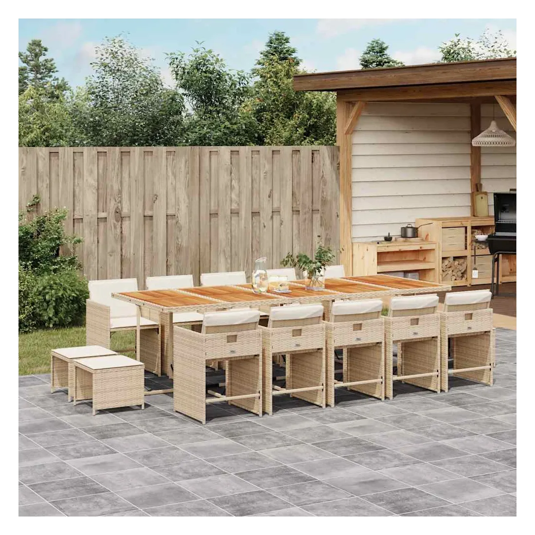 Cet ensemble de salle à manger de jardin est un excellent choix pour les repas en plein air ou pour vous détendre dans le jardin, dans l'arrière-cour ou sur la terrasse. Matériau durable : la résine tressée, également connue sous le nom de poly rotin, est un matériau synthétique solide et nécessitant peu d'entretien qui ressemble au rotin naturel. Il est léger, facile à nettoyer et couramment utilisé pour les meubles d'extérieur en raison de sa durabilité et de ses propriétés de résistance aux intempéries.Rangement compact : ces chaises sont dotées d'un dossier rabattable, ce qui permet de les ranger facilement sous la table. Une fois pliées, elles se rangent parfaitement sous la table, formant un cube peu encombrant. De plus, les tabourets peuvent également être rangés sous les chaises, maximisant encore davantage l'efficacité de l'espace.Expérience d'assise confortable : ce mobilier d'extérieur, doté de coussins épais, offre une expérience d'assise confortable.Housse amovible et lavable : ces coussins de siège sont dotés de housses amovibles pour un lavage et un entretien faciles. Les housses de coussin de chaise ont un rabat à l'arrière pour une fixation facile aux chaises.Dessus stable et facile à nettoyer : cette table de jardin a un dessus en bois d'acacia robuste, durable et facile à nettoyer avec un chiffon humide. Bon à savoir : Pour que vos meubles d'extérieur restent beaux, nous vous recommandons de les protéger avec une housse imperméable.