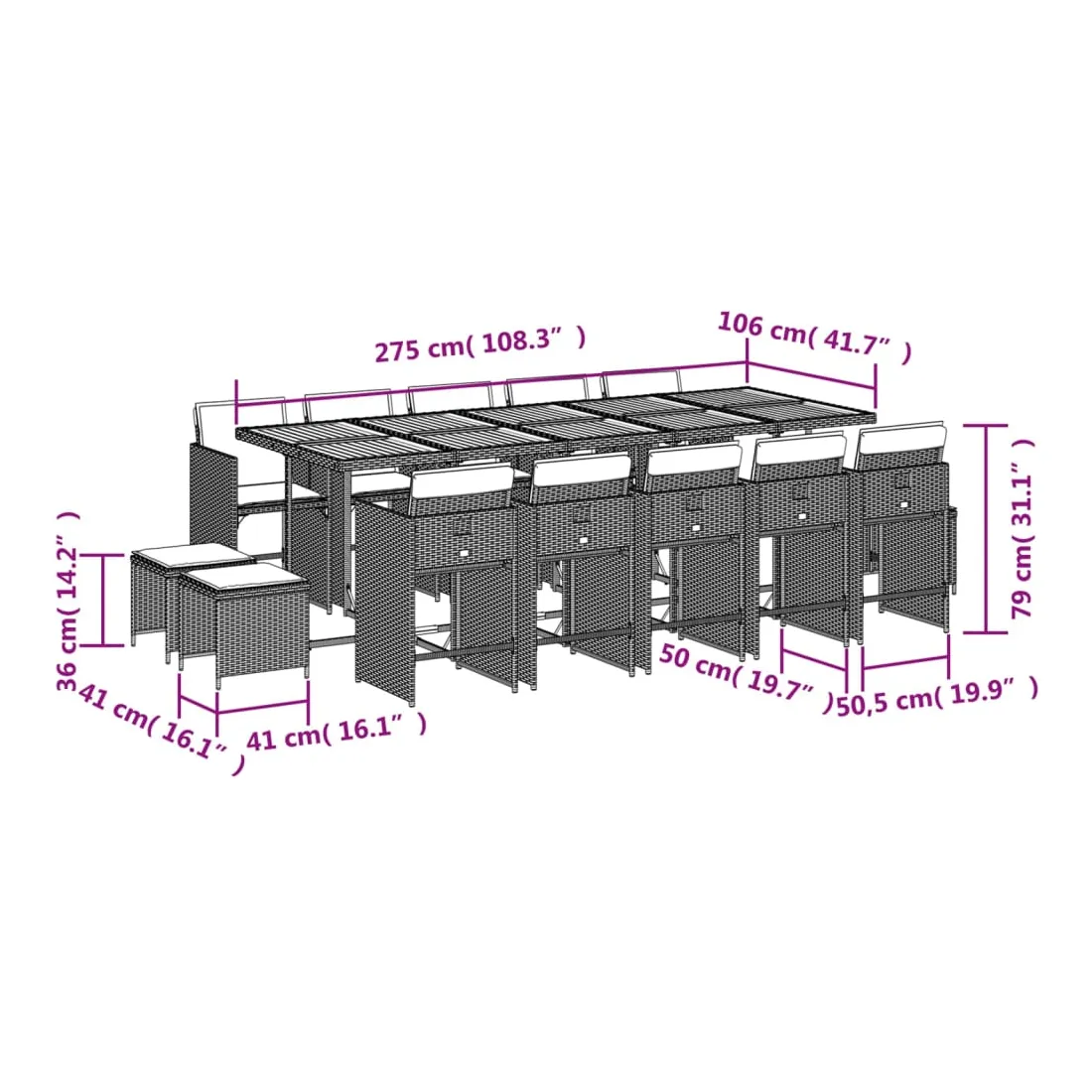 - Dimensions : 275 x 106 x 73 cm (L x l x H)
