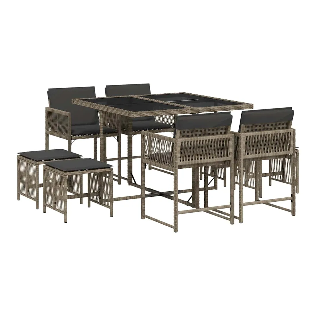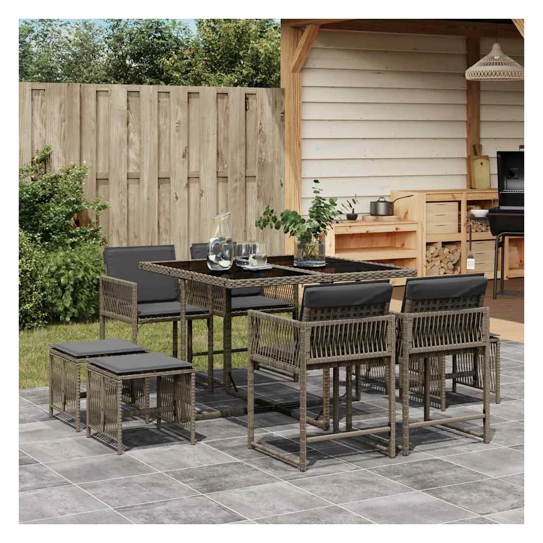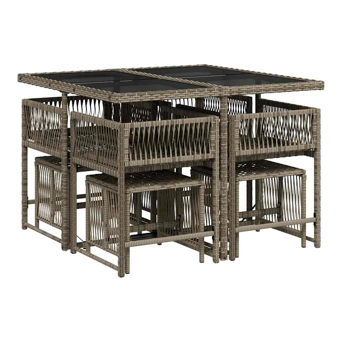 Cet ensemble de salle à manger de jardin est un excellent choix pour les repas en plein air ou pour vous détendre dans le jardin, dans l'arrière-cour ou sur la terrasse. Matériau durable : la résine tressée, également connue sous le nom de poly rotin, est un matériau synthétique solide et nécessitant peu d'entretien qui ressemble au rotin naturel. Il est léger, facile à nettoyer et couramment utilisé pour les meubles d'extérieur en raison de sa durabilité et de ses propriétés de résistance aux intempéries.Rangement compact : ces chaises sont dotées d'un dossier rabattable, ce qui permet de les ranger facilement sous la table. Une fois pliées, elles se rangent parfaitement sous la table, formant un cube peu encombrant. De plus, les tabourets peuvent également être rangés sous les chaises, maximisant encore davantage l'efficacité de l'espace.Expérience d'assise confortable : ce mobilier d'extérieur, doté de coussins épais, offre une expérience d'assise confortable.Housse amovible et lavable : ces coussins de siège sont dotés de housses amovibles pour un lavage et un entretien faciles. Les housses de coussin ont un rabat à l'arrière pour une fixation facile aux dossiers.Dessus en verre : le dessus de la table d'extérieur est fabriqué en verre trempé solide et durable, ce qui le rend facile à nettoyer avec un chiffon humide et ajoute une touche d'élégance à votre espace extérieur. Bon à savoir :Pour que vos meubles d'extérieur restent beaux, nous vous recommandons de les protéger avec une housse imperméable.