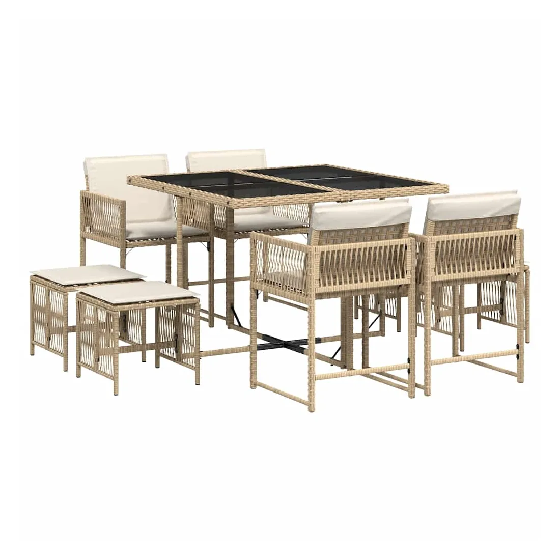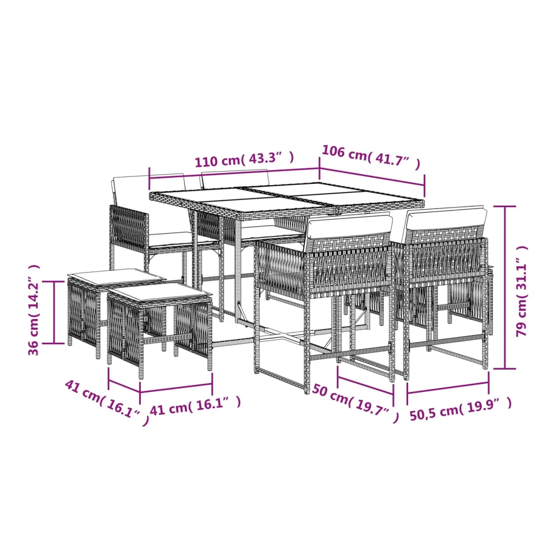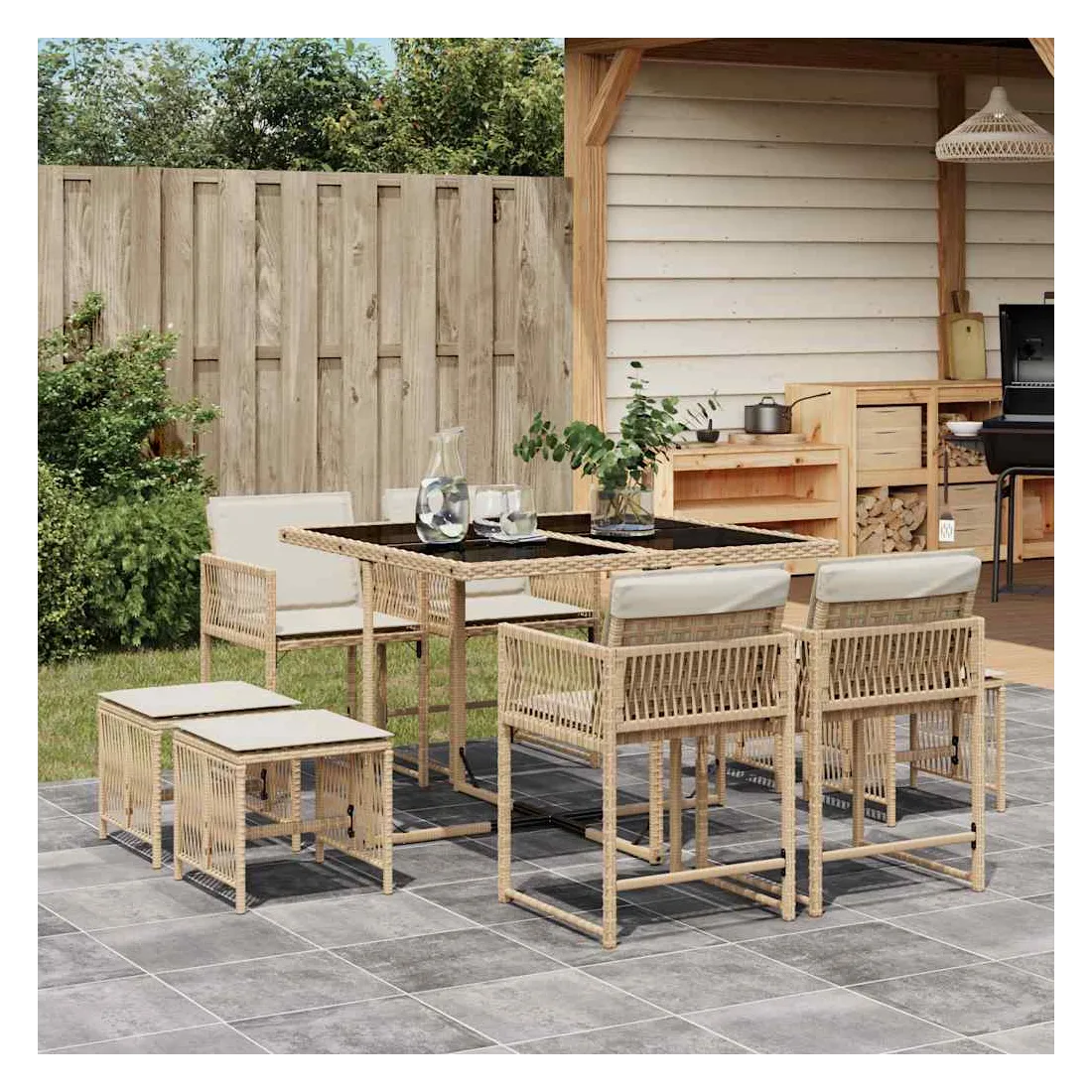 Cet ensemble de salle à manger de jardin est un excellent choix pour les repas en plein air ou pour vous détendre dans le jardin, dans l'arrière-cour ou sur la terrasse. Matériau durable : la résine tressée, également connue sous le nom de poly rotin, est un matériau synthétique solide et nécessitant peu d'entretien qui ressemble au rotin naturel. Il est léger, facile à nettoyer et couramment utilisé pour les meubles d'extérieur en raison de sa durabilité et de ses propriétés de résistance aux intempéries.Rangement compact : ces chaises sont dotées d'un dossier rabattable, ce qui permet de les ranger facilement sous la table. Une fois pliées, elles se rangent parfaitement sous la table, formant un cube peu encombrant. De plus, les tabourets peuvent également être rangés sous les chaises, maximisant encore davantage l'efficacité de l'espace.Expérience d'assise confortable : ce mobilier d'extérieur, doté de coussins épais, offre une expérience d'assise confortable.Housse amovible et lavable : ces coussins de siège sont dotés de housses amovibles pour un lavage et un entretien faciles. Les housses de coussin ont un rabat à l'arrière pour une fixation facile aux dossiers.Dessus en verre : le dessus de la table d'extérieur est fabriqué en verre trempé solide et durable, ce qui le rend facile à nettoyer avec un chiffon humide et ajoute une touche d'élégance à votre espace extérieur. Bon à savoir :Pour que vos meubles d'extérieur restent beaux, nous vous recommandons de les protéger avec une housse imperméable.