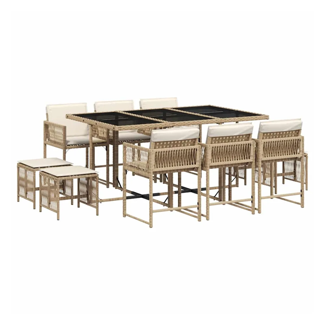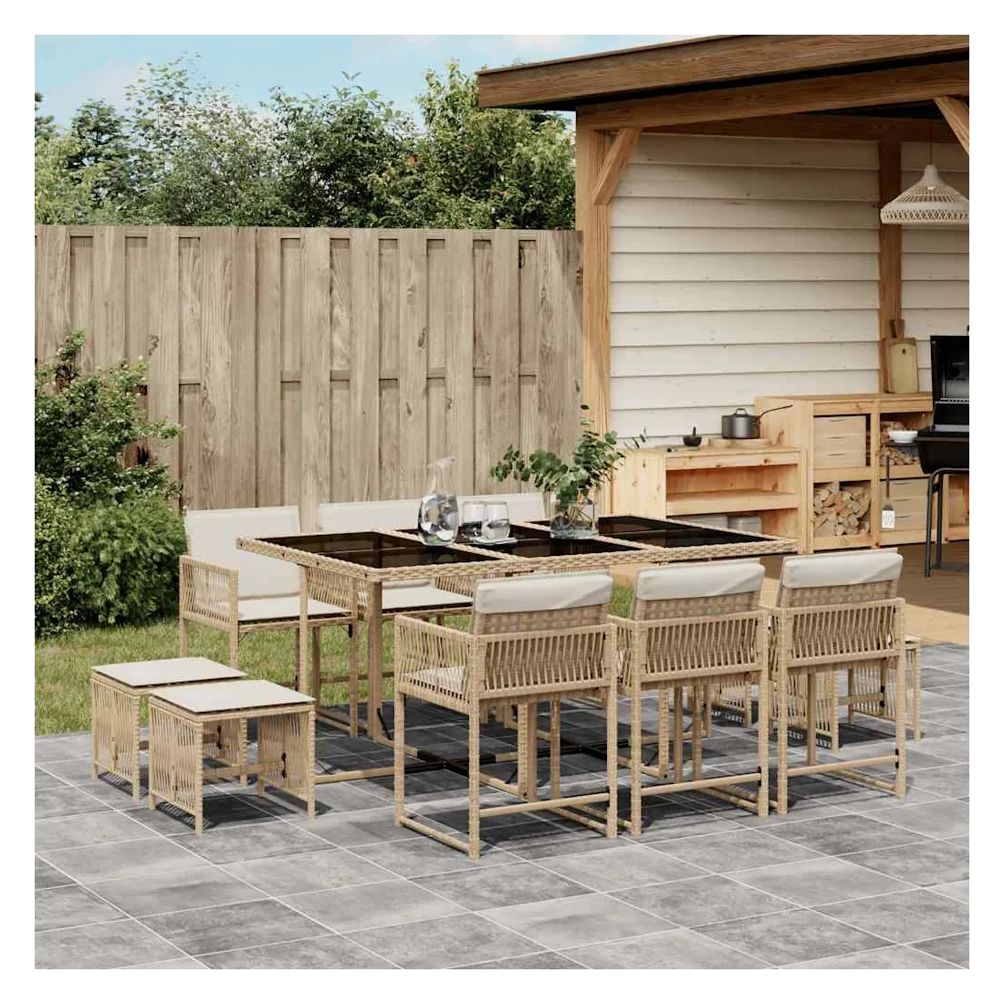 Cet ensemble de salle à manger de jardin est un excellent choix pour les repas en plein air ou pour vous détendre dans le jardin, dans l'arrière-cour ou sur la terrasse. Matériau durable : la résine tressée, également connue sous le nom de poly rotin, est un matériau synthétique solide et nécessitant peu d'entretien qui ressemble au rotin naturel. Il est léger, facile à nettoyer et couramment utilisé pour les meubles d'extérieur en raison de sa durabilité et de ses propriétés de résistance aux intempéries.Rangement compact : ces chaises sont dotées d'un dossier rabattable, ce qui permet de les ranger facilement sous la table. Une fois pliées, elles se rangent parfaitement sous la table, formant un cube peu encombrant. De plus, les tabourets peuvent également être rangés sous les chaises, maximisant encore davantage l'efficacité de l'espace.Expérience d'assise confortable : ce mobilier d'extérieur, doté de coussins épais, offre une expérience d'assise confortable.Housse amovible et lavable : ces coussins de siège sont dotés de housses amovibles pour un lavage et un entretien faciles. Les housses de coussin ont un rabat à l'arrière pour une fixation facile aux dossiers.Dessus en verre : le dessus de la table d'extérieur est fabriqué en verre trempé solide et durable, ce qui le rend facile à nettoyer avec un chiffon humide et ajoute une touche d'élégance à votre espace extérieur. Bon à savoir :Pour que vos meubles d'extérieur restent beaux, nous vous recommandons de les protéger avec une housse imperméable.