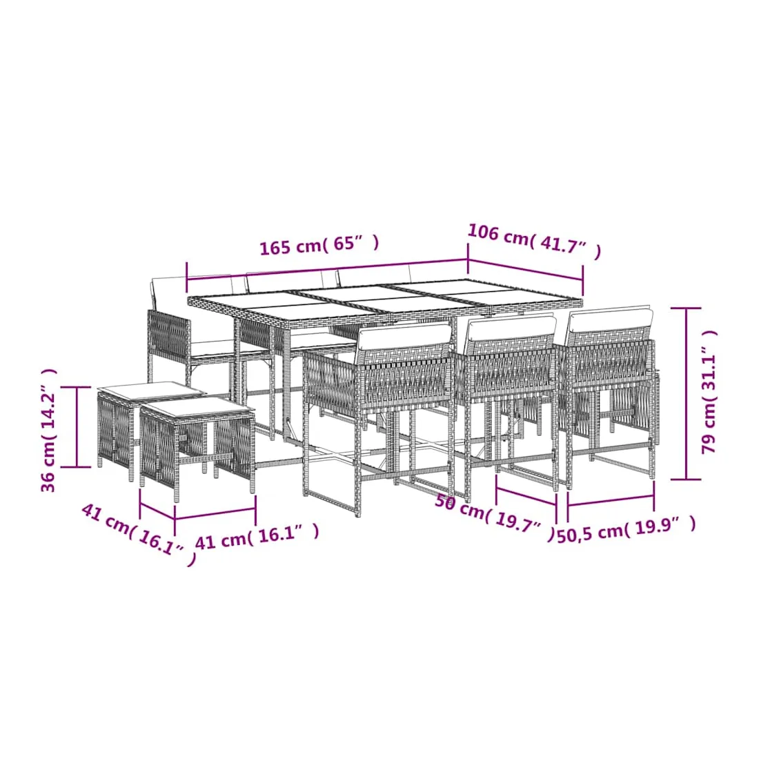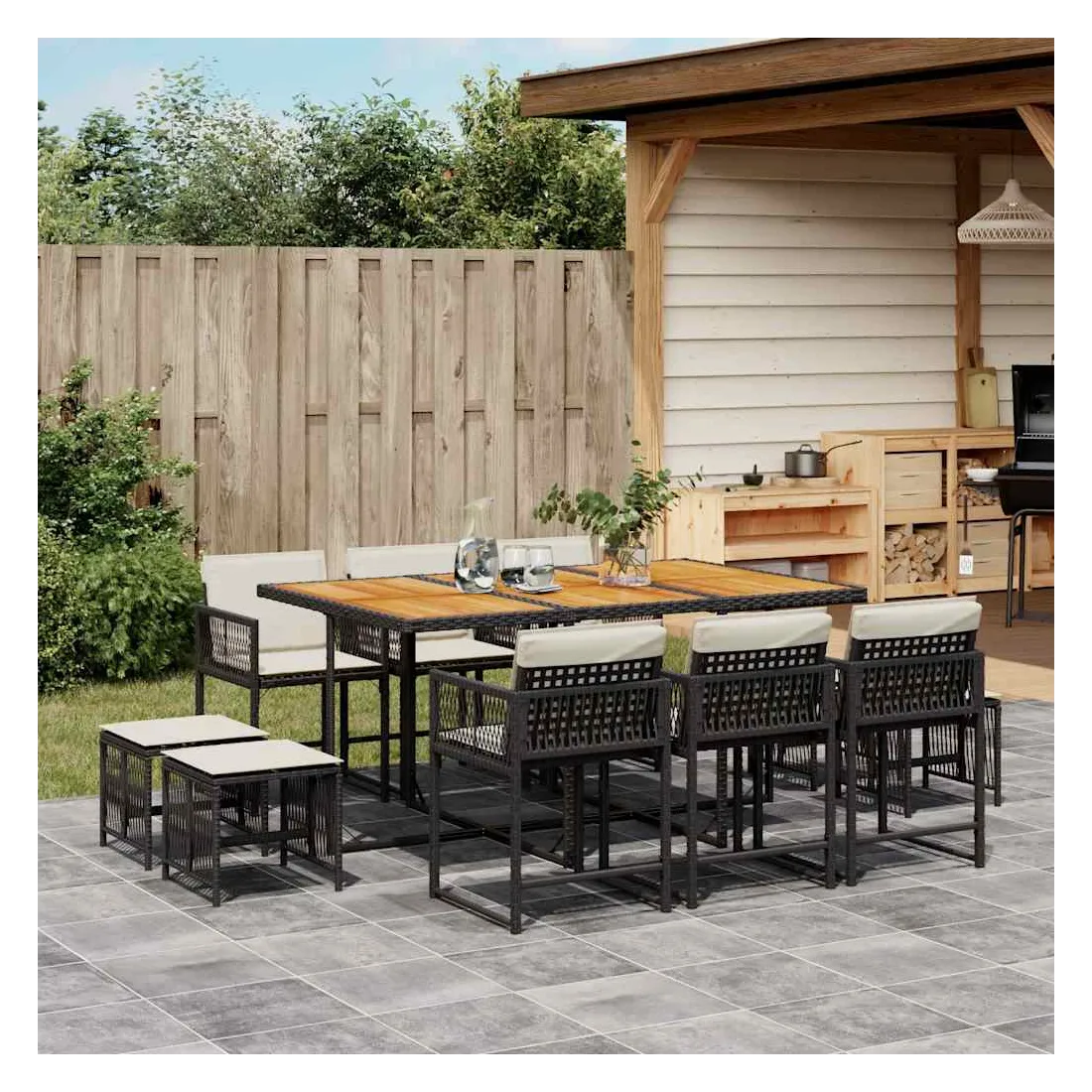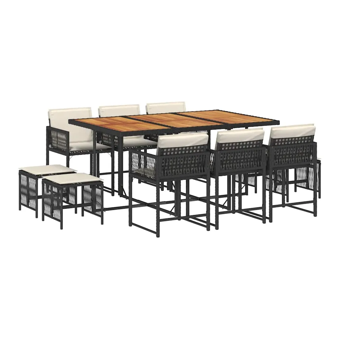 Cet ensemble de salle à manger de jardin est un excellent choix pour les repas en plein air ou pour vous détendre dans le jardin, dans l'arrière-cour ou sur la terrasse. Matériau durable : la résine tressée, également connue sous le nom de poly rotin, est un matériau synthétique solide et nécessitant peu d'entretien qui ressemble au rotin naturel. Il est léger, facile à nettoyer et couramment utilisé pour les meubles d'extérieur en raison de sa durabilité et de ses propriétés de résistance aux intempéries.Rangement compact : ces chaises sont dotées d'un dossier rabattable, ce qui permet de les ranger facilement sous la table. Une fois pliées, elles se rangent parfaitement sous la table, formant un cube peu encombrant. De plus, les tabourets peuvent également être rangés sous les chaises, maximisant encore davantage l'efficacité de l'espace.Expérience d'assise confortable : ce mobilier d'extérieur, doté de coussins épais, offre une expérience d'assise confortable.Housse amovible et lavable : ces coussins de siège sont dotés de housses amovibles pour un lavage et un entretien faciles. Les housses de coussin ont un rabat à l'arrière pour une fixation facile aux dossiers.Dessus stable et facile à nettoyer : cette table de jardin a un dessus en bois d'acacia robuste, durable et facile à nettoyer avec un chiffon humide. Bon à savoir :Pour que vos meubles d'extérieur restent beaux, nous vous recommandons de les protéger avec une housse imperméable.