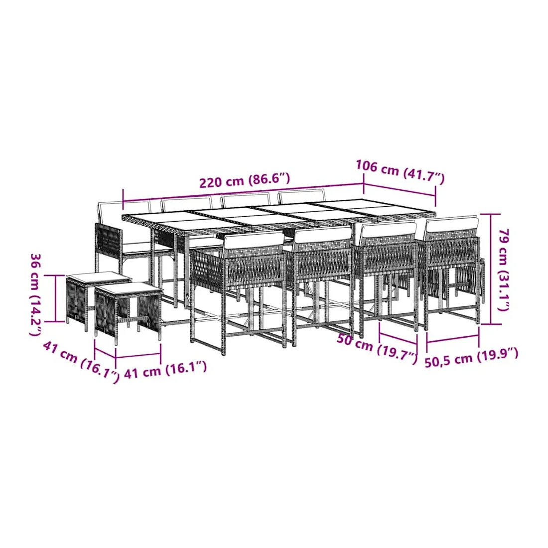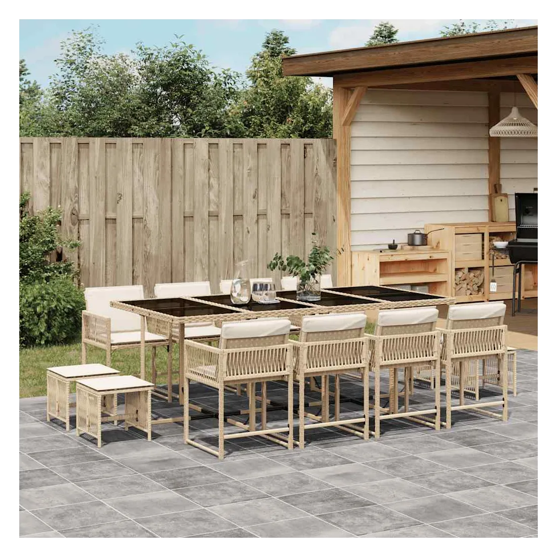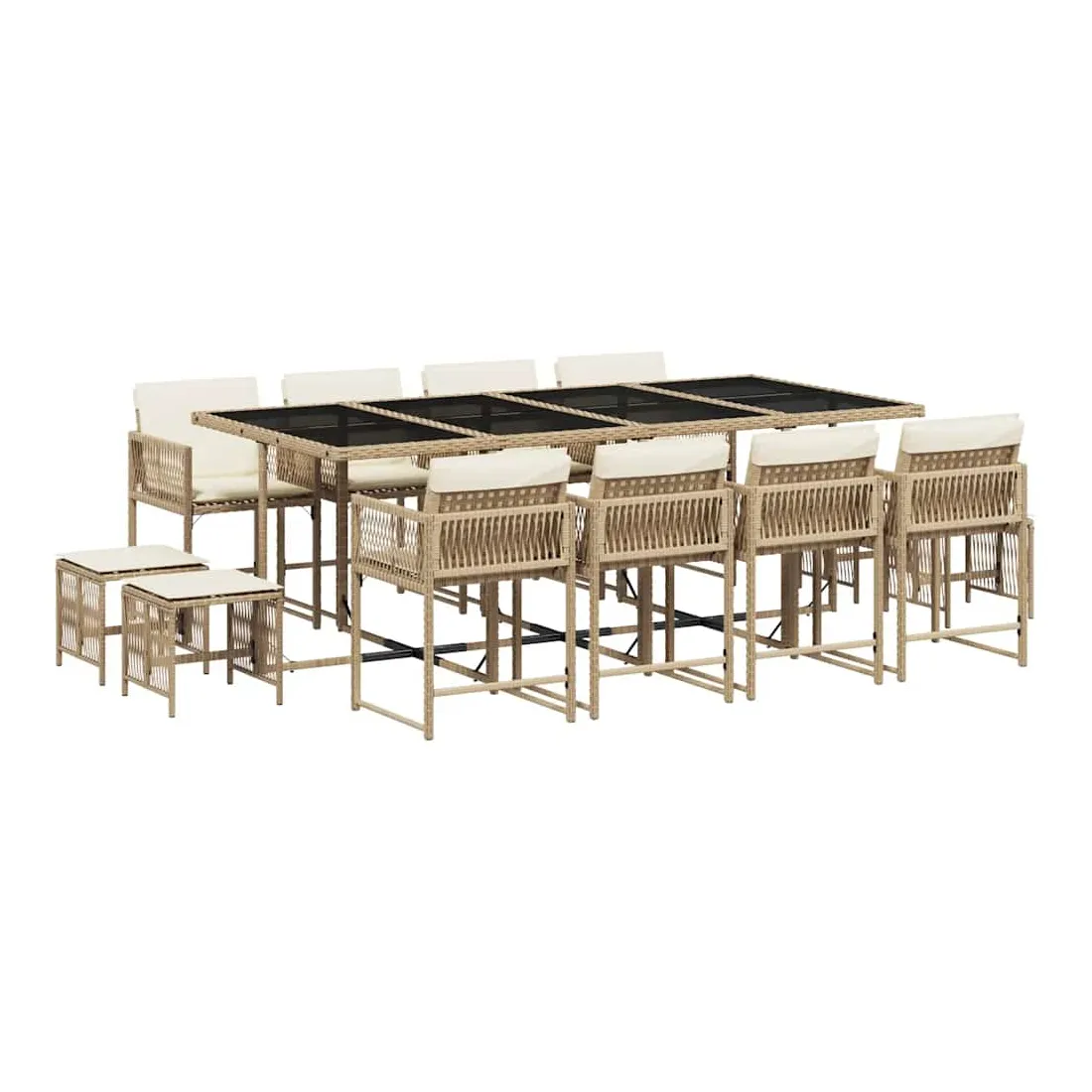 Cet ensemble de salle à manger de jardin est un excellent choix pour les repas en plein air ou pour vous détendre dans le jardin, dans l'arrière-cour ou sur la terrasse. Matériau durable : la résine tressée, également connue sous le nom de poly rotin, est un matériau synthétique solide et nécessitant peu d'entretien qui ressemble au rotin naturel. Il est léger, facile à nettoyer et couramment utilisé pour les meubles d'extérieur en raison de sa durabilité et de ses propriétés de résistance aux intempéries.Rangement compact : ces chaises sont dotées d'un dossier rabattable, ce qui permet de les ranger facilement sous la table. Une fois pliées, elles se rangent parfaitement sous la table, formant un cube peu encombrant. De plus, les tabourets peuvent également être rangés sous les chaises, maximisant encore davantage l'efficacité de l'espace.Expérience d'assise confortable : ce mobilier d'extérieur, doté de coussins épais, offre une expérience d'assise confortable.Housse amovible et lavable : ces coussins de siège sont dotés de housses amovibles pour un lavage et un entretien faciles. Les housses de coussin ont un rabat à l'arrière pour une fixation facile aux dossiers.Dessus en verre : le dessus de la table d'extérieur est fabriqué en verre trempé solide et durable, ce qui le rend facile à nettoyer avec un chiffon humide et ajoute une touche d'élégance à votre espace extérieur. Bon à savoir :Pour que vos meubles d'extérieur restent beaux, nous vous recommandons de les protéger avec une housse imperméable.