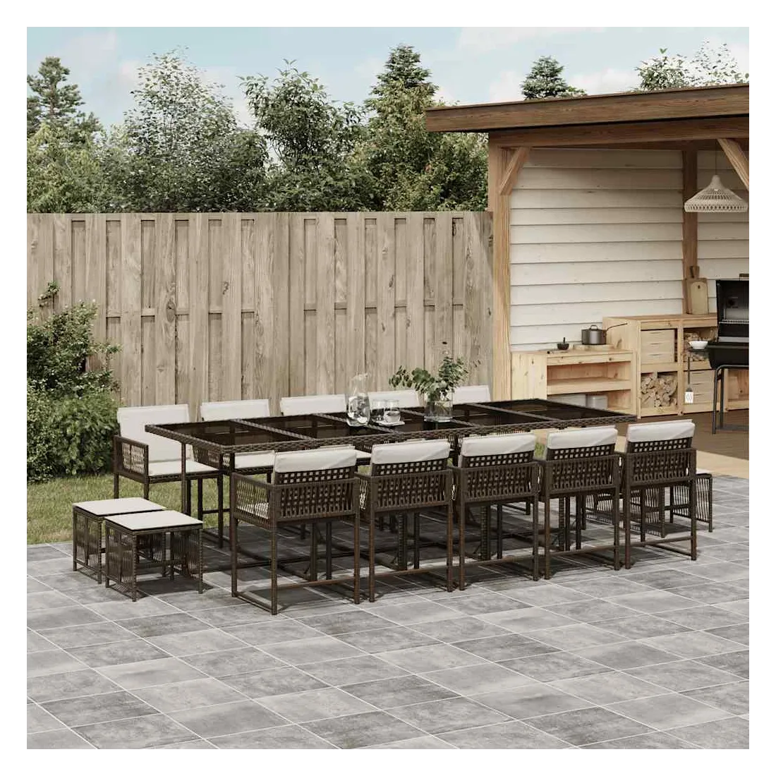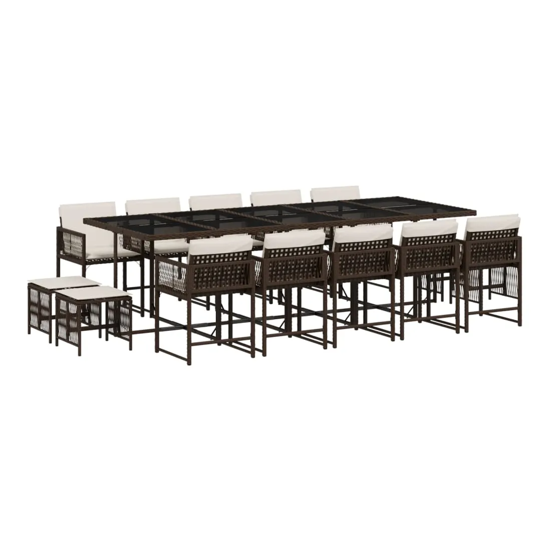 Cet ensemble de salle à manger de jardin est un excellent choix pour les repas en plein air ou pour vous détendre dans le jardin, dans l'arrière-cour ou sur la terrasse. Matériau durable : la résine tressée, également connue sous le nom de poly rotin, est un matériau synthétique solide et nécessitant peu d'entretien qui ressemble au rotin naturel. Il est léger, facile à nettoyer et couramment utilisé pour les meubles d'extérieur en raison de sa durabilité et de ses propriétés de résistance aux intempéries.Rangement compact : ces chaises sont dotées d'un dossier rabattable, ce qui permet de les ranger facilement sous la table. Une fois pliées, elles se rangent parfaitement sous la table, formant un cube peu encombrant. De plus, les tabourets peuvent également être rangés sous les chaises, maximisant encore davantage l'efficacité de l'espace.Expérience d'assise confortable : ce mobilier d'extérieur, doté de coussins épais, offre une expérience d'assise confortable.Housse amovible et lavable : ces coussins de siège sont dotés de housses amovibles pour un lavage et un entretien faciles. Les housses de coussin ont un rabat à l'arrière pour une fixation facile aux dossiers.Dessus en verre : le dessus de la table d'extérieur est fabriqué en verre trempé solide et durable, ce qui le rend facile à nettoyer avec un chiffon humide et ajoute une touche d'élégance à votre espace extérieur. Bon à savoir :Pour que vos meubles d'extérieur restent beaux, nous vous recommandons de les protéger avec une housse imperméable.