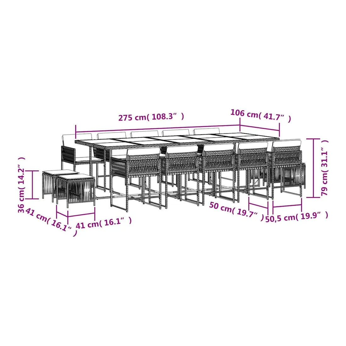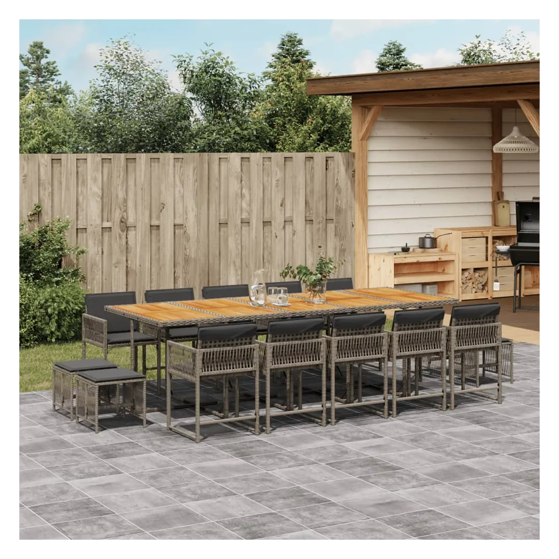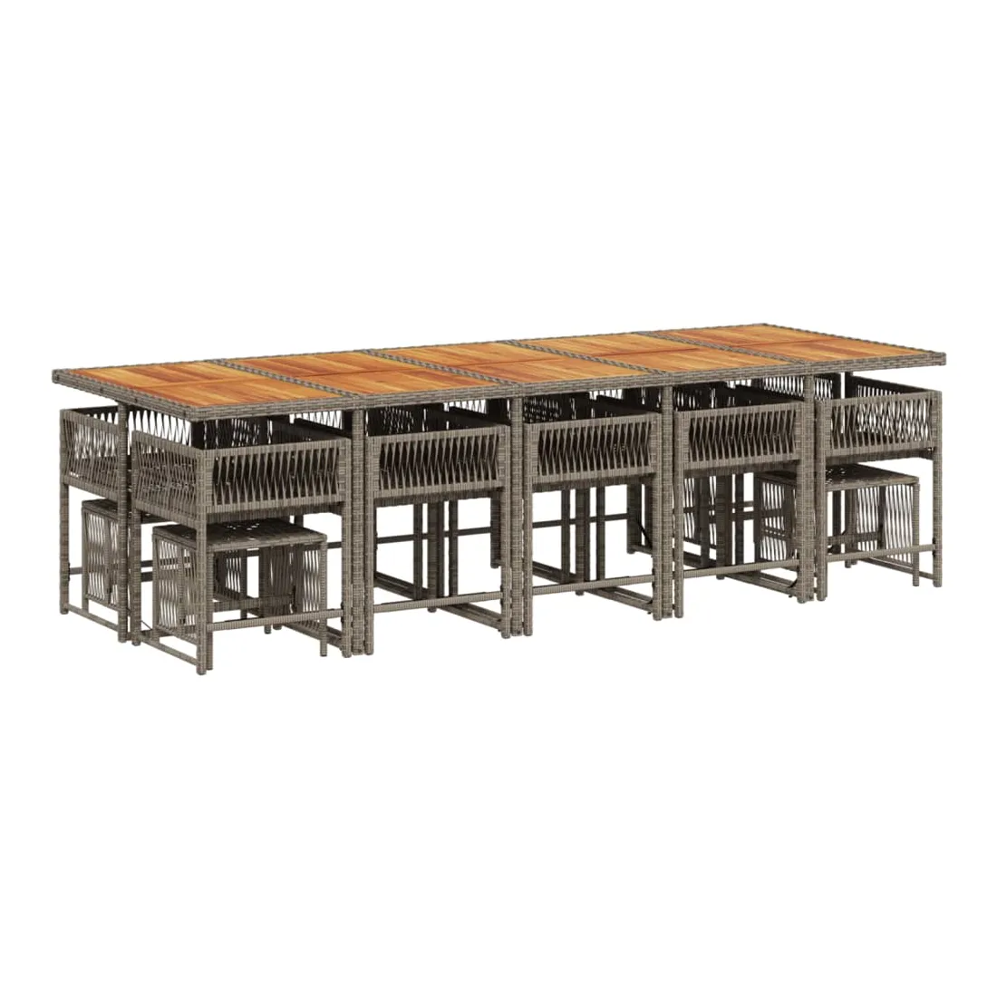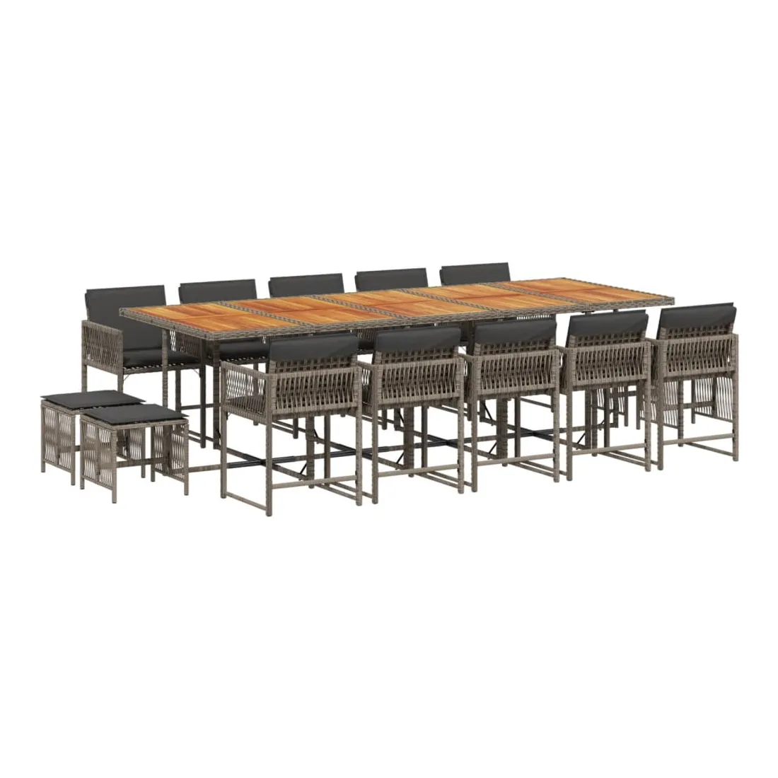 Cet ensemble de salle à manger de jardin est un excellent choix pour les repas en plein air ou pour vous détendre dans le jardin, dans l'arrière-cour ou sur la terrasse. Matériau durable : la résine tressée, également connue sous le nom de poly rotin, est un matériau synthétique solide et nécessitant peu d'entretien qui ressemble au rotin naturel. Il est léger, facile à nettoyer et couramment utilisé pour les meubles d'extérieur en raison de sa durabilité et de ses propriétés de résistance aux intempéries.Rangement compact : ces chaises sont dotées d'un dossier rabattable, ce qui permet de les ranger facilement sous la table. Une fois pliées, elles se rangent parfaitement sous la table, formant un cube peu encombrant. De plus, les tabourets peuvent également être rangés sous les chaises, maximisant encore davantage l'efficacité de l'espace.Expérience d'assise confortable : ce mobilier d'extérieur, doté de coussins épais, offre une expérience d'assise confortable.Housse amovible et lavable : ces coussins de siège sont dotés de housses amovibles pour un lavage et un entretien faciles. Les housses de coussin ont un rabat à l'arrière pour une fixation facile aux dossiers.Dessus stable et facile à nettoyer : cette table de jardin a un dessus en bois d'acacia robuste, durable et facile à nettoyer avec un chiffon humide. Bon à savoir :Pour que vos meubles d'extérieur restent beaux, nous vous recommandons de les protéger avec une housse imperméable.