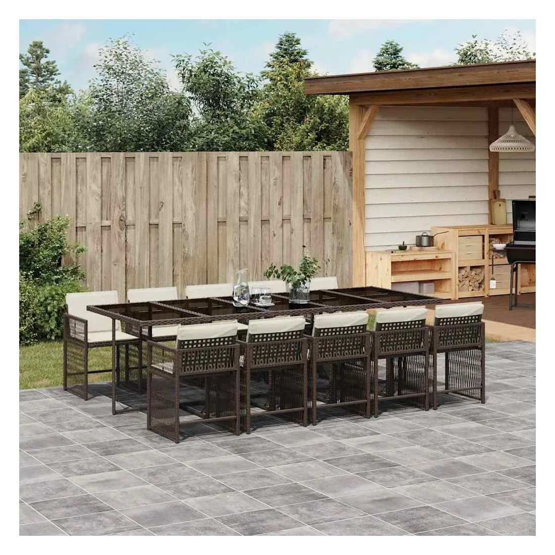 Cet ensemble de salle à manger de jardin est un excellent choix pour les repas en plein air ou pour vous détendre dans le jardin, l'arrière-cour ou le patio. Matériau durable : la résine tressée, également connue sous le nom de poly rotin, est un matériau synthétique solide et nécessitant peu d'entretien qui ressemble au rotin naturel. Il est léger, facile à nettoyer et couramment utilisé pour les meubles d'extérieur en raison de sa durabilité et de ses propriétés de résistance aux intempéries.Rangement compact : ces chaises sont dotées d'un dossier rabattable, ce qui permet de les ranger facilement sous la table. Une fois pliées, elles se rangent parfaitement sous la table, formant un cube peu encombrant.Expérience d'assise confortable : ce mobilier d'extérieur, doté de coussins épais, offre une expérience d'assise confortable.Housse amovible et lavable : ces coussins de siège sont dotés de housses amovibles pour un lavage et un entretien faciles. Les housses de coussin ont un rabat à l'arrière pour une fixation facile aux dossiers.Dessus en verre : le dessus de la table d'extérieur est fabriqué en verre trempé solide et durable, ce qui le rend facile à nettoyer avec un chiffon humide et ajoute une touche d'élégance à votre espace extérieur. Bon à savoir :Pour que vos meubles d'extérieur restent beaux, nous vous recommandons de les protéger avec une housse imperméable.