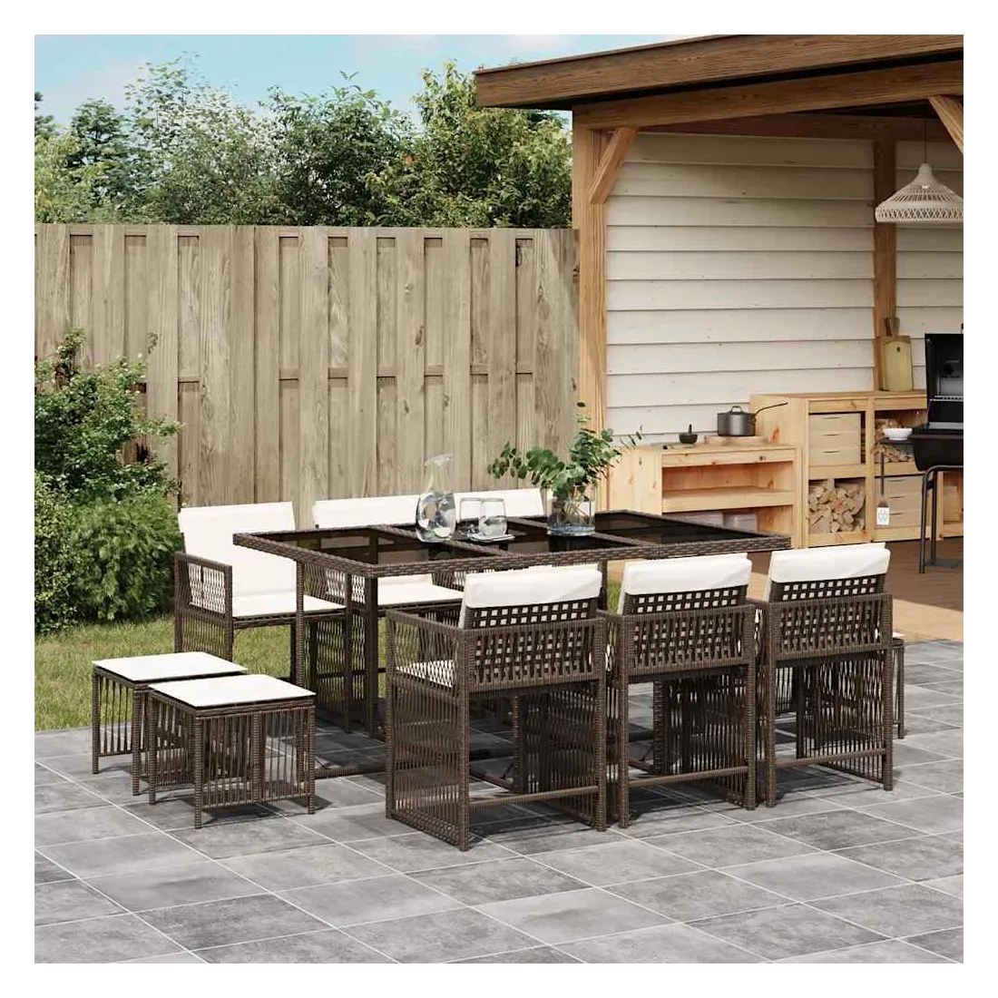 Cet ensemble de salle à manger de jardin est un excellent choix pour les repas en plein air ou pour vous détendre dans le jardin, l'arrière-cour ou le patio. Matériau durable : la résine tressée, également connue sous le nom de poly rotin, est un matériau synthétique solide et nécessitant peu d'entretien qui ressemble au rotin naturel. Il est léger, facile à nettoyer et couramment utilisé pour les meubles d'extérieur en raison de sa durabilité et de ses propriétés de résistance aux intempéries.Rangement compact : ces chaises sont dotées d'un dossier rabattable, ce qui permet de les ranger facilement sous la table. Une fois pliées, elles se rangent parfaitement sous la table, formant un cube peu encombrant.Expérience d'assise confortable : ce mobilier d'extérieur, doté de coussins épais, offre une expérience d'assise confortable.Housse amovible et lavable : ces coussins de siège sont dotés de housses amovibles pour un lavage et un entretien faciles. Les housses de coussin ont un rabat à l'arrière pour une fixation facile aux dossiers.Dessus en verre : le dessus de la table d'extérieur est fabriqué en verre trempé solide et durable, ce qui le rend facile à nettoyer avec un chiffon humide et ajoute une touche d'élégance à votre espace extérieur. Bon à savoir :Pour que vos meubles d'extérieur restent beaux, nous vous recommandons de les protéger avec une housse imperméable.