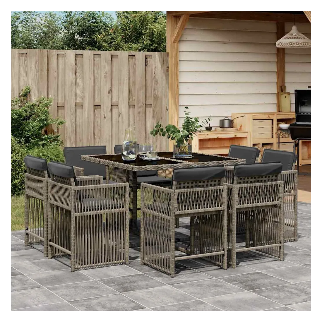 Cet ensemble de salle à manger de jardin est un excellent choix pour les repas en plein air ou pour vous détendre dans le jardin, l'arrière-cour ou le patio. Matériau durable : la résine tressée, également connue sous le nom de poly rotin, est un matériau synthétique solide et nécessitant peu d'entretien qui ressemble au rotin naturel. Il est léger, facile à nettoyer et couramment utilisé pour les meubles d'extérieur en raison de sa durabilité et de ses propriétés de résistance aux intempéries.Rangement compact : ces chaises sont dotées d'un dossier rabattable, ce qui permet de les ranger facilement sous la table. Une fois pliées, elles se rangent parfaitement sous la table, formant un cube peu encombrant.Expérience d'assise confortable : ce mobilier d'extérieur, doté de coussins épais, offre une expérience d'assise confortable.Housse amovible et lavable : ces coussins de siège sont dotés de housses amovibles pour un lavage et un entretien faciles. Les housses de coussin ont un rabat à l'arrière pour une fixation facile aux dossiers.Dessus en verre : le dessus de la table d'extérieur est fabriqué en verre trempé solide et durable, ce qui le rend facile à nettoyer avec un chiffon humide et ajoute une touche d'élégance à votre espace extérieur. Bon à savoir :Pour que vos meubles d'extérieur restent beaux, nous vous recommandons de les protéger avec une housse imperméable.