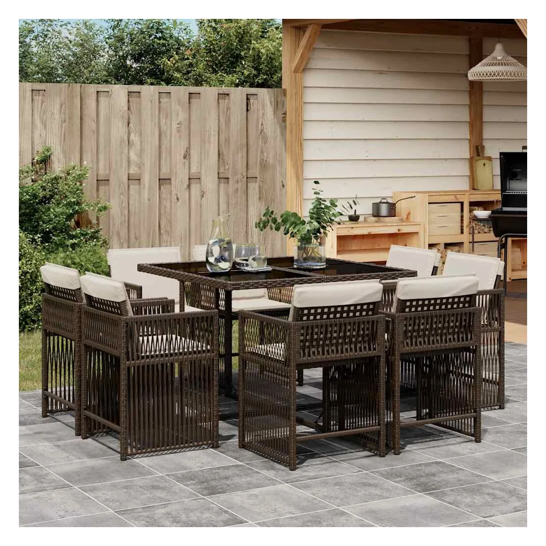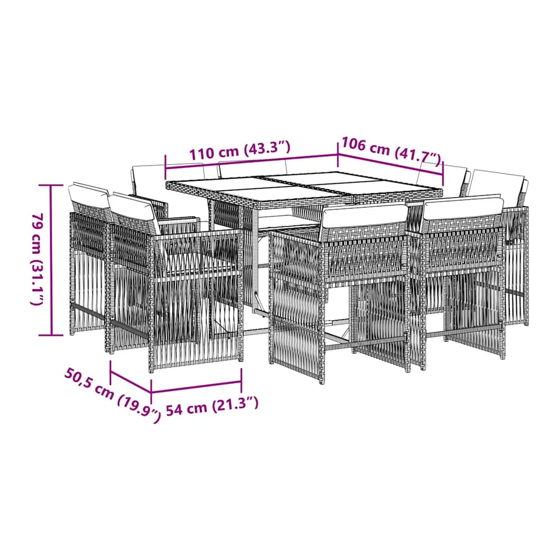 Cet ensemble de salle à manger de jardin est un excellent choix pour les repas en plein air ou pour vous détendre dans le jardin, l'arrière-cour ou le patio. Matériau durable : la résine tressée, également connue sous le nom de poly rotin, est un matériau synthétique solide et nécessitant peu d'entretien qui ressemble au rotin naturel. Il est léger, facile à nettoyer et couramment utilisé pour les meubles d'extérieur en raison de sa durabilité et de ses propriétés de résistance aux intempéries.Rangement compact : ces chaises sont dotées d'un dossier rabattable, ce qui permet de les ranger facilement sous la table. Une fois pliées, elles se rangent parfaitement sous la table, formant un cube peu encombrant.Expérience d'assise confortable : ce mobilier d'extérieur, doté de coussins épais, offre une expérience d'assise confortable.Housse amovible et lavable : ces coussins de siège sont dotés de housses amovibles pour un lavage et un entretien faciles. Les housses de coussin ont un rabat à l'arrière pour une fixation facile aux dossiers.Dessus en verre : le dessus de la table d'extérieur est fabriqué en verre trempé solide et durable, ce qui le rend facile à nettoyer avec un chiffon humide et ajoute une touche d'élégance à votre espace extérieur. Bon à savoir :Pour que vos meubles d'extérieur restent beaux, nous vous recommandons de les protéger avec une housse imperméable.