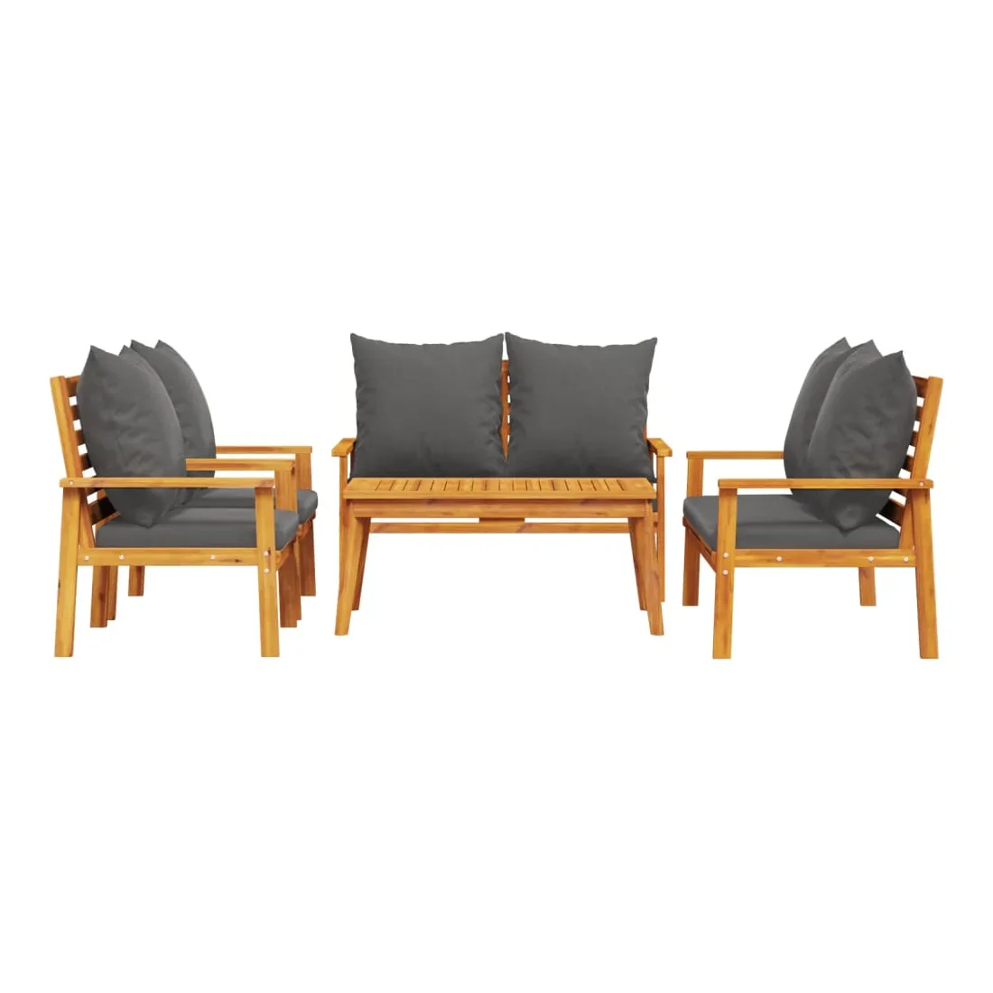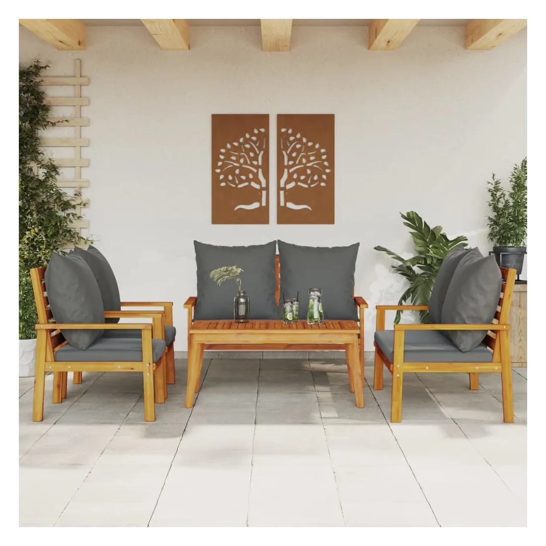 Cet ensemble de salon de jardin en bois a un design élégant et constitue un excellent choix pour vous détendre et profiter du jardin ou du patio. Bois d'acacia massif : l'ensemble de salon d'extérieur est fabriqué en bois d'acacia massif pour plus de robustesse et de stabilité. Le bois d'acacia solide est un beau matériau naturel. Le bois d'acacia a de beaux grains de bois qui rendent chaque meuble unique et légèrement différent les uns des autres.Expérience d'assise confortable : doté d'accoudoirs et d'un dossier, l'ensemble de salon de terrasse vous offre le plus grand confort. De plus, les coussins bien rembourrés offrent du confort pendant votre temps d'assise.Dessus stable et facile à nettoyer : cette table de jardin a un dessus en bois d'acacia robuste, durable et facile à nettoyer avec un chiffon humide.Nombreuses applications : le siège de jardin est parfait pour tout porche avant, patio, arrière-cour, pelouse, jardin, etc. Bon à savoir :Pour que vos meubles d'extérieur restent beaux, nous vous recommandons de les protéger avec une housse imperméable.
