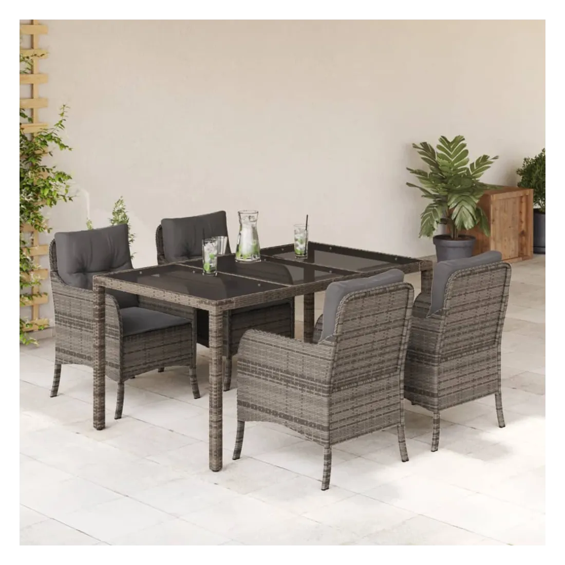 Cet ensemble de salle à manger de jardin est un excellent choix pour les repas en plein air ou pour vous détendre dans le jardin, l'arrière-cour ou le patio. Matériau durable : la résine tressée, également connue sous le nom de poly rotin, est un matériau synthétique solide et nécessitant peu d'entretien qui ressemble au rotin naturel. Il est léger, facile à nettoyer et couramment utilisé pour les meubles d'extérieur en raison de sa durabilité et de ses propriétés de résistance aux intempéries.Expérience d'assise confortable : ce mobilier d'extérieur, doté de coussins épais, offre une expérience d'assise confortable.Housse amovible et lavable : ces coussins de siège sont dotés de housses amovibles pour un lavage et un entretien faciles. Les housses de coussin de chaise ont un rabat à l'arrière pour une fixation facile aux chaises.Dessus en verre : le dessus de la table d'extérieur est fabriqué en verre trempé solide et durable, ce qui le rend facile à nettoyer avec un chiffon humide et ajoute une touche d'élégance à votre espace extérieur.Cadre robuste et stable : le cadre en acier enduit de poudre assure la solidité et la stabilité du meuble de jardin pour une utilisation quotidienne à l'extérieur. Bon à savoir :Pour que vos meubles d'extérieur restent beaux, nous vous recommandons de les protéger avec une housse imperméable.
