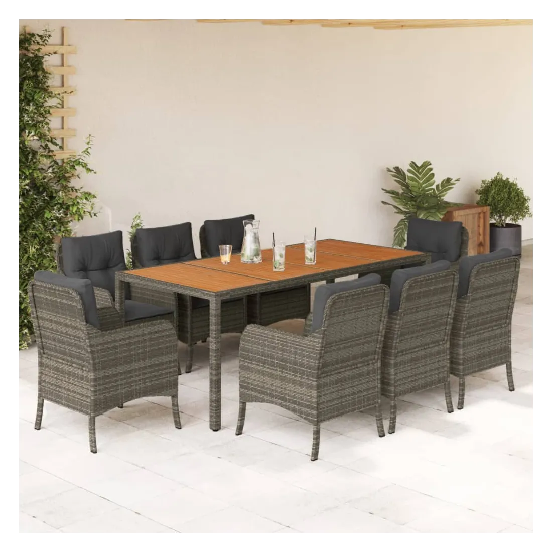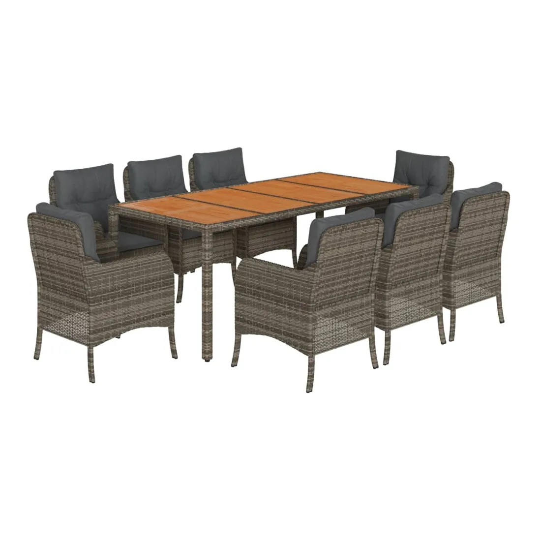Cet ensemble de salle à manger de jardin est un excellent choix pour les repas en plein air ou pour vous détendre dans le jardin, l'arrière-cour ou le patio. Matériau durable : la résine tressée, également connue sous le nom de poly rotin, est un matériau synthétique solide et nécessitant peu d'entretien qui ressemble au rotin naturel. Il est léger, facile à nettoyer et couramment utilisé pour les meubles d'extérieur en raison de sa durabilité et de ses propriétés de résistance aux intempéries.Expérience d'assise confortable : ce mobilier d'extérieur, doté de coussins épais, offre une expérience d'assise confortable.Housse amovible et lavable : ces coussins de siège sont dotés de housses amovibles pour un lavage et un entretien faciles. Les housses de coussin de chaise ont un rabat à l'arrière pour une fixation facile aux chaises.Dessus stable et facile à nettoyer : cette table de jardin a un dessus en bois d'acacia robuste, durable et facile à nettoyer avec un chiffon humide.Cadre robuste et stable : le cadre en acier enduit de poudre assure la solidité et la stabilité du meuble de jardin pour une utilisation quotidienne à l'extérieur. Bon à savoir :Pour que vos meubles d'extérieur restent beaux, nous vous recommandons de les protéger avec une housse imperméable.