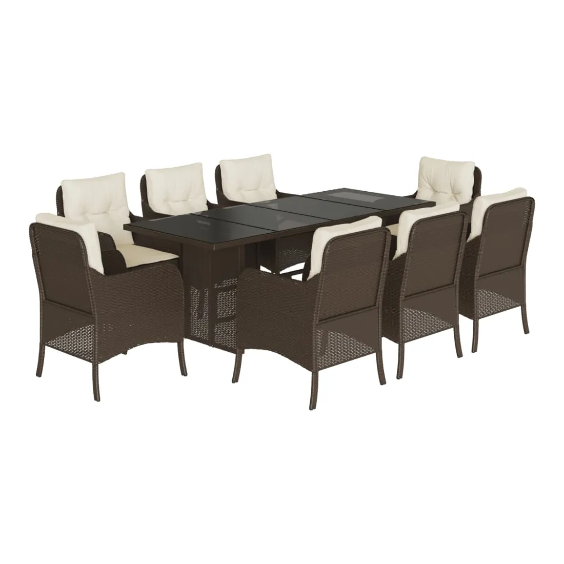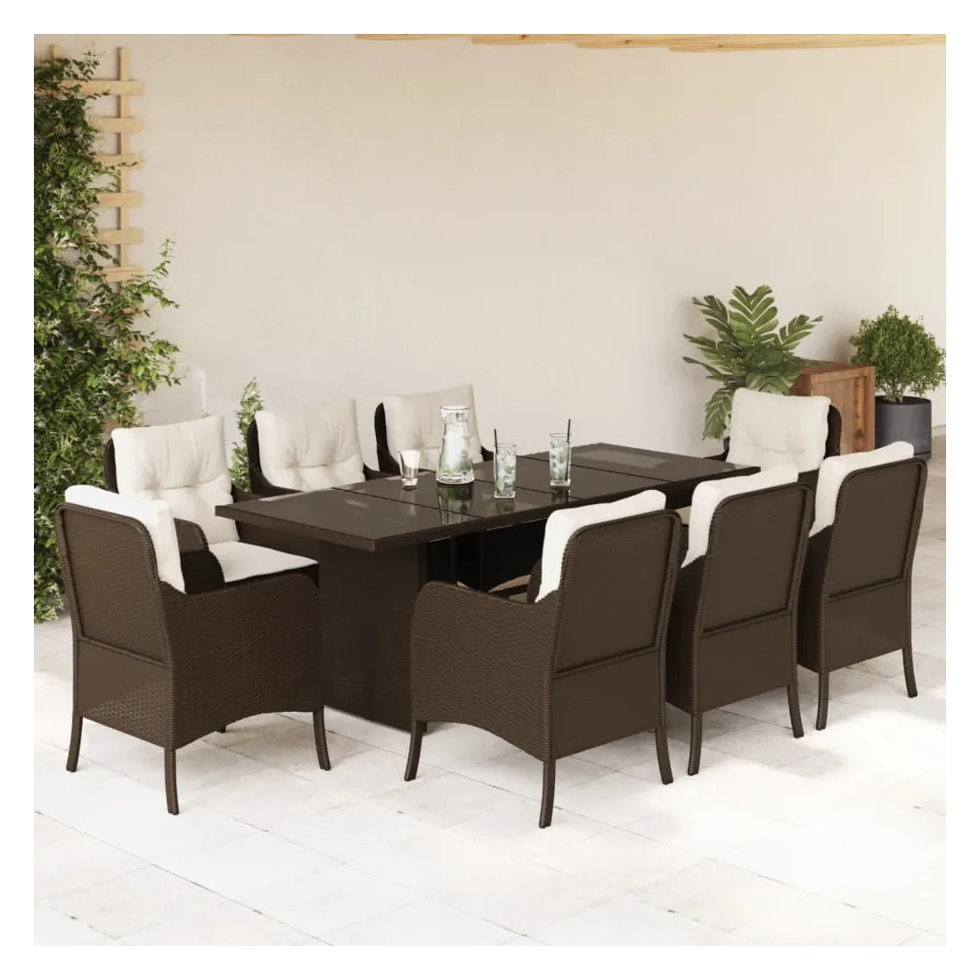 Cet ensemble de salle à manger de jardin est un excellent choix pour les repas en plein air ou pour vous détendre dans le jardin, dans l'arrière-cour ou sur la terrasse. Matériau durable : la résine tressée, également connue sous le nom de poly rotin, est un matériau synthétique solide et nécessitant peu d'entretien qui ressemble au rotin naturel. Il est léger, facile à nettoyer et couramment utilisé pour les meubles d'extérieur en raison de sa durabilité et de ses propriétés de résistance aux intempéries.Expérience d'assise confortable : ce mobilier d'extérieur, doté de coussins épais, offre une expérience d'assise confortable.Housse amovible et lavable : ces coussins de siège sont dotés de housses amovibles pour un lavage et un entretien faciles.Dessus en verre : le dessus de la table d'extérieur est fabriqué en verre trempé solide et durable, ce qui le rend facile à nettoyer avec un chiffon humide et ajoute une touche d'élégance à votre espace extérieur.Cadre robuste et stable : le cadre en acier enduit de poudre assure la solidité et la stabilité du meuble de jardin pour une utilisation quotidienne à l'extérieur. Bon à savoir :Pour que vos meubles d'extérieur restent beaux, nous vous recommandons de les protéger avec une housse imperméable.
