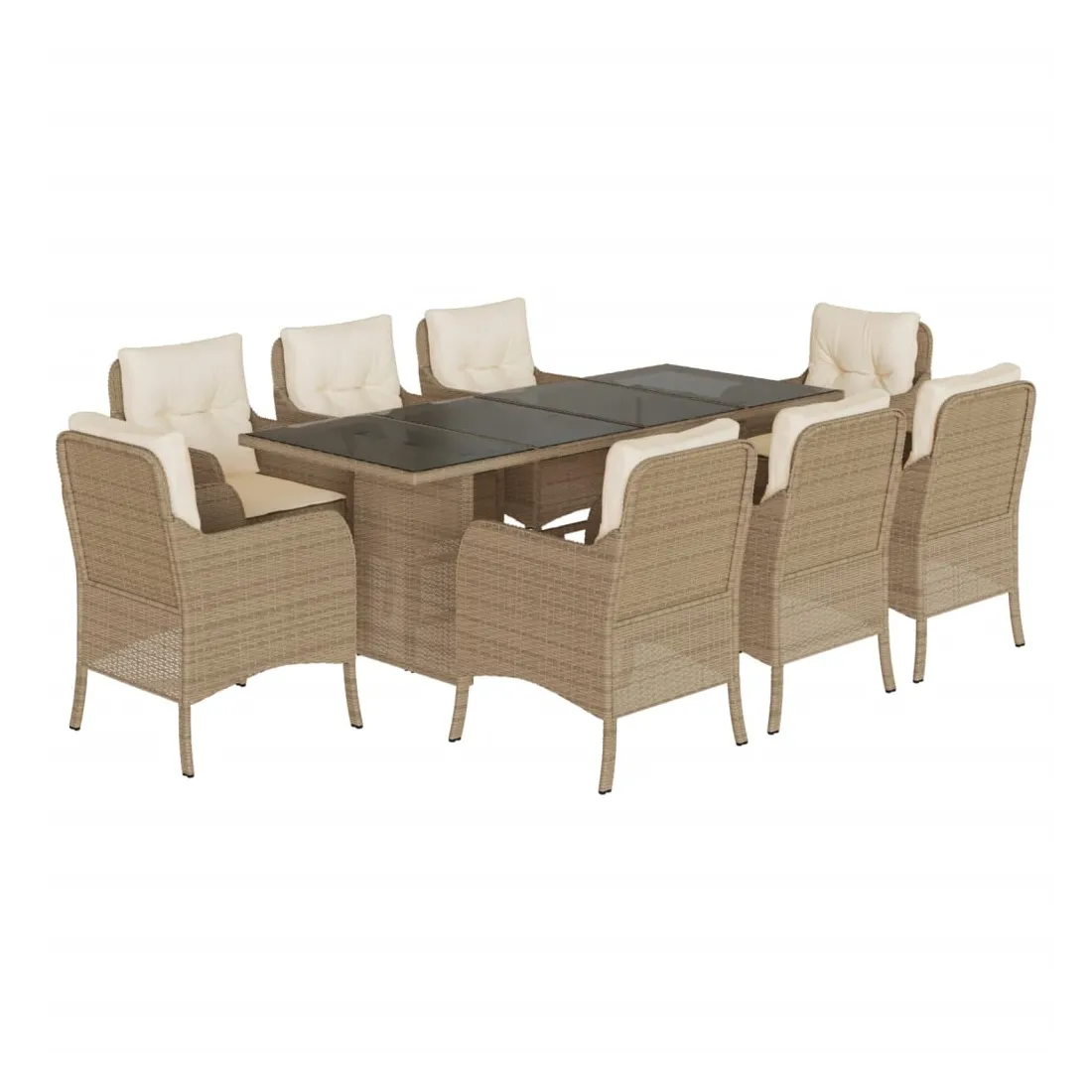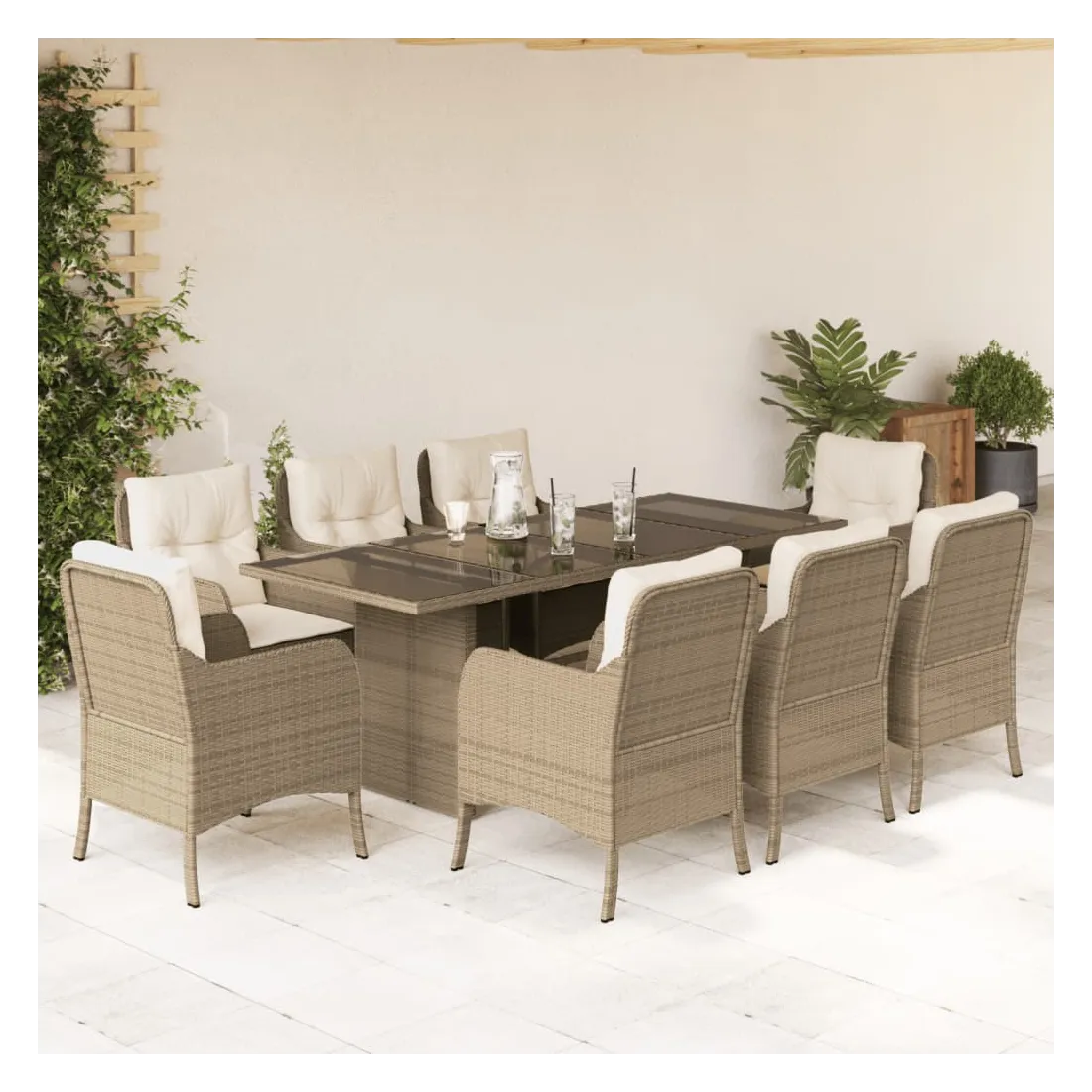 Cet ensemble de salle à manger de jardin est un excellent choix pour les repas en plein air ou pour vous détendre dans le jardin, dans l'arrière-cour ou sur la terrasse. Matériau durable : la résine tressée, également connue sous le nom de poly rotin, est un matériau synthétique solide et nécessitant peu d'entretien qui ressemble au rotin naturel. Il est léger, facile à nettoyer et couramment utilisé pour les meubles d'extérieur en raison de sa durabilité et de ses propriétés de résistance aux intempéries.Expérience d'assise confortable : ce mobilier d'extérieur, doté de coussins épais, offre une expérience d'assise confortable.Housse amovible et lavable : ces coussins de siège sont dotés de housses amovibles pour un lavage et un entretien faciles.Dessus en verre : le dessus de la table d'extérieur est fabriqué en verre trempé solide et durable, ce qui le rend facile à nettoyer avec un chiffon humide et ajoute une touche d'élégance à votre espace extérieur.Cadre robuste et stable : le cadre en acier enduit de poudre assure la solidité et la stabilité du meuble de jardin pour une utilisation quotidienne à l'extérieur. Bon à savoir :Pour que vos meubles d'extérieur restent beaux, nous vous recommandons de les protéger avec une housse imperméable.