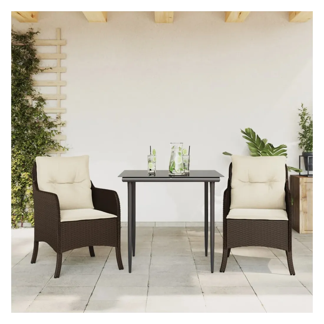 Cet ensemble de salle à manger de jardin est un excellent choix pour les repas en plein air ou pour vous détendre dans le jardin, l'arrière-cour ou le patio. Matériau durable : la résine tressée, également connue sous le nom de poly rotin, est un matériau synthétique solide et nécessitant peu d'entretien qui ressemble au rotin naturel. Il est léger, facile à nettoyer et couramment utilisé pour les meubles d'extérieur en raison de sa durabilité et de ses propriétés de résistance aux intempéries.Expérience d'assise confortable : ce mobilier d'extérieur, doté de coussins épais, offre une expérience d'assise confortable.Housse amovible et lavable : ces coussins de siège sont dotés de housses amovibles pour un lavage et un entretien faciles.Dessus en verre : le dessus de la table d'extérieur est fabriqué en verre trempé solide et durable, ce qui le rend facile à nettoyer avec un chiffon humide et ajoute une touche d'élégance à votre espace extérieur.Cadre robuste et stable : le cadre en acier enduit de poudre assure la solidité et la stabilité du meuble de jardin pour une utilisation quotidienne à l'extérieur. Bon à savoir :Pour que vos meubles d'extérieur restent beaux, nous vous recommandons de les protéger avec une housse imperméable.