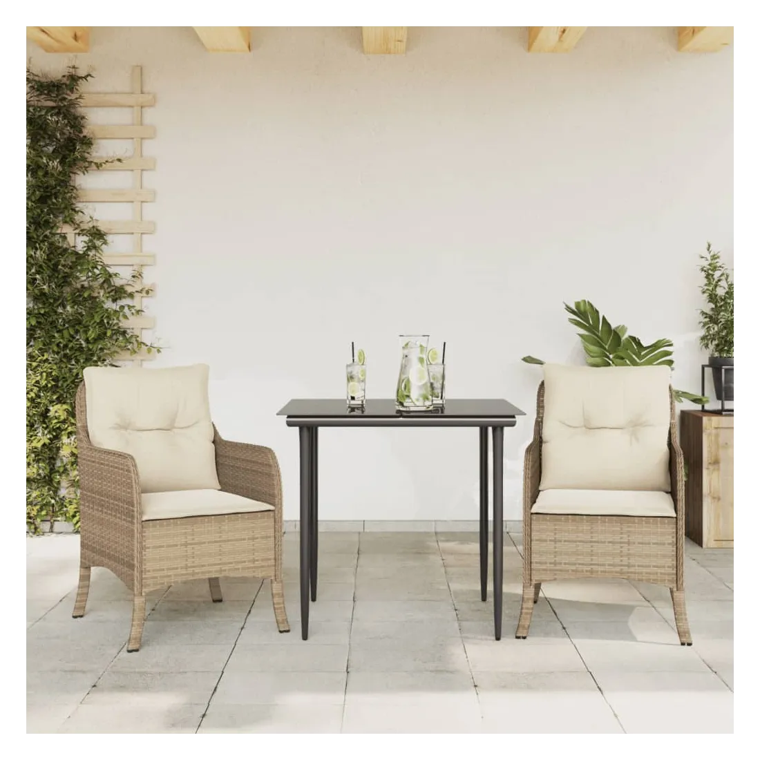 Cet ensemble de salle à manger de jardin est un excellent choix pour les repas en plein air ou pour vous détendre dans le jardin, l'arrière-cour ou le patio. Matériau durable : la résine tressée, également connue sous le nom de poly rotin, est un matériau synthétique solide et nécessitant peu d'entretien qui ressemble au rotin naturel. Il est léger, facile à nettoyer et couramment utilisé pour les meubles d'extérieur en raison de sa durabilité et de ses propriétés de résistance aux intempéries.Expérience d'assise confortable : ce mobilier d'extérieur, doté de coussins épais, offre une expérience d'assise confortable.Housse amovible et lavable : ces coussins de siège sont dotés de housses amovibles pour un lavage et un entretien faciles.Dessus en verre : le dessus de la table d'extérieur est fabriqué en verre trempé solide et durable, ce qui le rend facile à nettoyer avec un chiffon humide et ajoute une touche d'élégance à votre espace extérieur.Cadre robuste et stable : le cadre en acier enduit de poudre assure la solidité et la stabilité du meuble de jardin pour une utilisation quotidienne à l'extérieur. Bon à savoir :Pour que vos meubles d'extérieur restent beaux, nous vous recommandons de les protéger avec une housse imperméable.