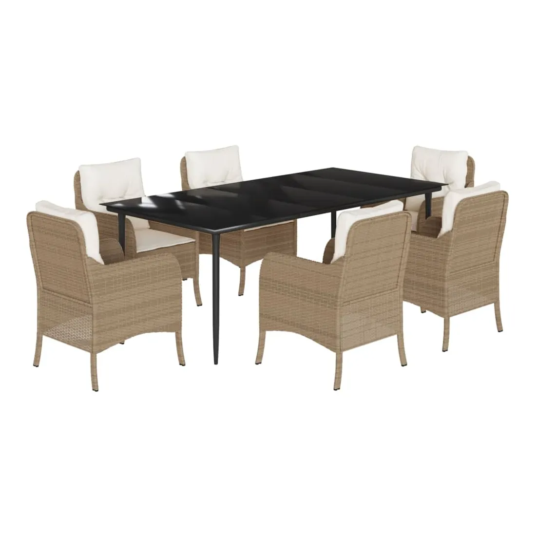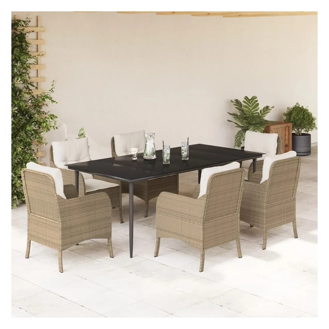 Cet ensemble de salle à manger de jardin est un excellent choix pour les repas en plein air ou pour vous détendre dans le jardin, l'arrière-cour ou le patio. Matériau durable : la résine tressée, également connue sous le nom de poly rotin, est un matériau synthétique solide et nécessitant peu d'entretien qui ressemble au rotin naturel. Il est léger, facile à nettoyer et couramment utilisé pour les meubles d'extérieur en raison de sa durabilité et de ses propriétés de résistance aux intempéries.Expérience d'assise confortable : ce mobilier d'extérieur, doté de coussins épais, offre une expérience d'assise confortable.Housse amovible et lavable : ces coussins de siège sont dotés de housses amovibles pour un lavage et un entretien faciles.Dessus en verre : le dessus de la table d'extérieur est fabriqué en verre trempé solide et durable, ce qui le rend facile à nettoyer avec un chiffon humide et ajoute une touche d'élégance à votre espace extérieur.Cadre robuste et stable : le cadre en acier enduit de poudre assure la solidité et la stabilité du meuble de jardin pour une utilisation quotidienne à l'extérieur. Bon à savoir :Pour que vos meubles d'extérieur restent beaux, nous vous recommandons de les protéger avec une housse imperméable.