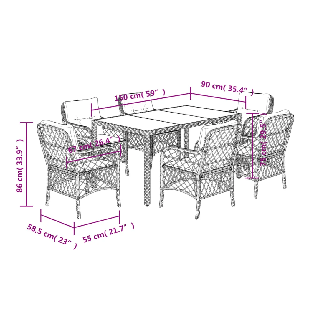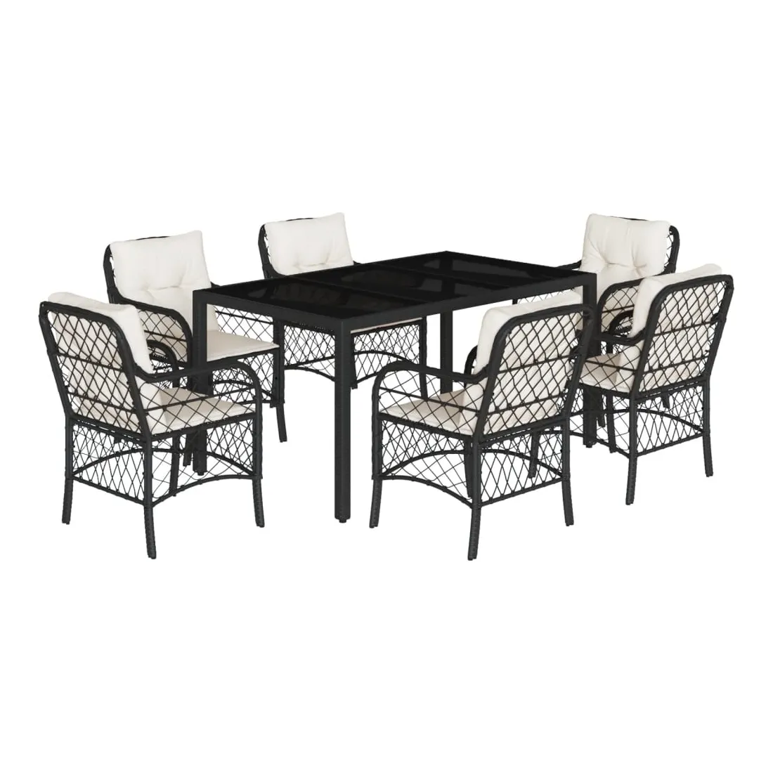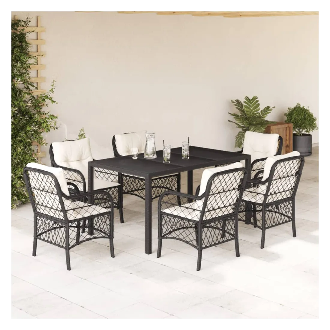 Cet ensemble de salle à manger de jardin est un excellent choix pour les repas en plein air ou pour vous détendre dans le jardin, l'arrière-cour ou le patio. Matériau durable : la résine tressée, également connue sous le nom de poly rotin, est un matériau synthétique solide et nécessitant peu d'entretien qui ressemble au rotin naturel. Il est léger, facile à nettoyer et couramment utilisé pour les meubles d'extérieur en raison de sa durabilité et de ses propriétés de résistance aux intempéries.Expérience d'assise confortable : ce mobilier d'extérieur, doté de coussins épais, offre une expérience d'assise confortable.Housse amovible et lavable : ces coussins de siège sont dotés de housses amovibles pour un lavage et un entretien faciles.Dessus en verre : le dessus de la table d'extérieur est fabriqué en verre trempé solide et durable, ce qui le rend facile à nettoyer avec un chiffon humide et ajoute une touche d'élégance à votre espace extérieur.Cadre robuste et stable : le cadre en acier enduit de poudre assure la solidité et la stabilité du meuble de jardin pour une utilisation quotidienne à l'extérieur. Bon à savoir :Pour que vos meubles d'extérieur restent beaux, nous vous recommandons de les protéger avec une housse imperméable.