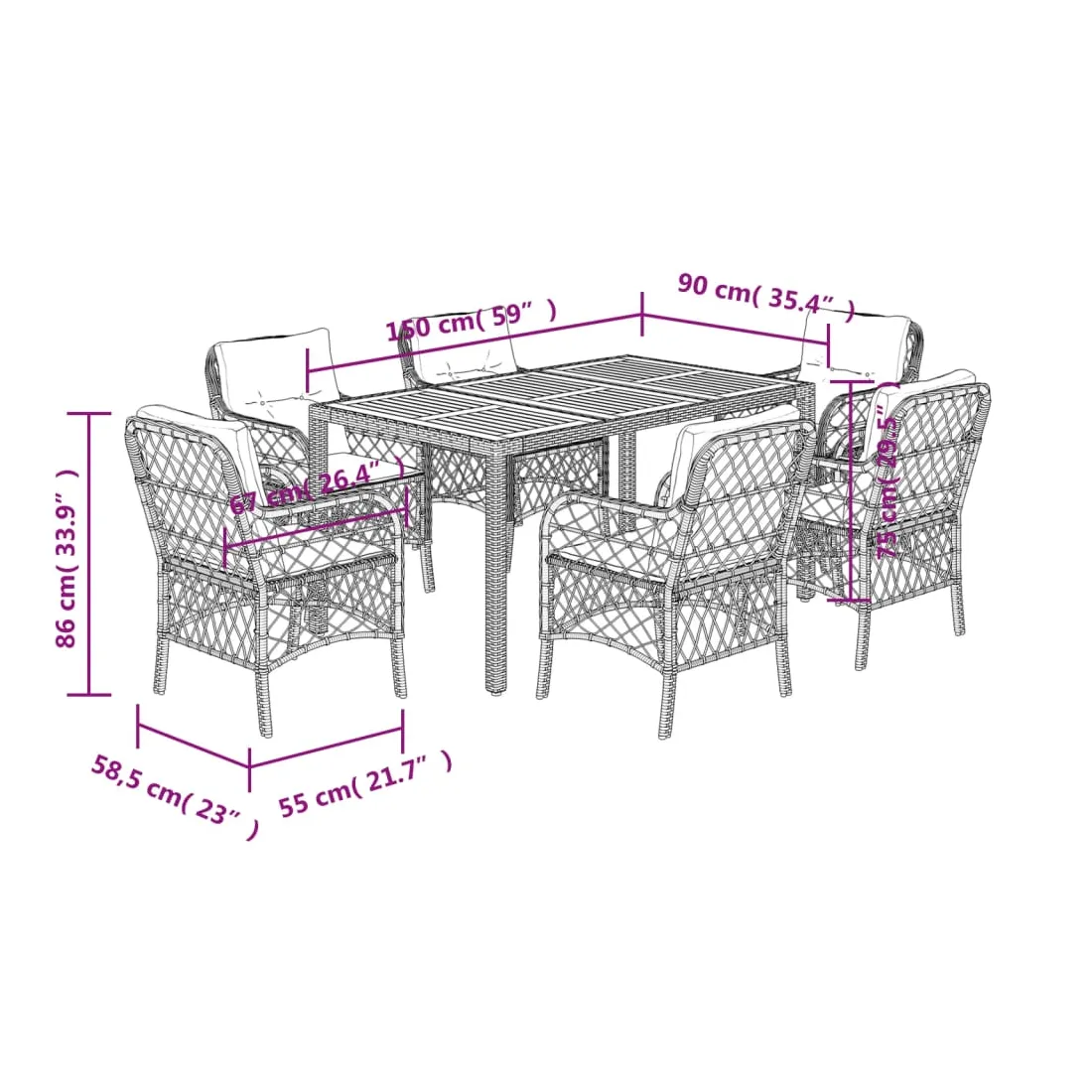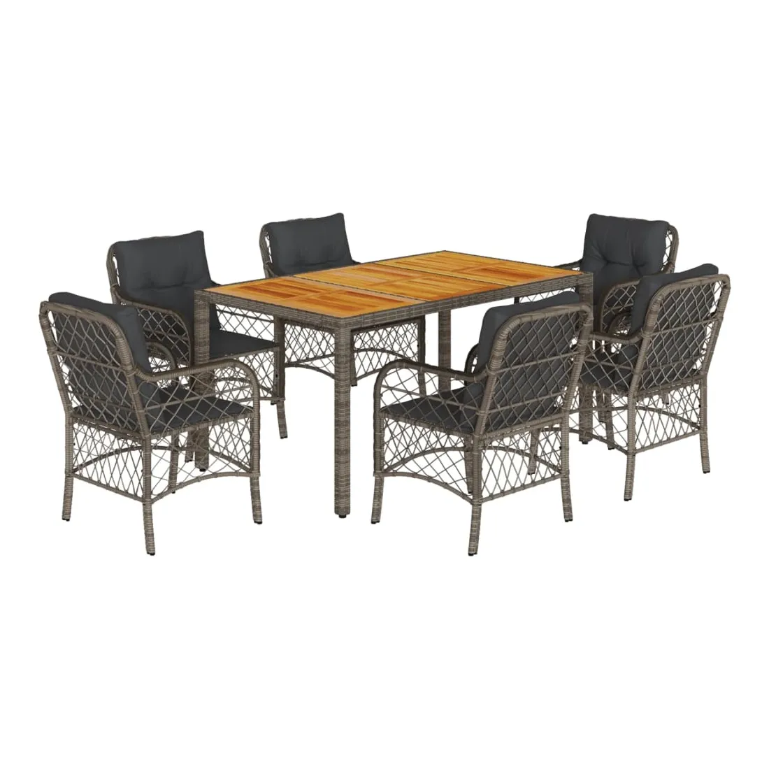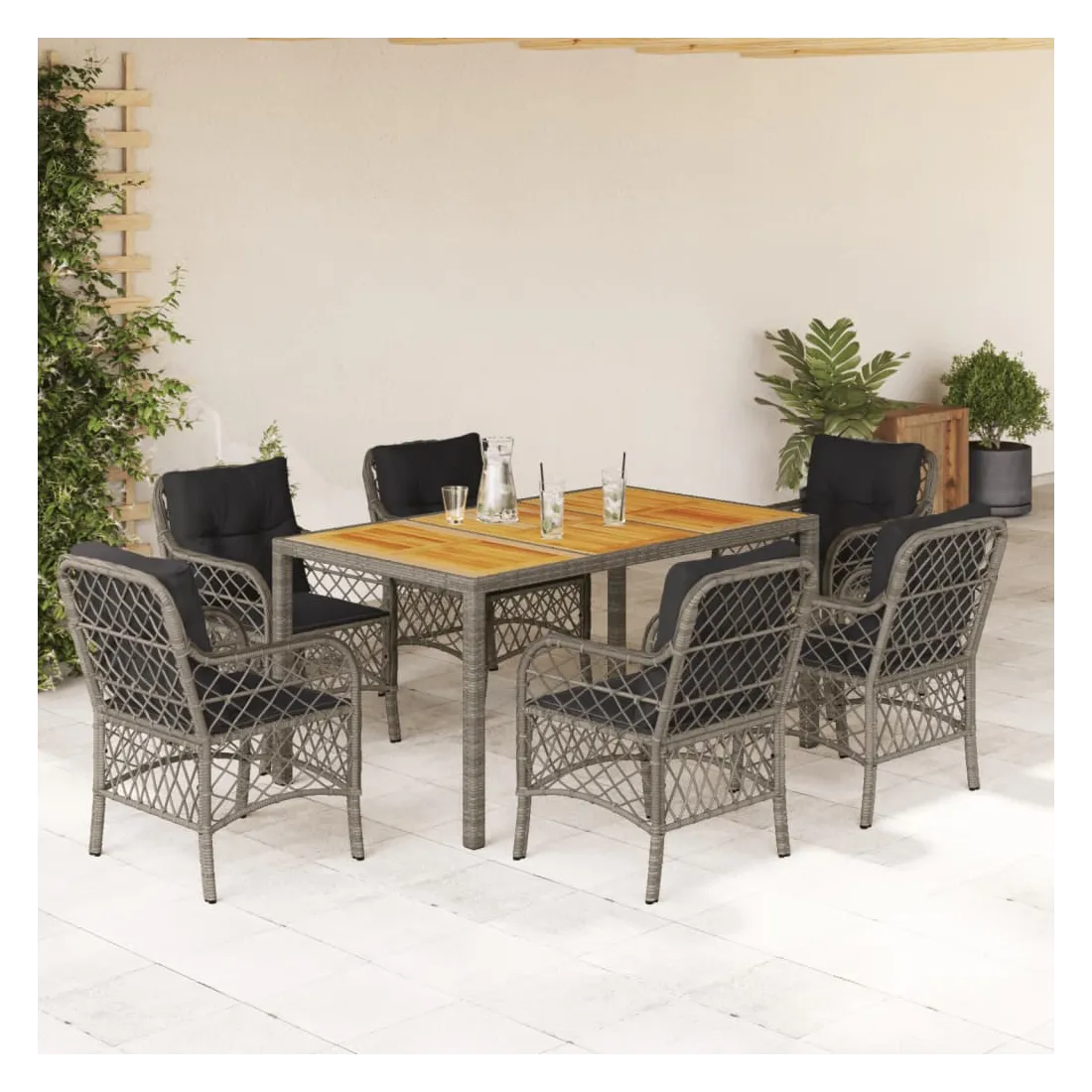 Cet ensemble de salle à manger de jardin est un excellent choix pour les repas en plein air ou pour vous détendre dans le jardin, l'arrière-cour ou le patio. Matériau durable : la résine tressée, également connue sous le nom de poly rotin, est un matériau synthétique solide et nécessitant peu d'entretien qui ressemble au rotin naturel. Il est léger, facile à nettoyer et couramment utilisé pour les meubles d'extérieur en raison de sa durabilité et de ses propriétés de résistance aux intempéries.Expérience d'assise confortable : ce mobilier d'extérieur, doté de coussins épais, offre une expérience d'assise confortable.Housse amovible et lavable : ces coussins de siège sont dotés de housses amovibles pour un lavage et un entretien faciles. Dessus stable et facile à nettoyer : cette table de jardin a un dessus en bois d'acacia robuste, durable et facile à nettoyer avec un chiffon humide.Cadre robuste et stable : le cadre en acier enduit de poudre assure la solidité et la stabilité du meuble de jardin pour une utilisation quotidienne à l'extérieur. Bon à savoir :Pour que vos meubles d'extérieur restent beaux, nous vous recommandons de les protéger avec une housse imperméable.