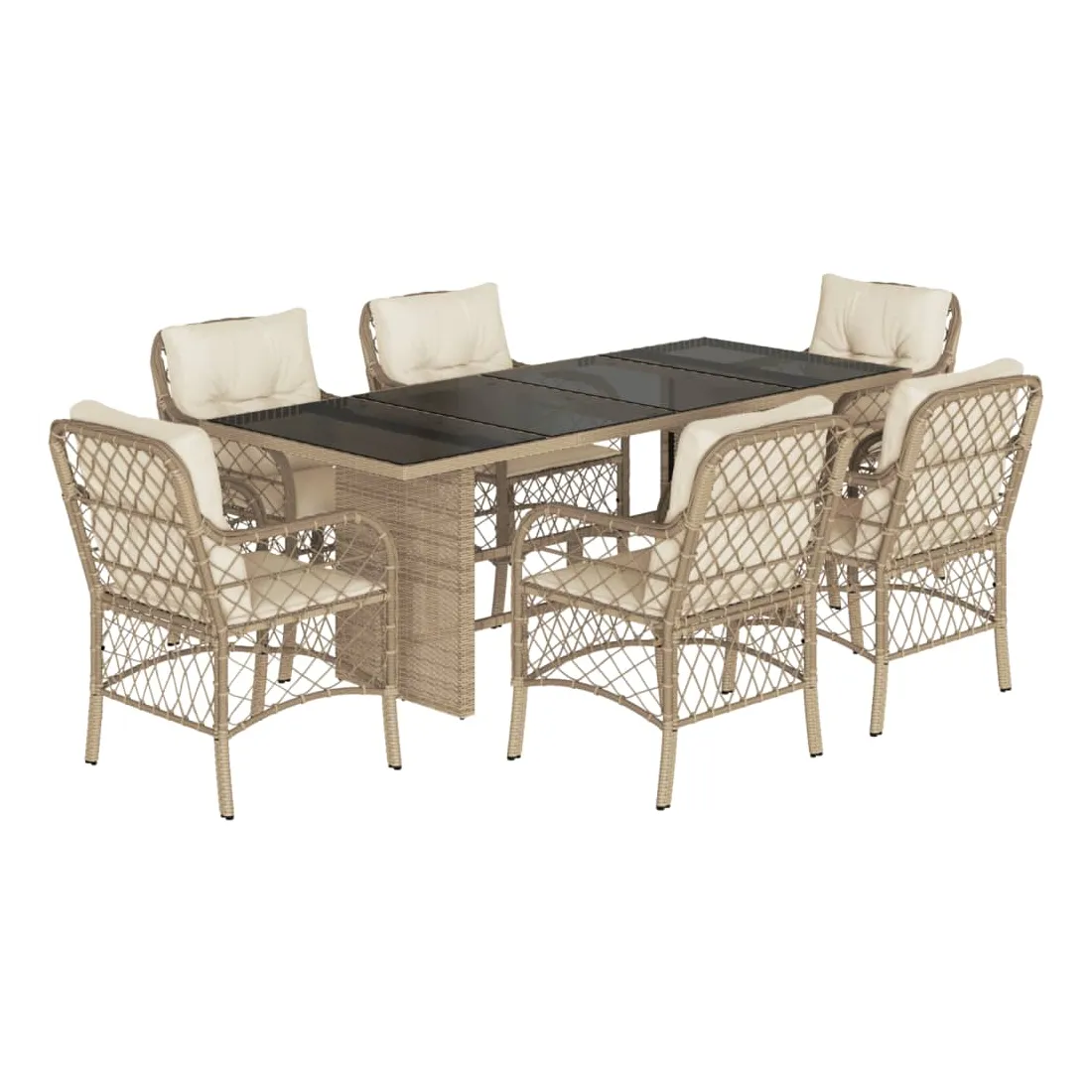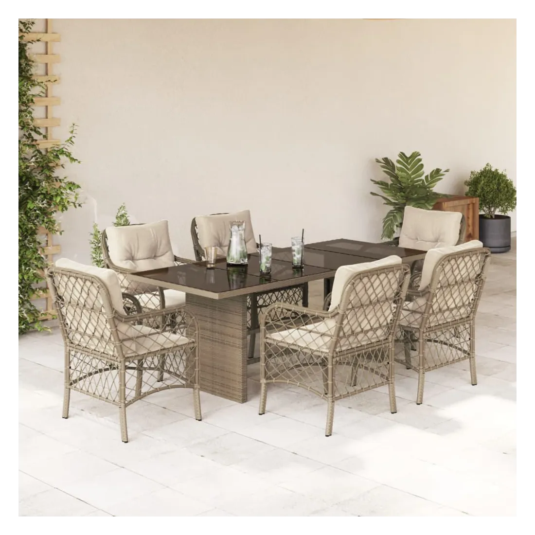 Cet ensemble de salle à manger de jardin est un excellent choix pour les repas en plein air ou pour vous détendre dans le jardin, l'arrière-cour ou le patio. Matériau durable : la résine tressée, également connue sous le nom de poly rotin, est un matériau synthétique solide et nécessitant peu d'entretien qui ressemble au rotin naturel. Il est léger, facile à nettoyer et couramment utilisé pour les meubles d'extérieur en raison de sa durabilité et de ses propriétés de résistance aux intempéries.Expérience d'assise confortable : ce mobilier d'extérieur, doté de coussins épais, offre une expérience d'assise confortable.Housse amovible et lavable : ces coussins de siège sont dotés de housses amovibles pour un lavage et un entretien faciles.Dessus en verre : le dessus de la table d'extérieur est fabriqué en verre trempé solide et durable, ce qui le rend facile à nettoyer avec un chiffon humide et ajoute une touche d'élégance à votre espace extérieur.Cadre robuste et stable : le cadre en acier enduit de poudre assure la solidité et la stabilité du meuble de jardin pour une utilisation quotidienne à l'extérieur. Bon à savoir :Pour que vos meubles d'extérieur restent beaux, nous vous recommandons de les protéger avec une housse imperméable.