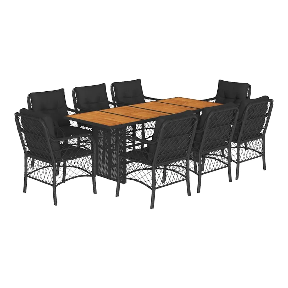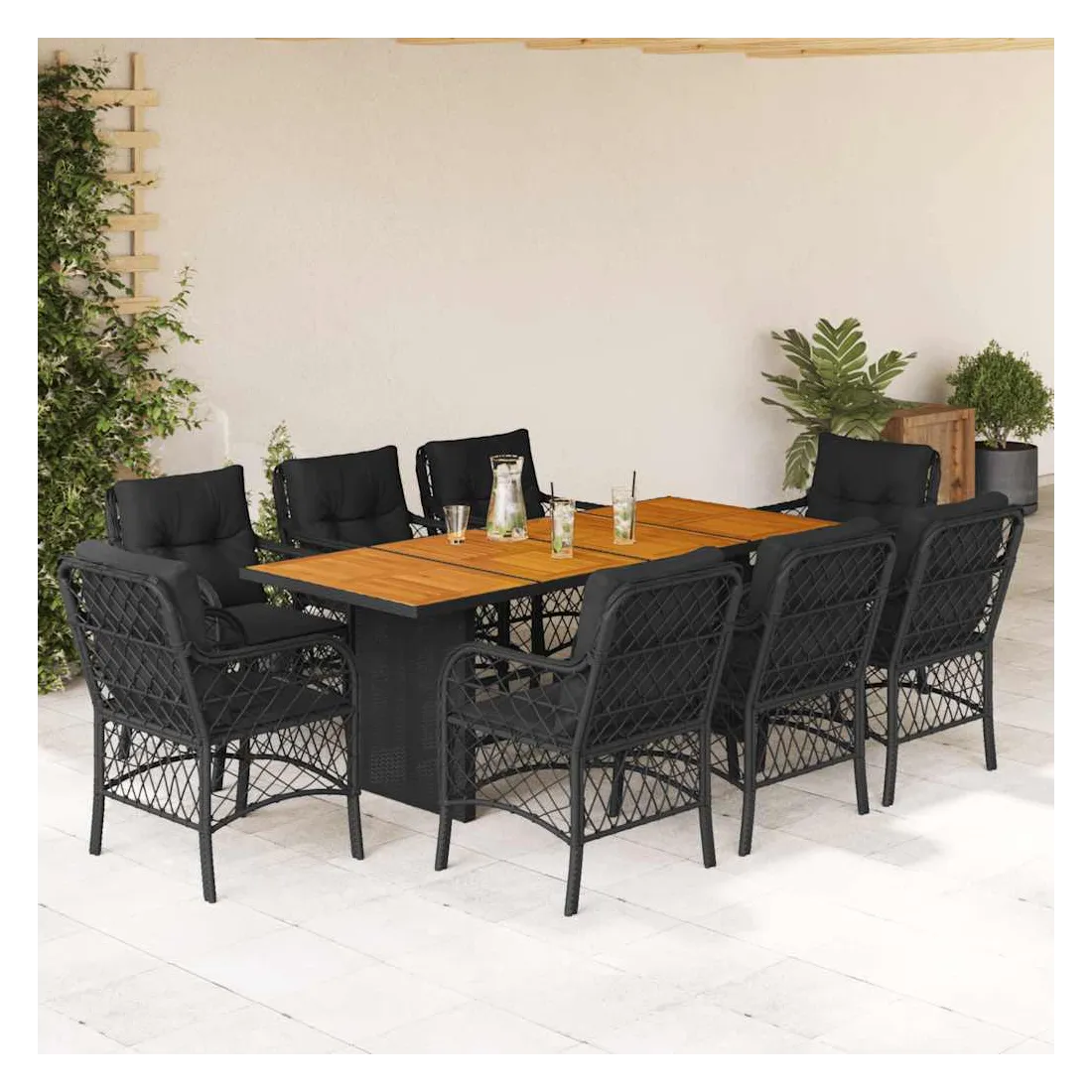 Cet ensemble de salle à manger de jardin est un excellent choix pour les repas en plein air ou pour vous détendre dans le jardin, l'arrière-cour ou le patio. Matériau durable : la résine tressée, également connue sous le nom de poly rotin, est un matériau synthétique solide et nécessitant peu d'entretien qui ressemble au rotin naturel. Il est léger, facile à nettoyer et couramment utilisé pour les meubles d'extérieur en raison de sa durabilité et de ses propriétés de résistance aux intempéries.Expérience d'assise confortable : ce mobilier d'extérieur, doté de coussins épais, offre une expérience d'assise confortable.Housse amovible et lavable : ces coussins de siège sont dotés de housses amovibles pour un lavage et un entretien faciles. Dessus stable et facile à nettoyer : cette table de jardin a un dessus en bois d'acacia robuste, durable et facile à nettoyer avec un chiffon humide.Cadre robuste et stable : le cadre en acier enduit de poudre assure la solidité et la stabilité du meuble de jardin pour une utilisation quotidienne à l'extérieur. Bon à savoir :Pour que vos meubles d'extérieur restent beaux, nous vous recommandons de les protéger avec une housse imperméable.